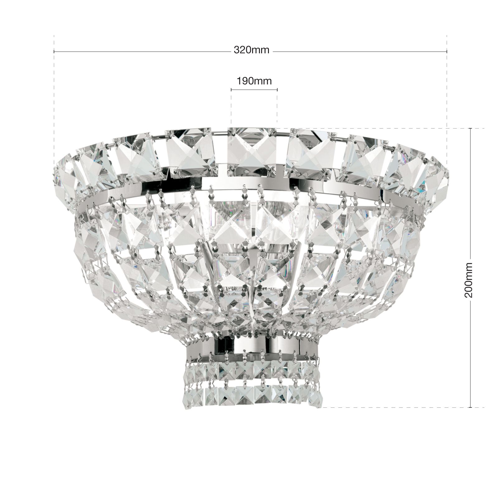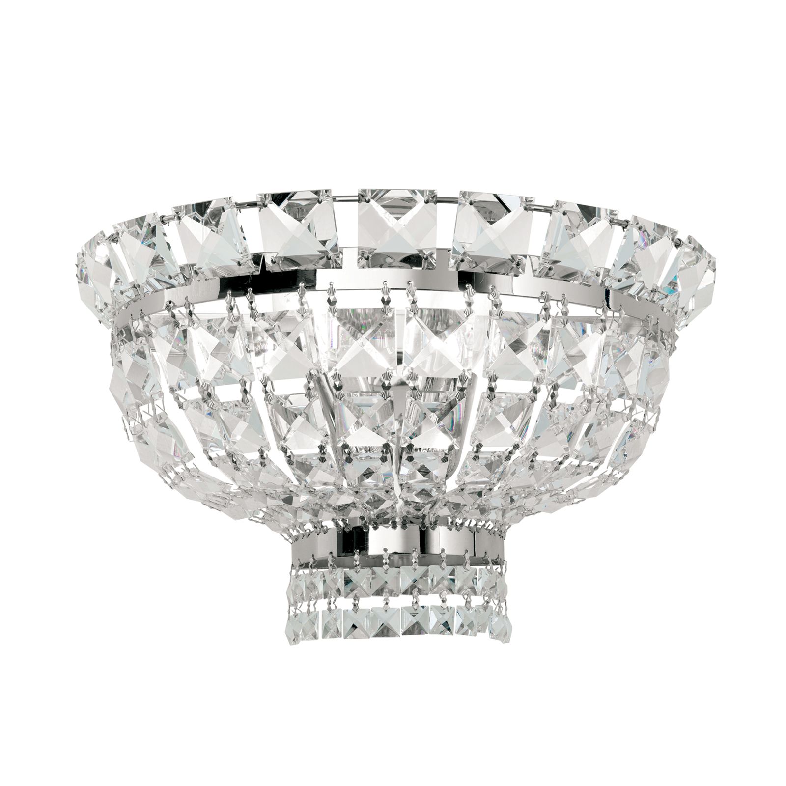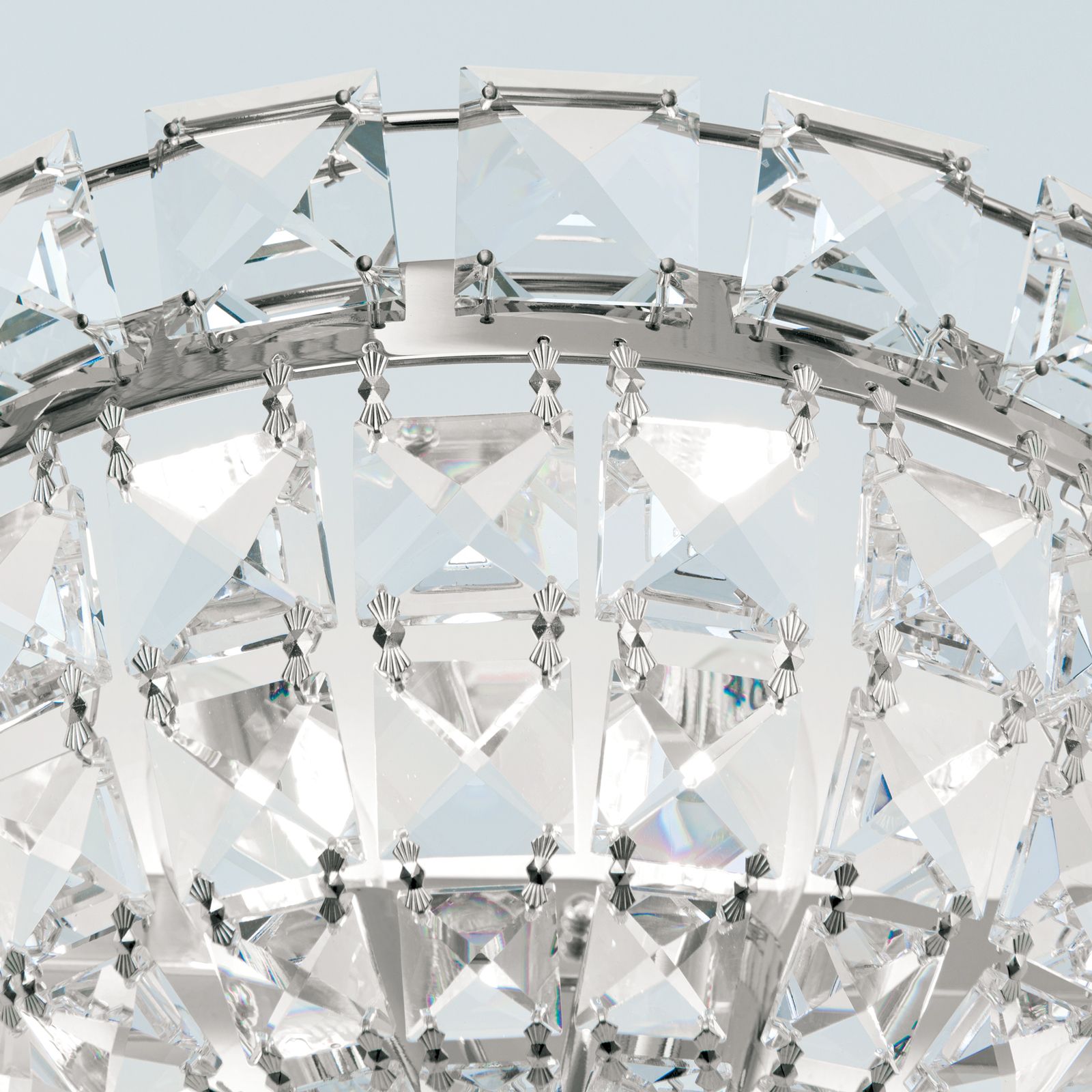 Consisting of two delicate chrome-plated solid brass parts and square cut crystals forming chains, the light is very elegantly designed. When switched on, it reveals an enchanting light play enhanced by the shiny chrome finish.
