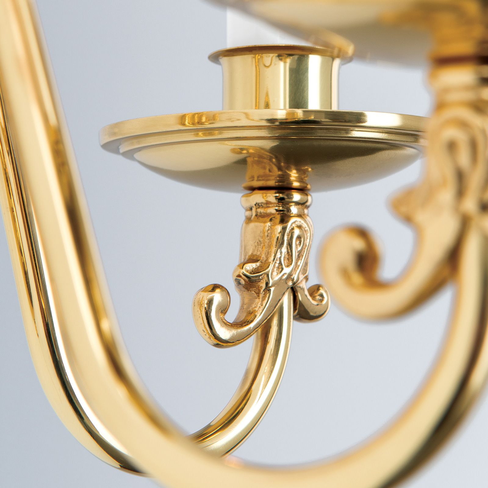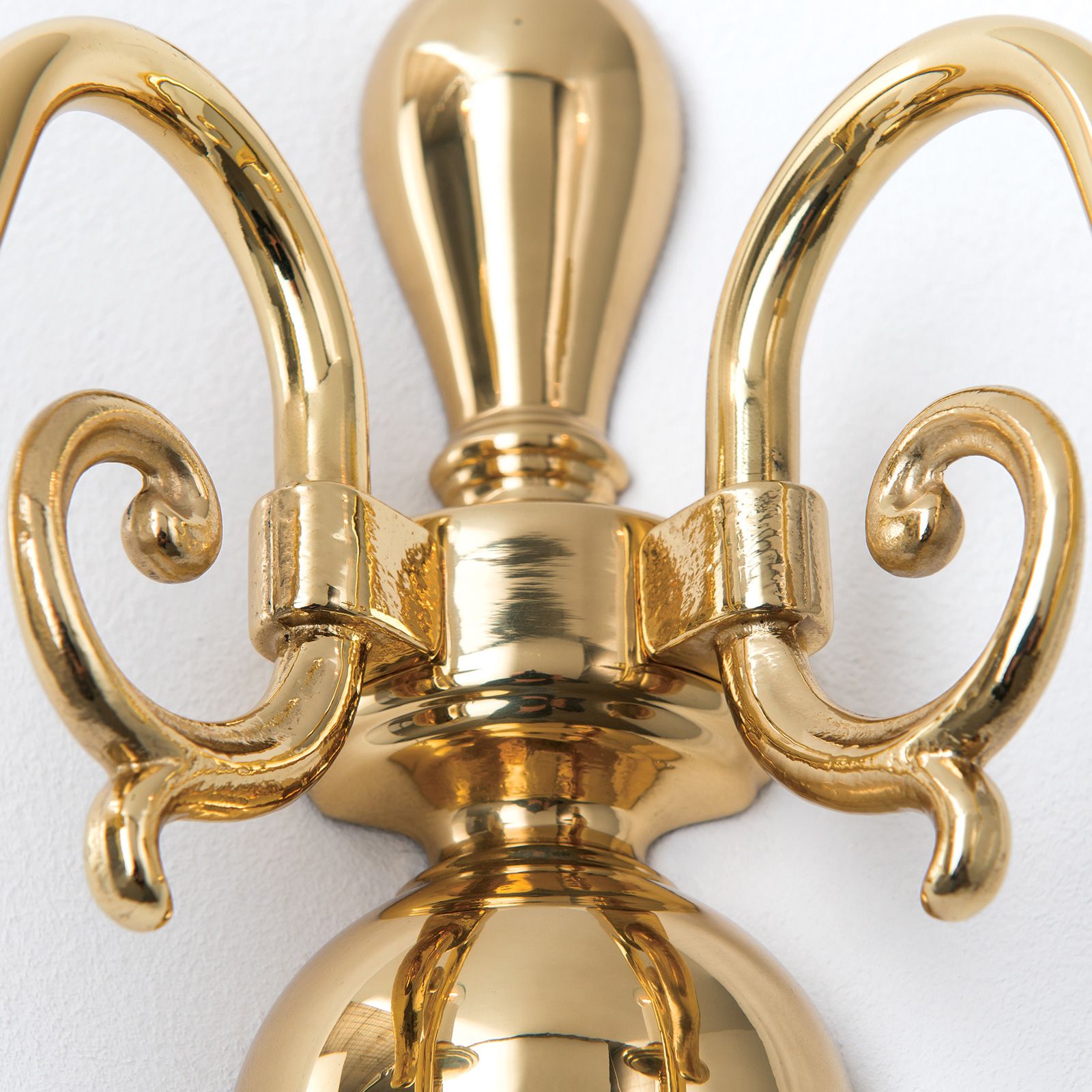Chandelier arms swing in classical S-bows towards the centre on the wall frame. The stems spherical, baluster shape flows into a ring parallel that of the regular ceiling fixture. The brass shine reflects the light many times in its arches, bulges, bowls and rings to illuminate a cosy corner, a soft sofa or stylish piece of furniture with a warm beam. Two E14 sockets provide up to 40 watts each.