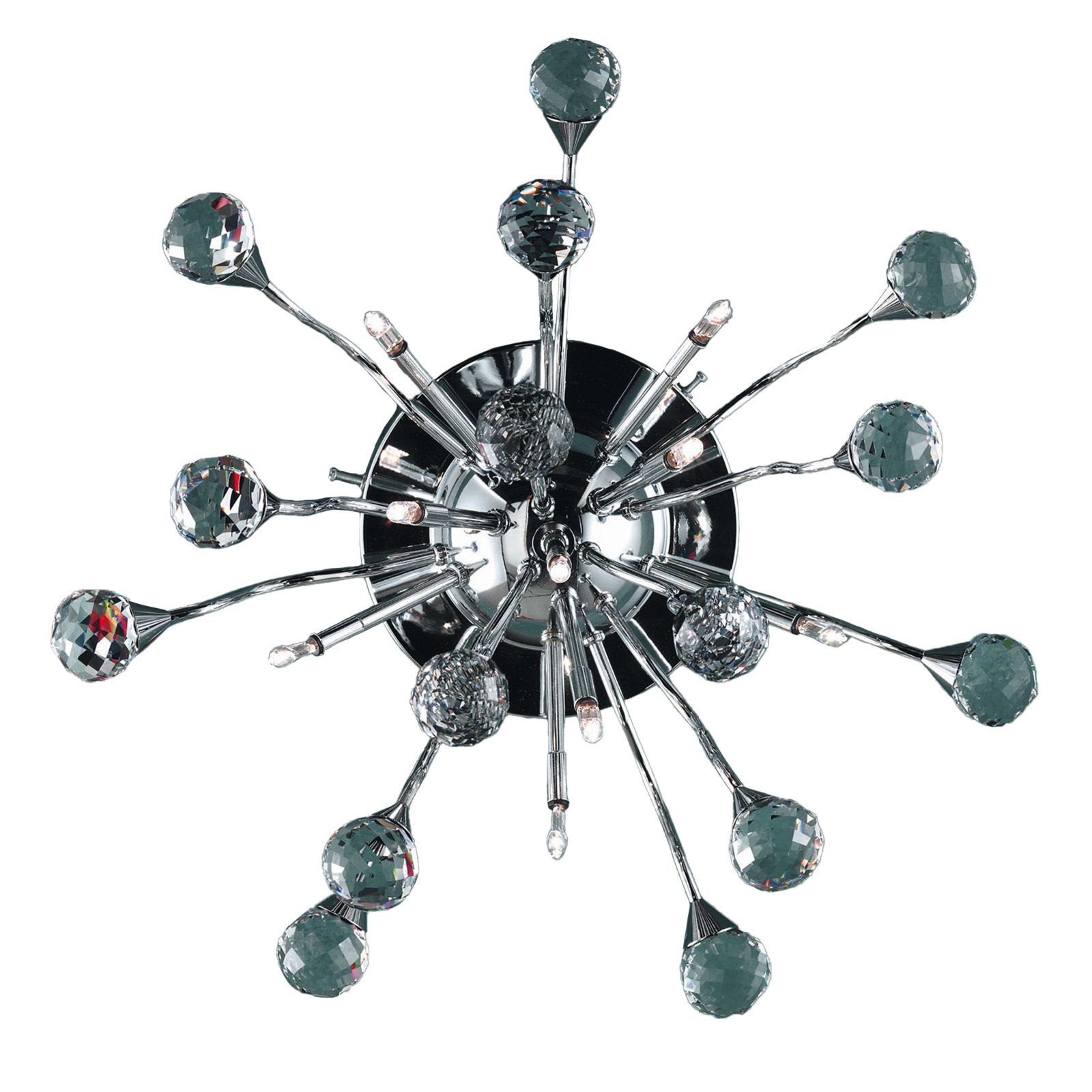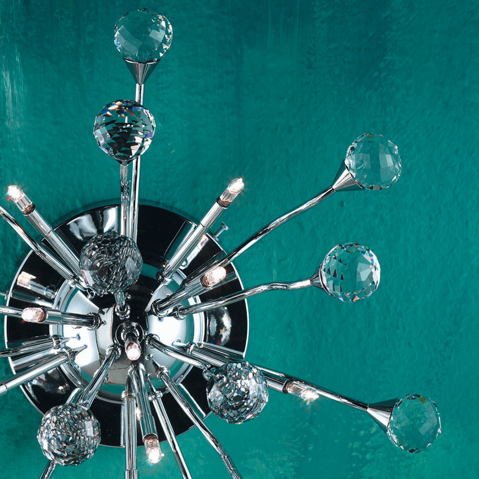 Wall light GALAXY brings outer space into any living room. The spectacular eponymous series in the tradition of Space Age design, not only impresses with its unique design, but also with its high-quality workmanship. Chrome finish refines the brass lamp body combined with clear crystals from Swarovski. The wall light with a diameter of 42 centimetres is equipped with 9 G4 sockets that can be fitted with 10 watts maximum per socket and dimmed with a phase-cut dimmer. It serves well as accent lighting in living rooms or entrance halls, where it radiates its light in different directions. The necessary illuminants are already included in the scope of delivery.