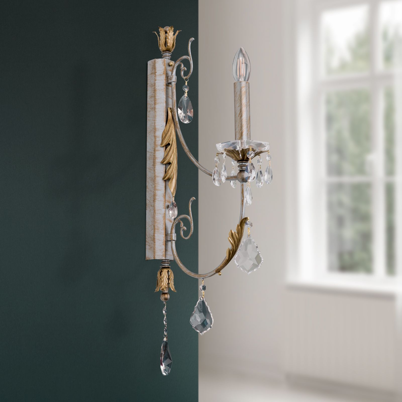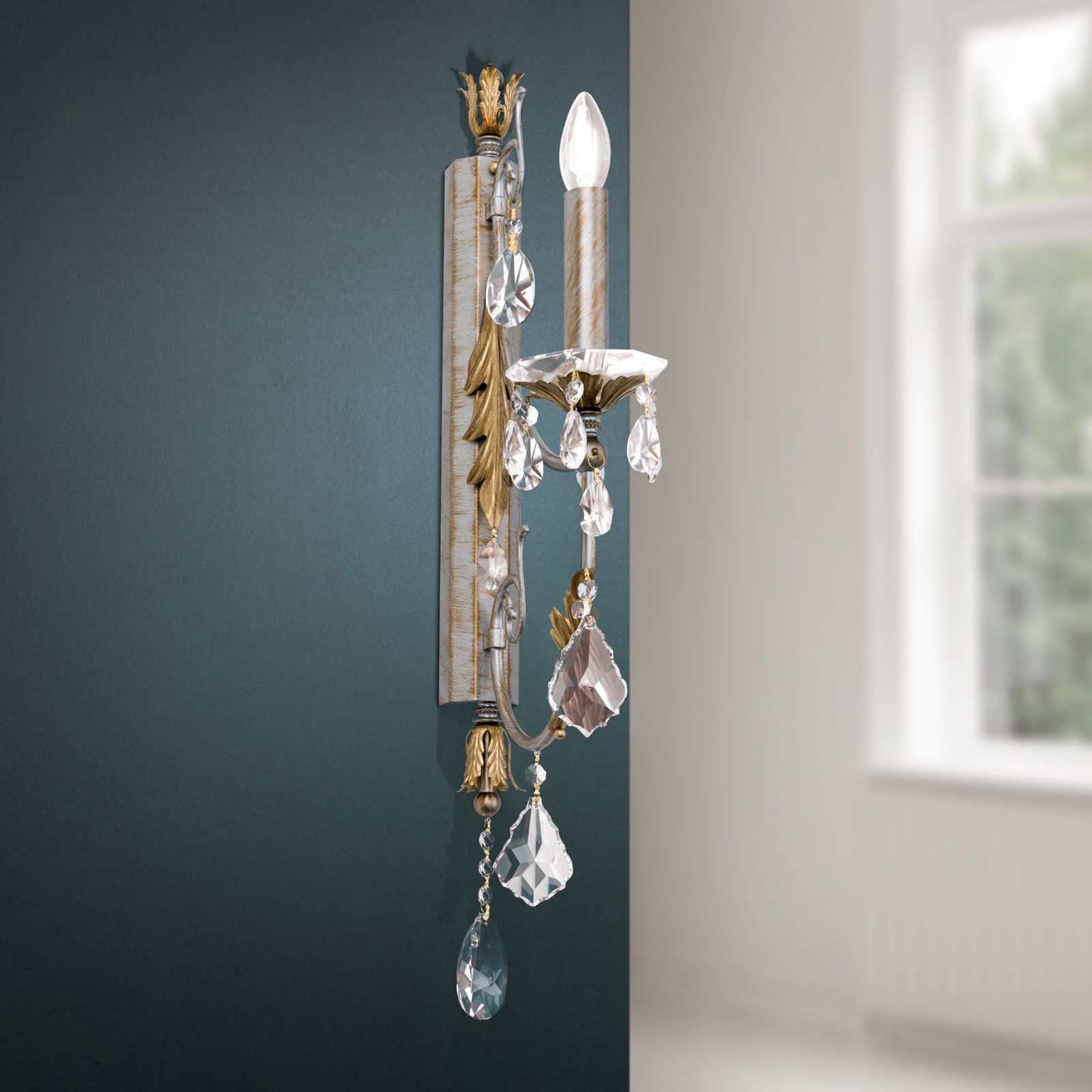 The MIRAMARE collection is dedicated to the timeless themes of the promise of the sea and endless horizons. The 1-lamp wall light of this series conveys many of these inspiring impressions through its romantic design. A restrained chandelier crystal, delicate foliage and an elegant, slightly baroque-looking arm enchant every observer. The use of first-class materials such as solid brass and crystal from Austrian production enriches every room. In a living room with ancient furniture, the light is gently diffused, creating a cosy atmosphere. This wall light is equipped with an E14 Lamp holder.