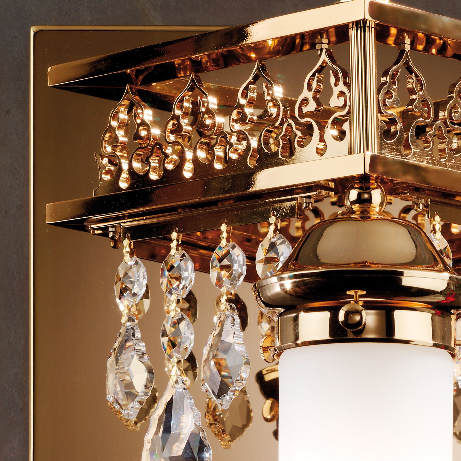 The ORIONtal series invites observers on a journey into the world oriental artisan design traditons. The 1-flame wall light is a particularly interesting example from this series. The glass shade is mounted on a rectangle edge - thus the light is ideally mounted in a corner or even in several corners of a room. This will give any room an unexpected depth as all light will seem to flow towards the centre. The luminaire head's elaborate gold-plated ornaments shine competitively with the crystals from "Schöler Crystal". Whether installed in a sacred devotional space, a contemplative living room corner or as oriental welcome in an anteroom: this light will create equal rapture everywhere. The wall light has an E27 socket for 60 watts maximum.