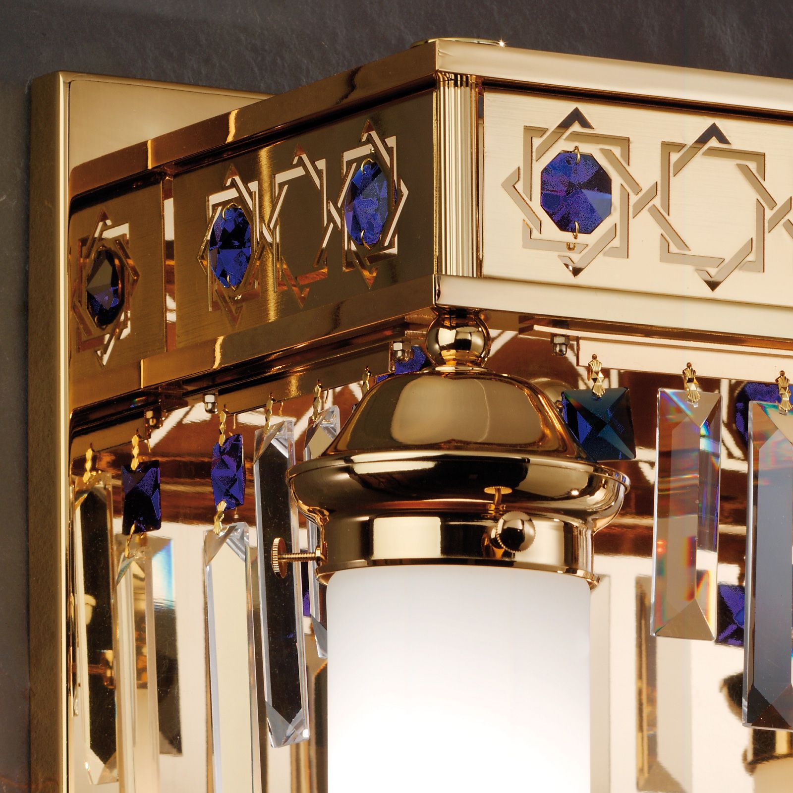 Wall light ORIONtal, 2-flames, gold, with blue crystal prisms