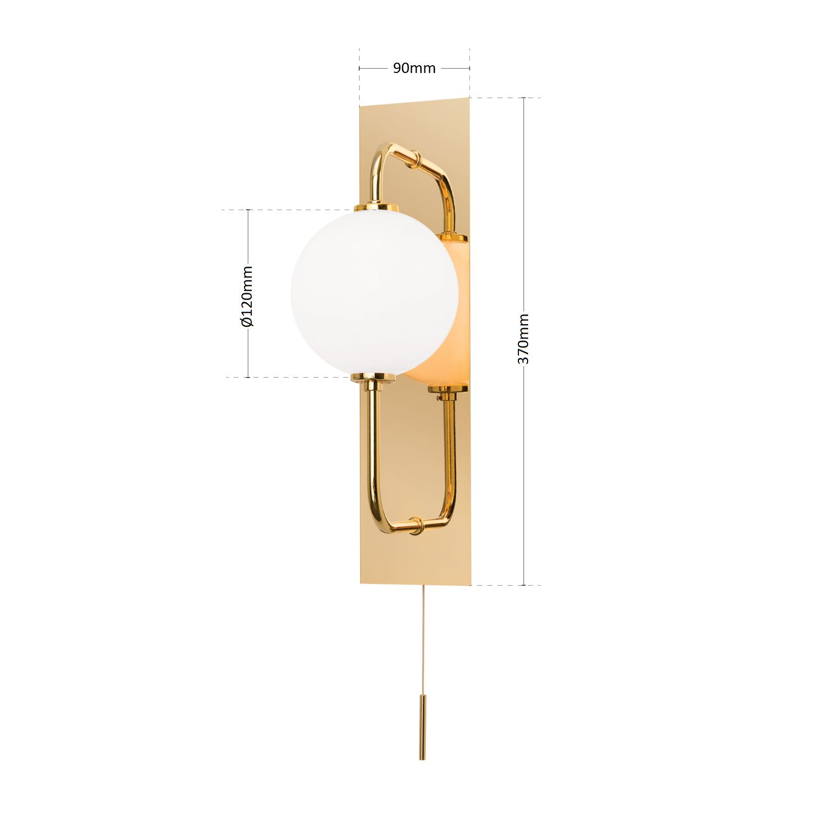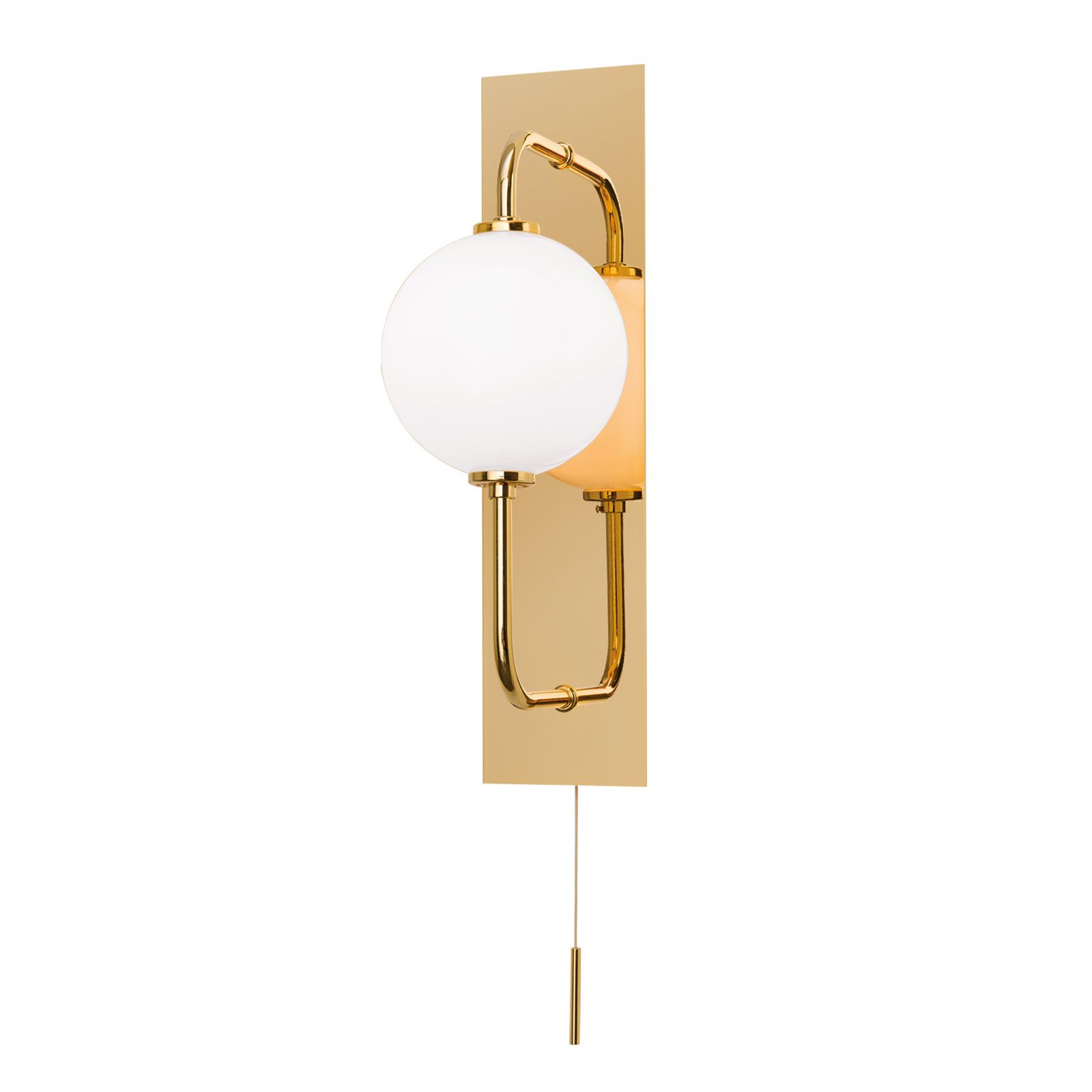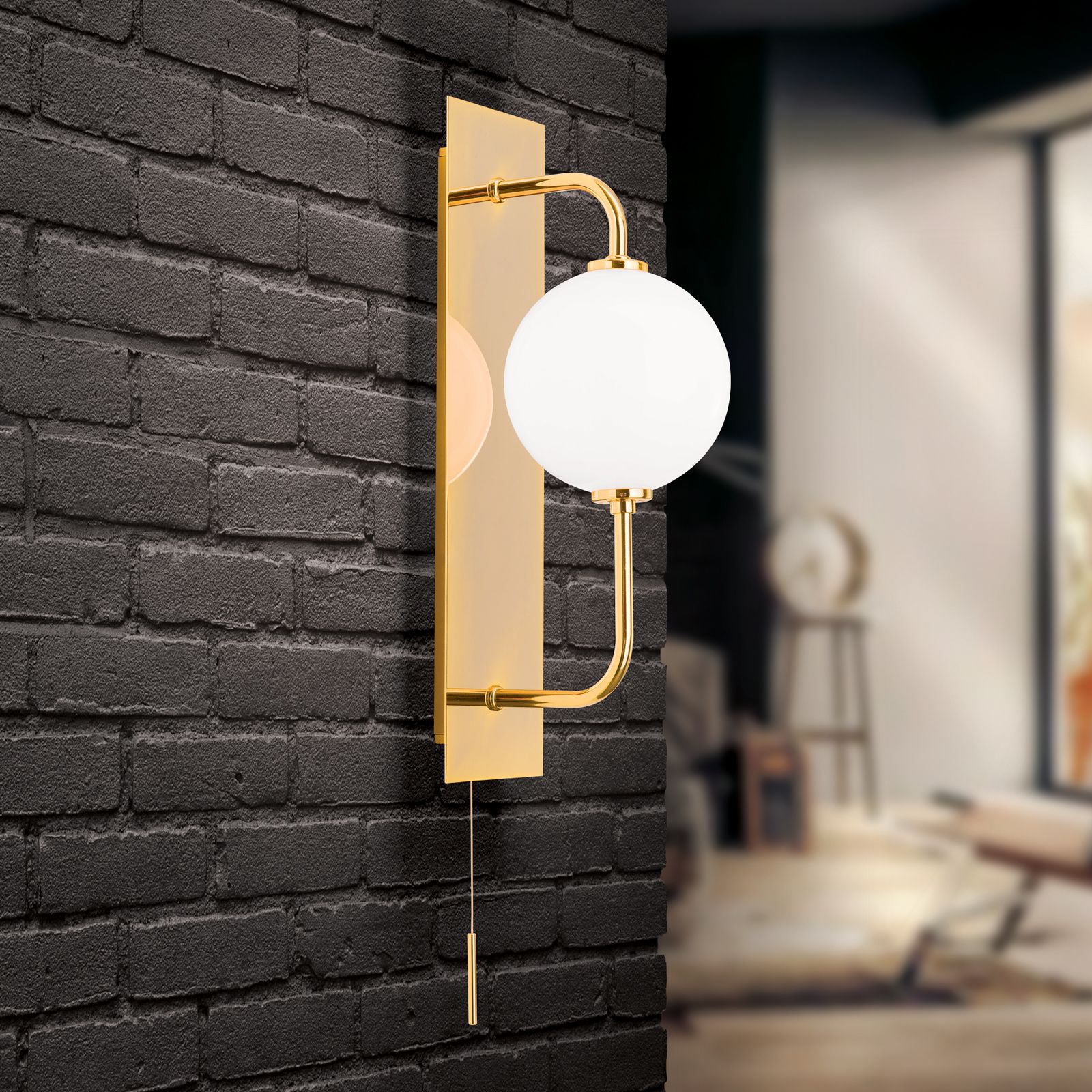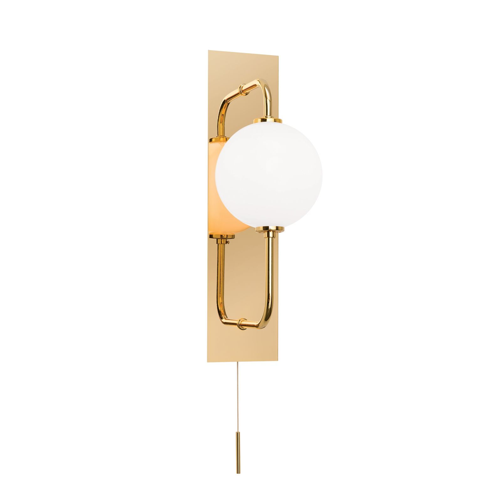 The wall light's spherical opal glass shade radiates light evenly and glare-free in all directions and is equipped with 1 G9 socket for 25 watts maximum. It can be operated directly by an elegant pull switch.