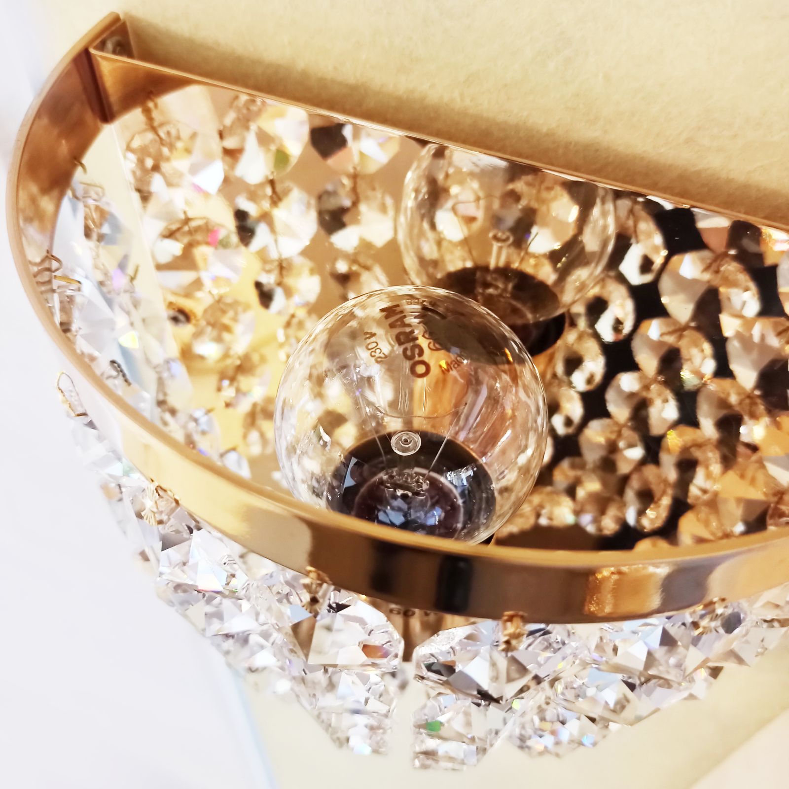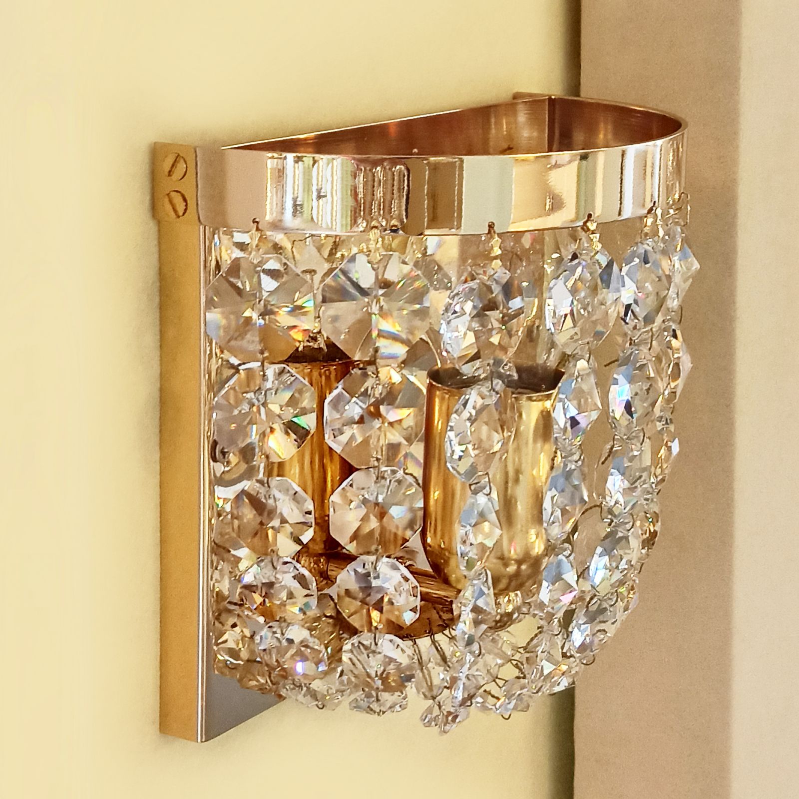 The lamp frame is made of solid brass with 24-carat gold plating. A semicircular ring is attached to the square wall mount's upper part carrying many crystal chains. These run in goblet shape towards the plate's lower rim.