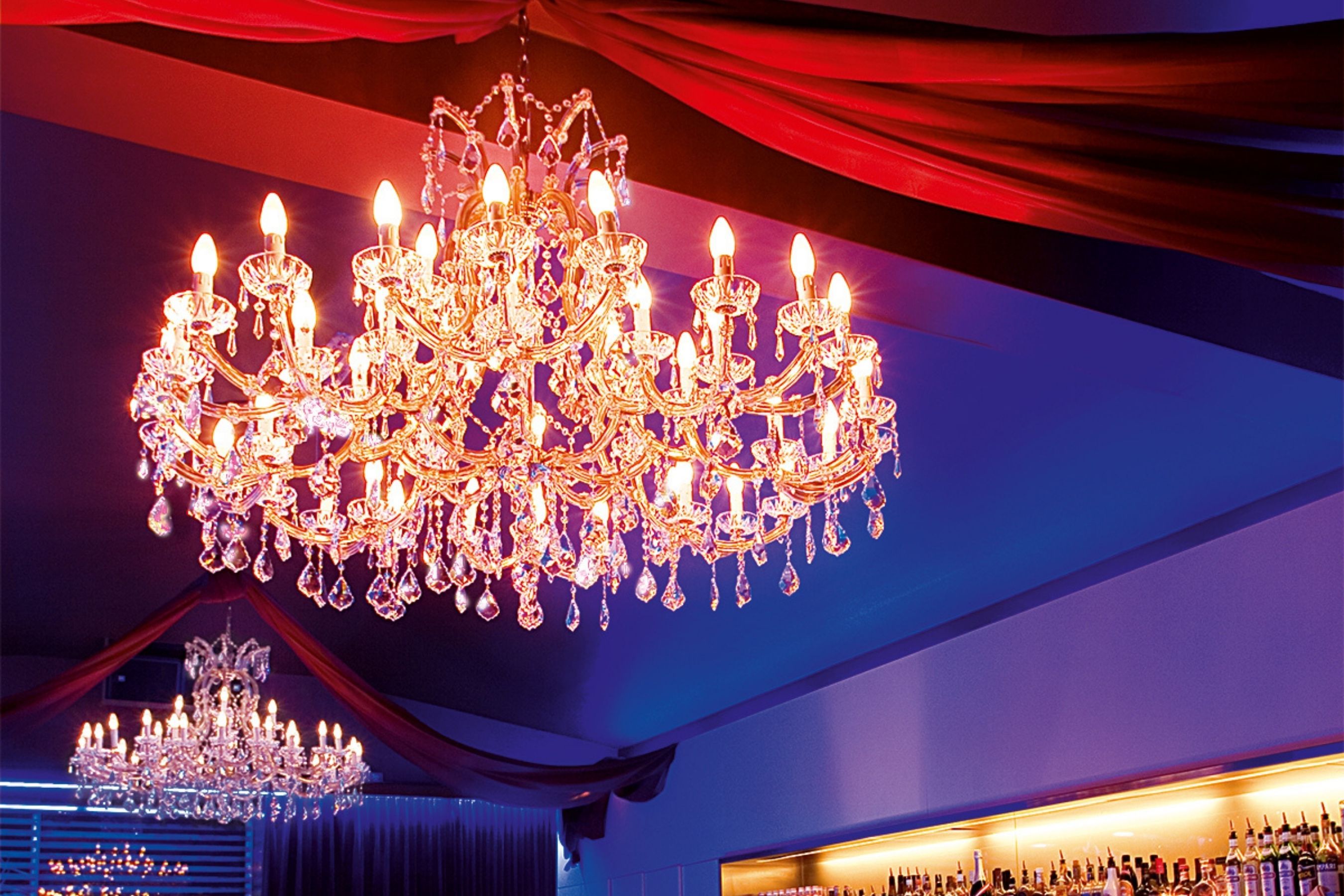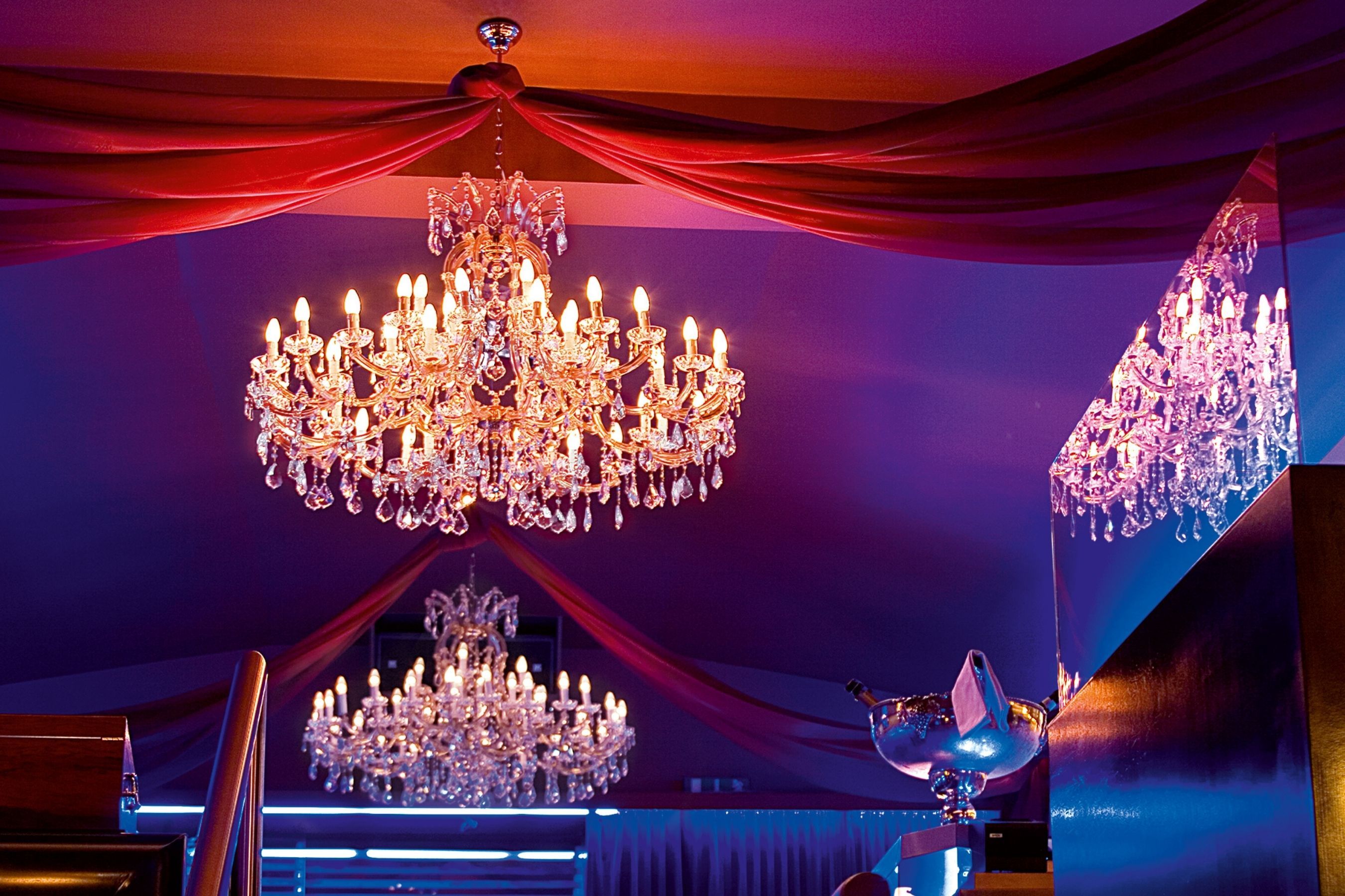 Right in the heart of downtown Graz, it was a special pleasure for ORION to participate in the lighting equipment of this prestigious local cocktail bar and lounge. Through the contact with the ORION branch in Graz the owner – after intensive consulting- decided on the absolute classic crystal light: “Design by ORION: MARIA THERESIA”. The cool and trendy bar is fitted with several models from the “MARIA THERESIA” series with a diameter of 140cm. These special orders were made to measure according to the requirements of the owner. The indirect lighting with LED RGB-technology adds a particular light play.