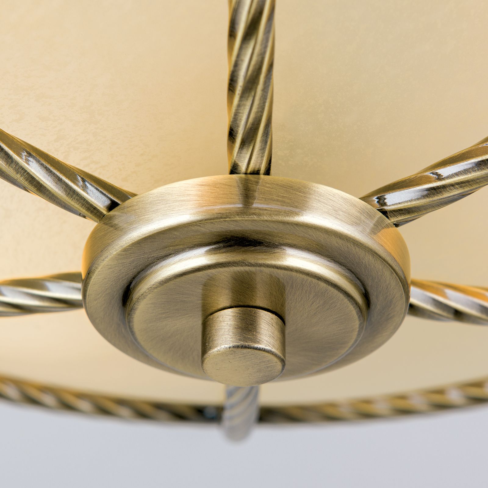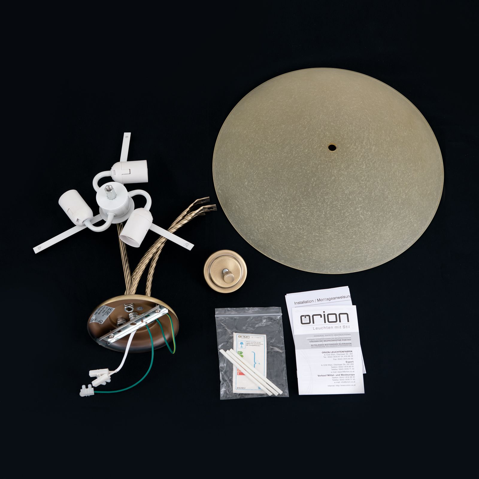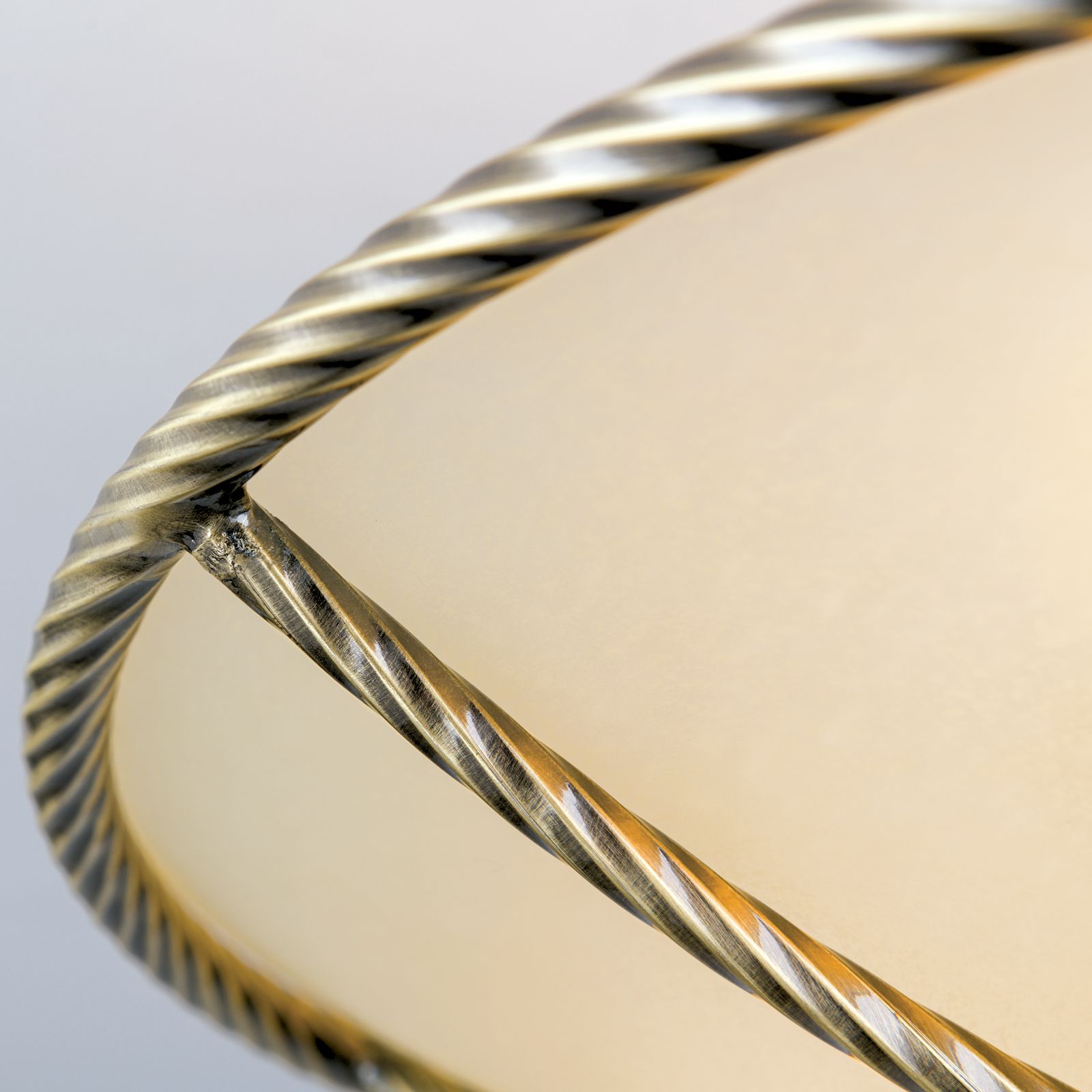 Die Deckenleuchte eignet sich optimal für die Grundbeleuchtung in klassisch eingerichteten Wohnräumen. Der runde Glasschirm in einem schönen Champagnerton sorgt für angenehmes und weiches Licht und wird von drei leicht geschwungenen Streben, die am Metallgestell befestigt sind, gehalten. Eine Besonderheit dabei ist die Verarbeitung des Metalls, welche an ein gewundenes Seil erinnert.