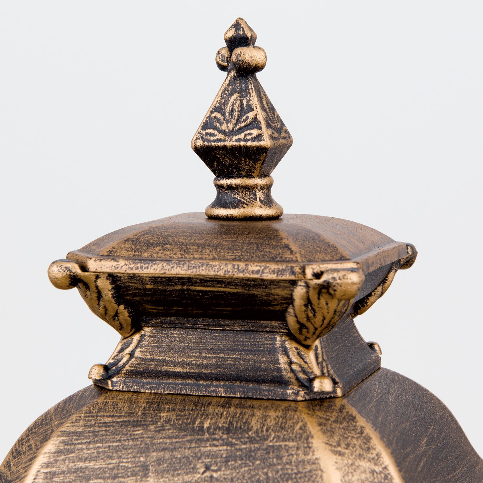 Veredelter Siluminguss mit einbrennlackierter Patinafarbe verleiht ihr nicht nur eine große Beständigkeit, sondern auch ein antikes Erscheinungsbild, das durch zahlreiche dekorative Elemente und feine Kanneluren unterstützt wird.