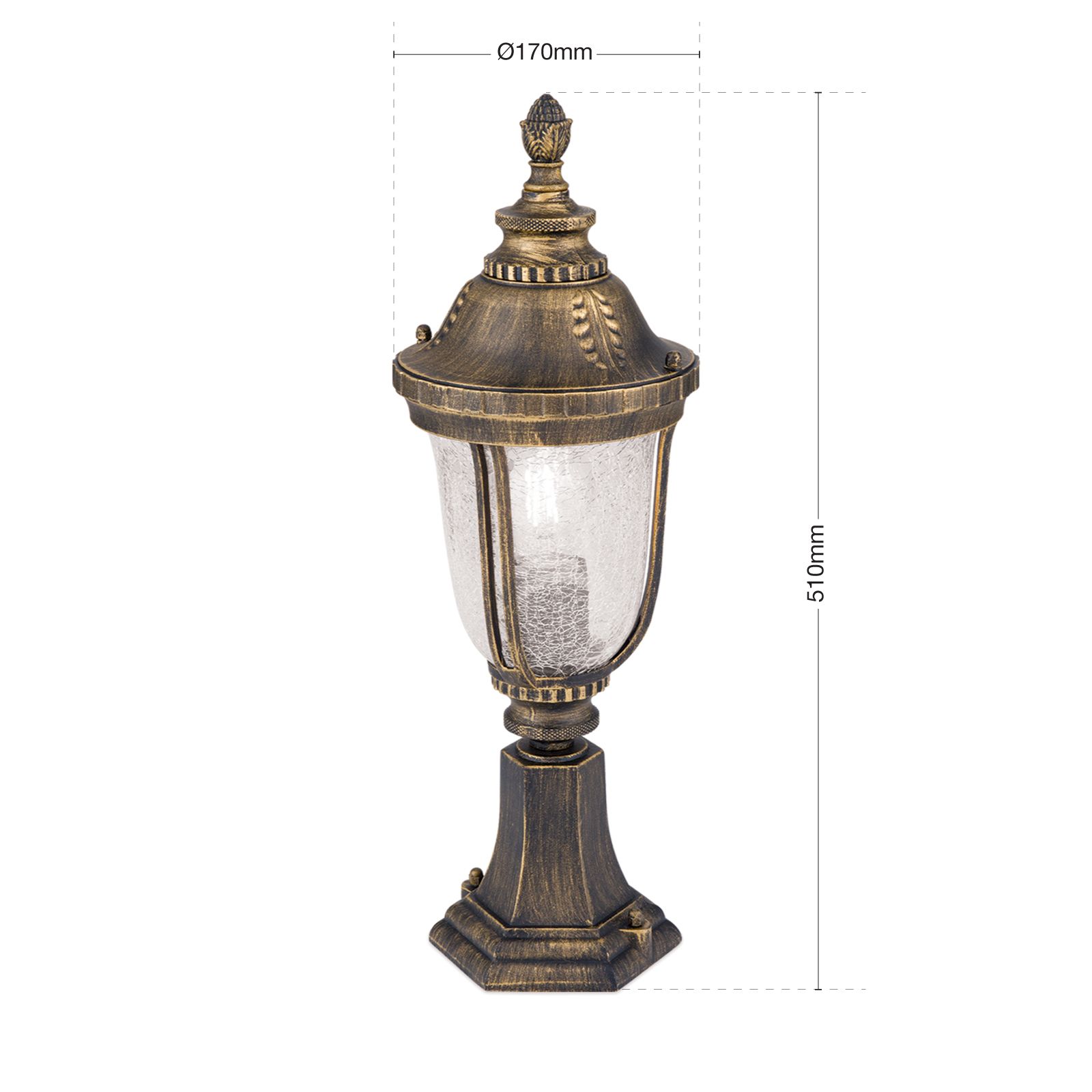 Hervorzuheben ist der durchsichtige Krinkelglasschirm der Laterne, der das altertümliche Design verstärkt. Durch ihre E27-Fassung können Lampen unterschiedlichster Technologien eingesetzt werden.