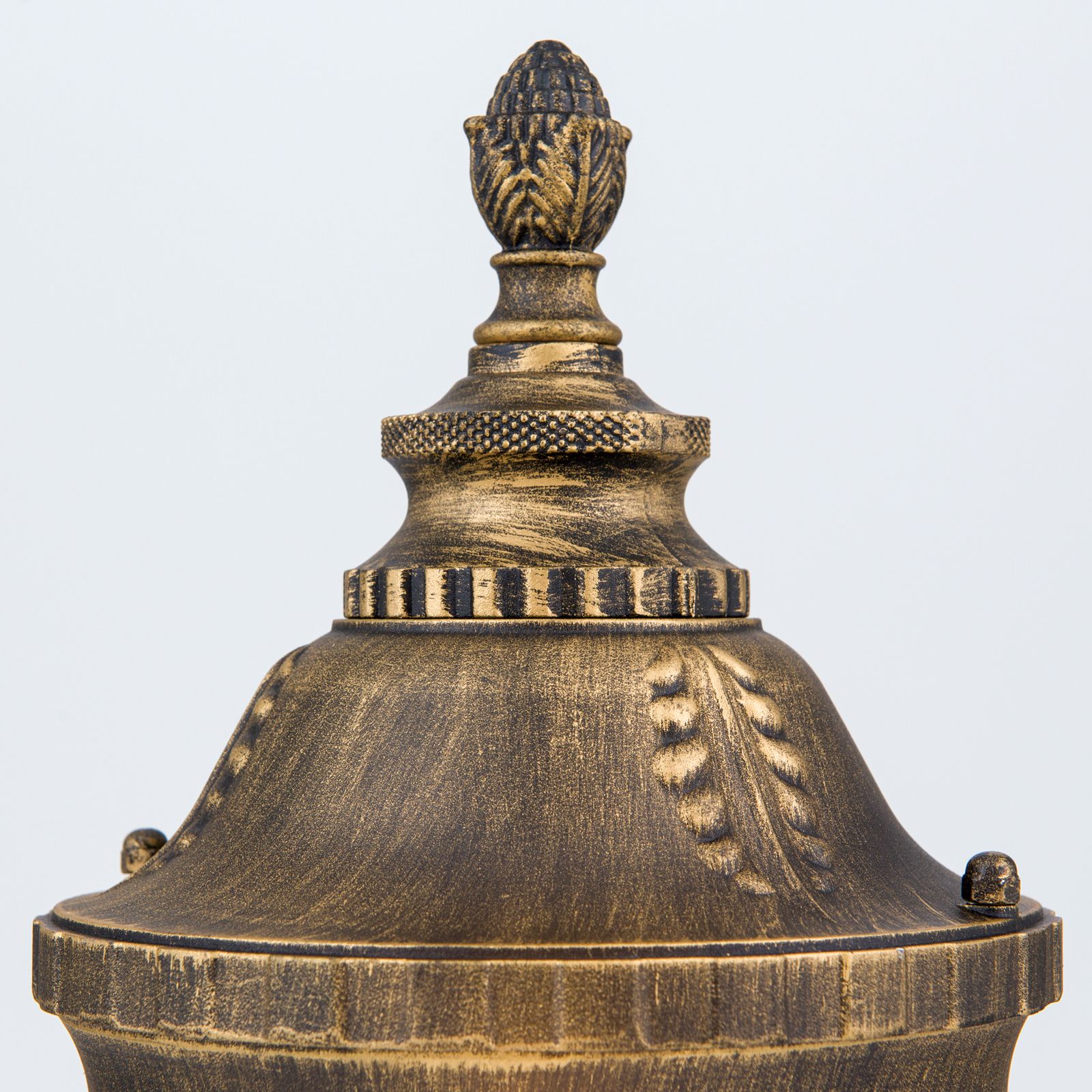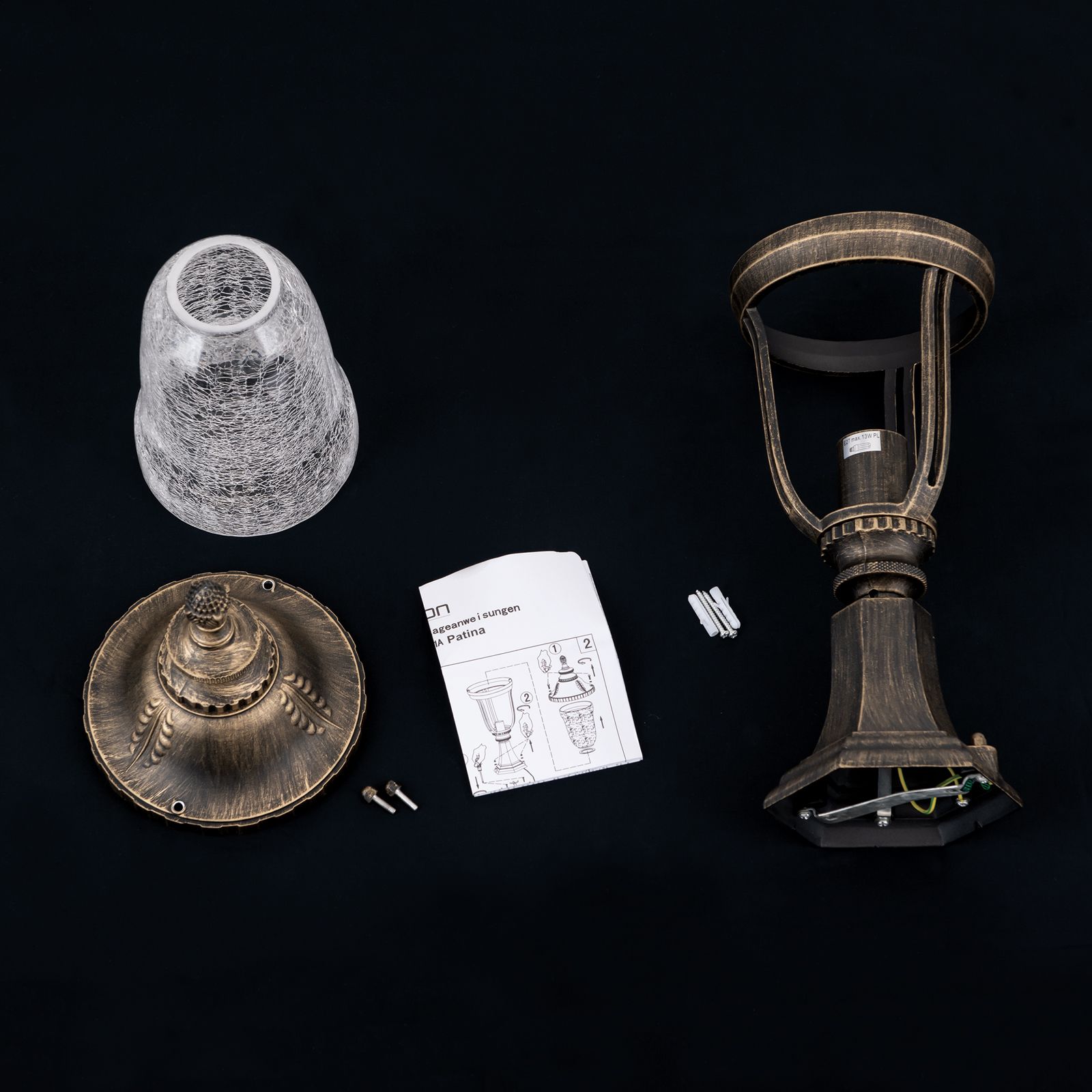 Reicher ornamentaler Schmuck und eine Veredelung mit Patinafarbe verstärken die antike Wirkung der Außenleuchte.