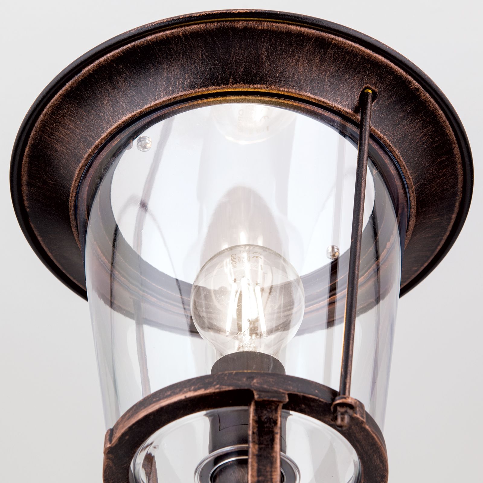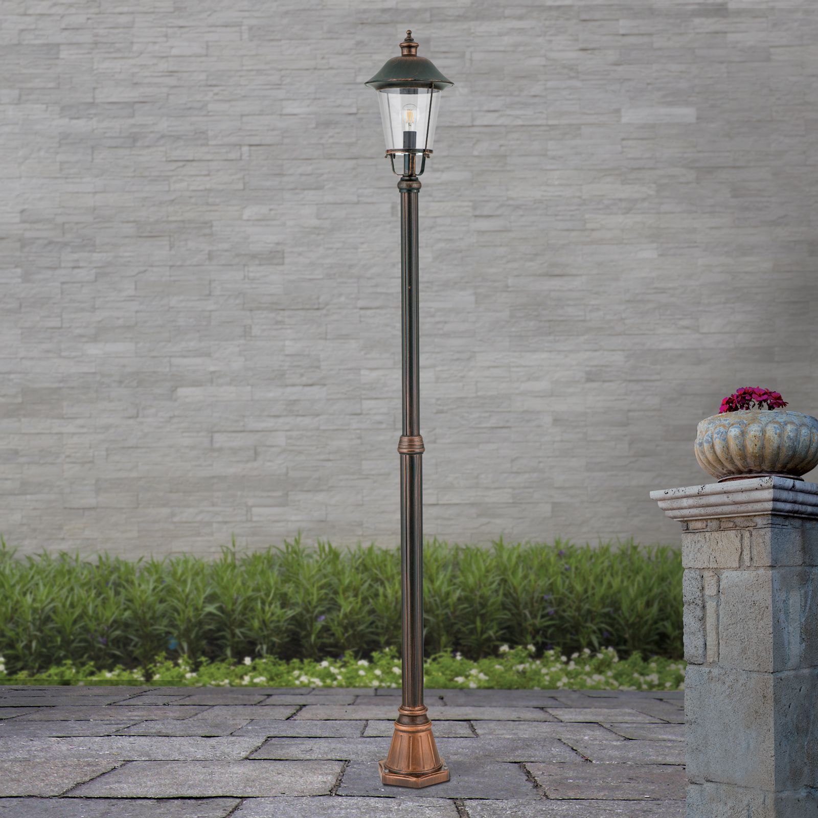Der beständige Siluminguss ist mit einer kupferfarbenen Patina veredelt und der Laternenschirm mit klarem und robustem Acrylglas ausgestattet.