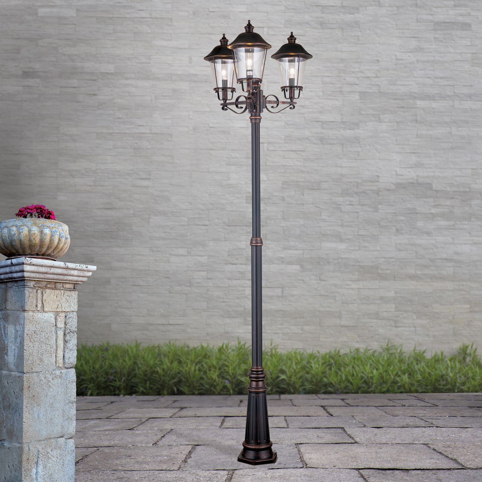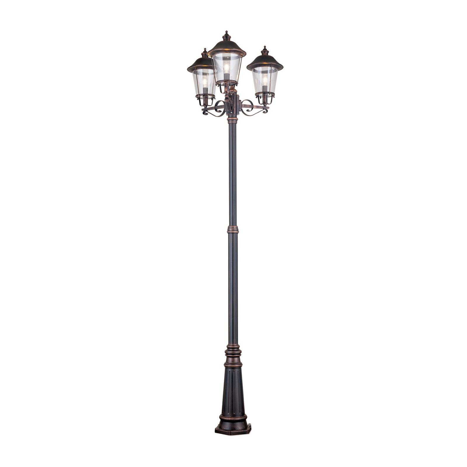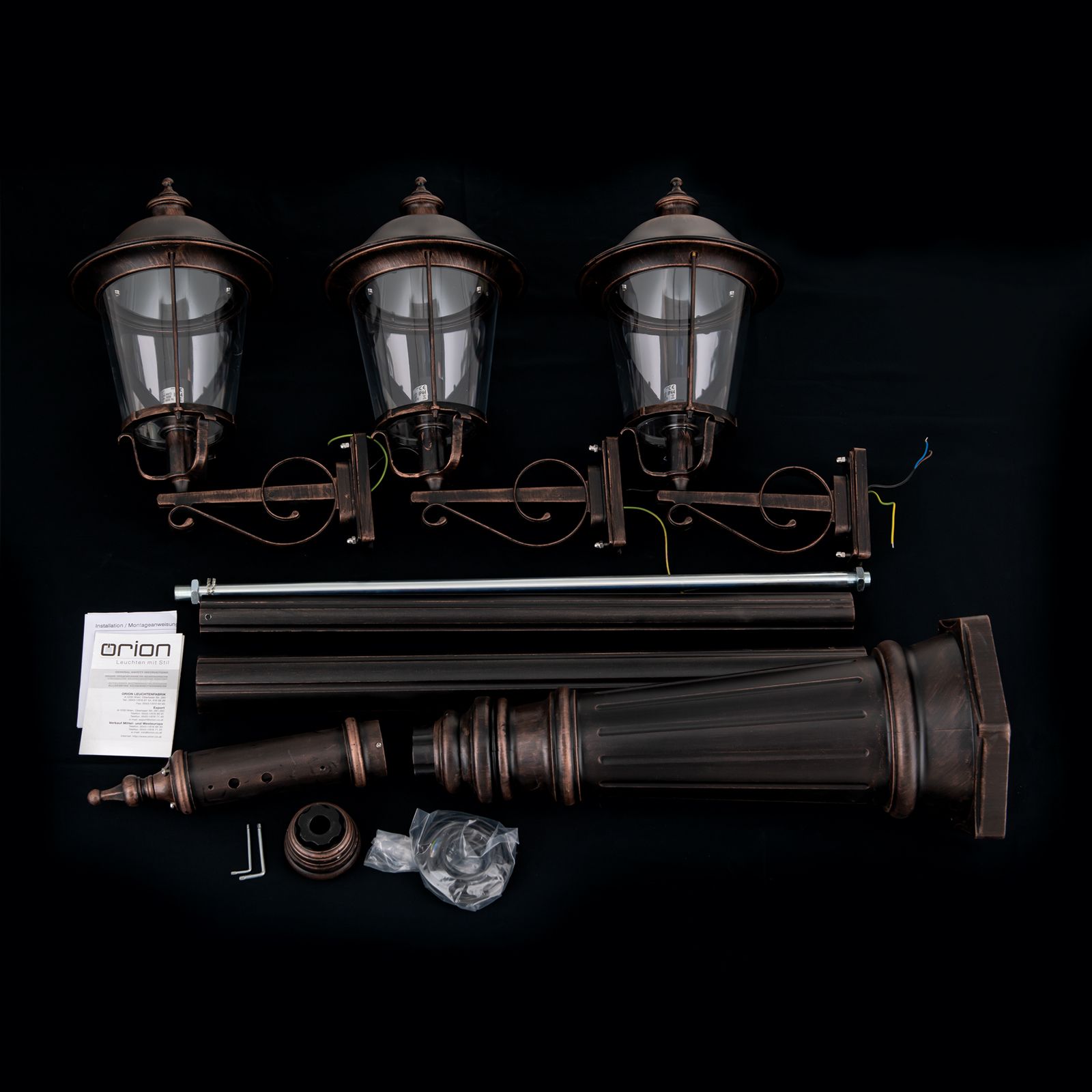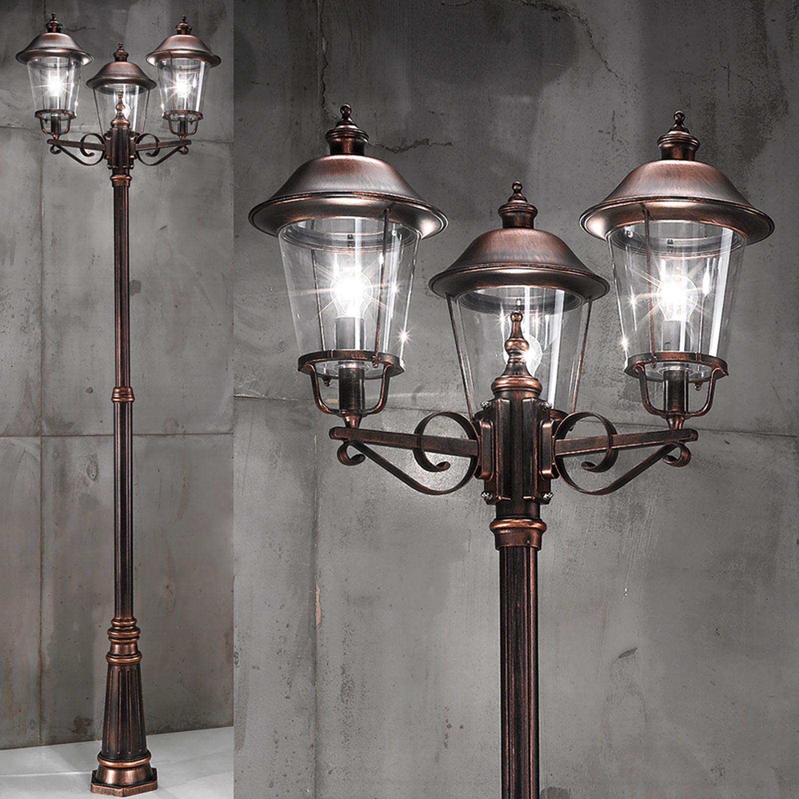 Die dreiflammige Mastleuchte KENZO im Schmiededesign eigent sich hervorragend für weitläufige Gartenanlagen und Parks. Von den drei krönenden Laternen geht ein nostalgischer Charme aus, der durch die kupferfarbene Patina gesteigert wird.