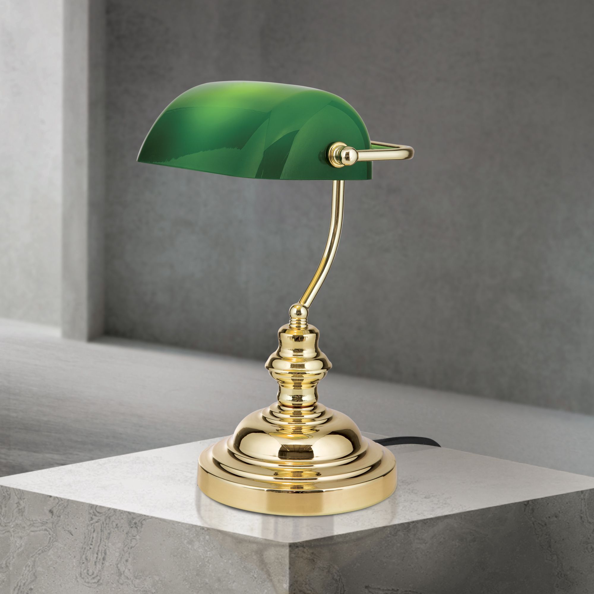 BANKERSLAMP, messing glänzend, mit grünem Glas