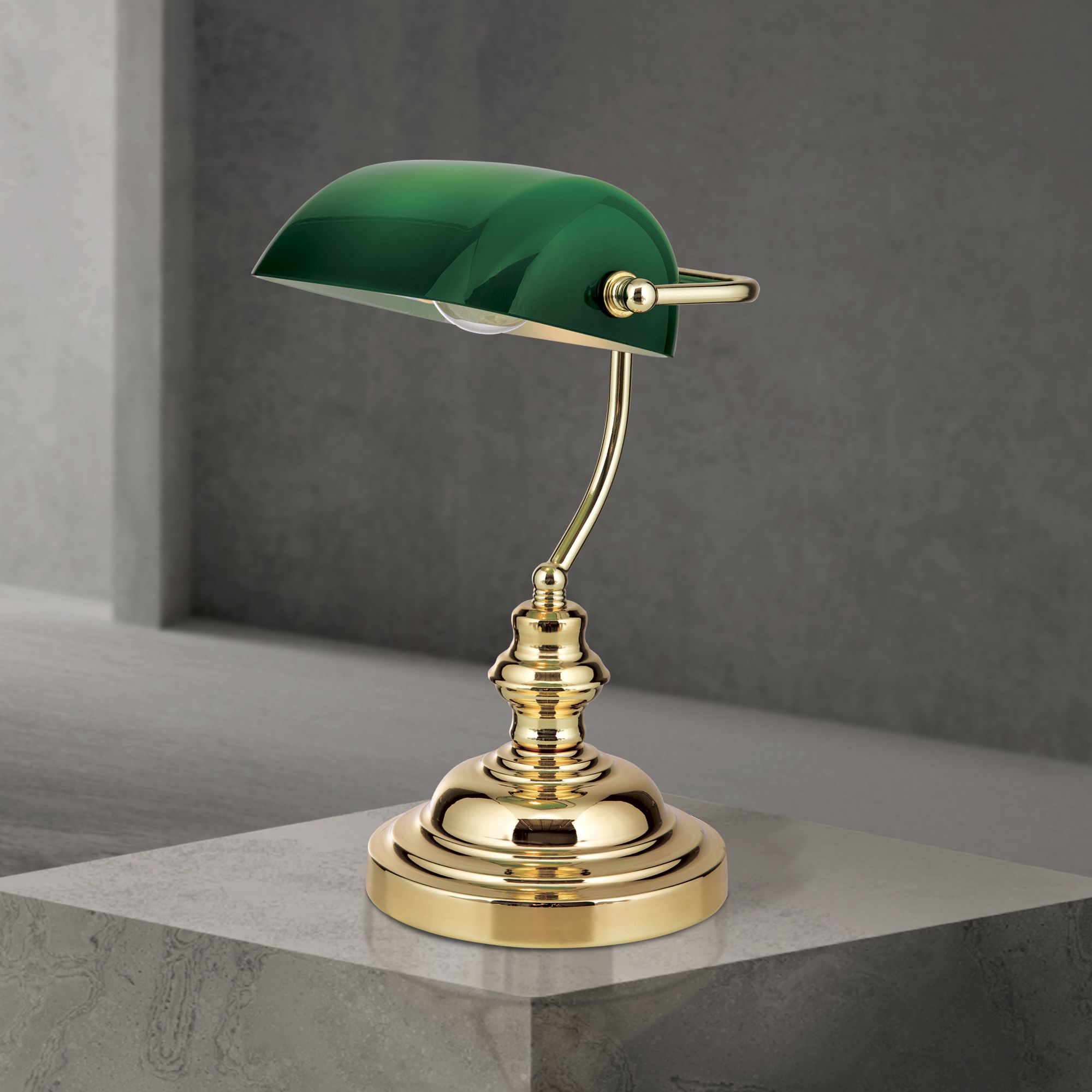 Ein grünglänzender Lampenschirm und ein Messingfuß: Diese beiden Elemente charakterisieren die klassische BANKERSLAMP, die ein fixer Bestandteil klassisch eingerichteter Interieurs ist.