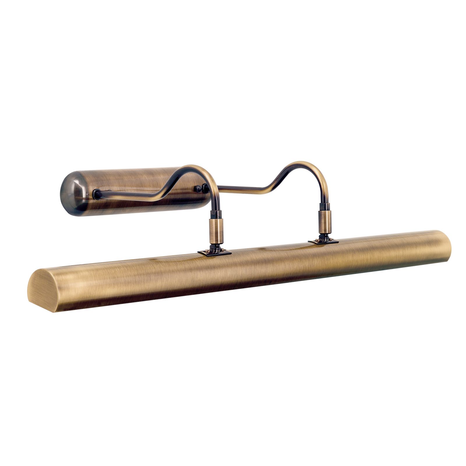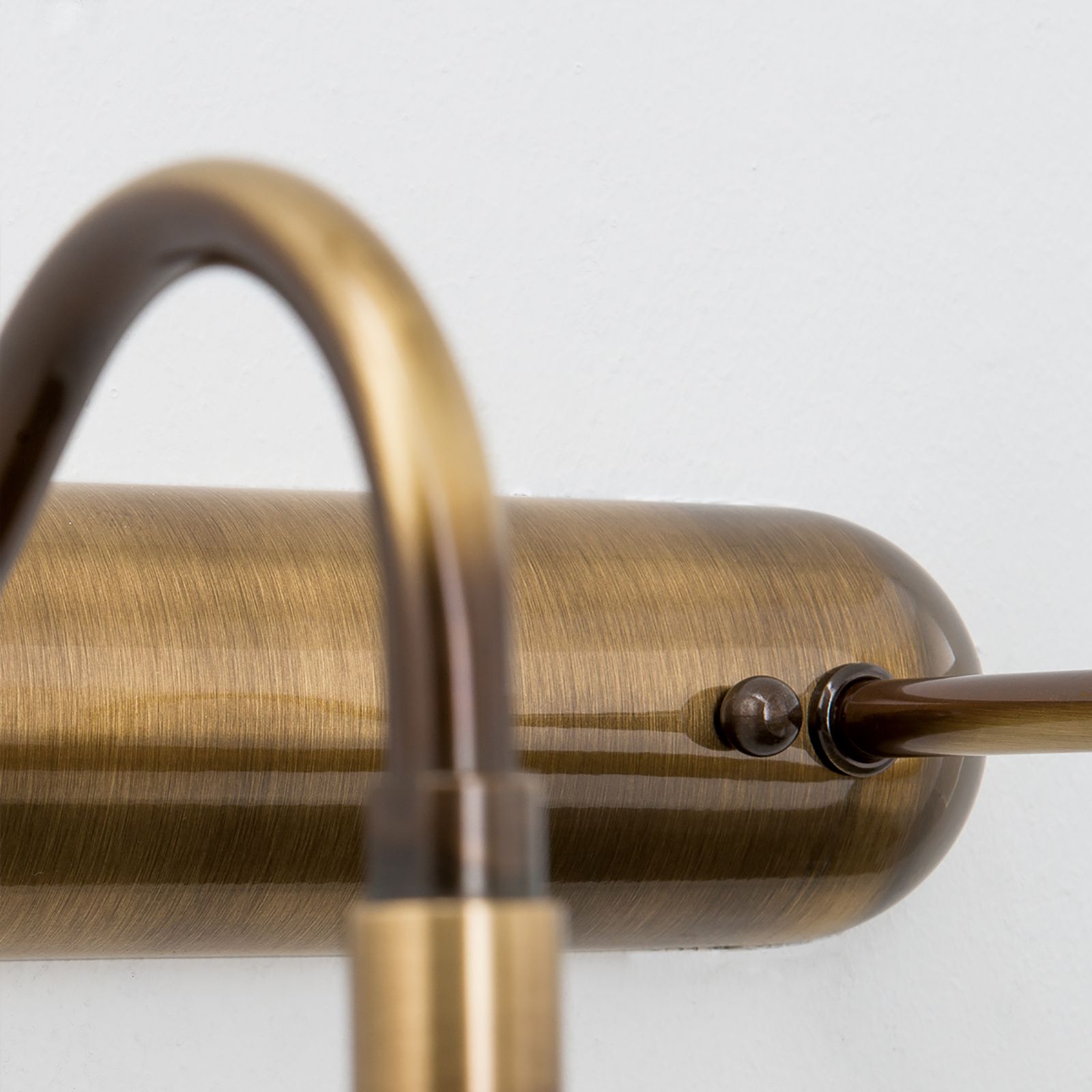 Die optimale Inszenierung von großformatigen Gemälden gelingt mit der dreiflammigen und 65 Zentimeter langen Bilderleuchte. Die Innenseite des Schirms ist weiß lackiert und dient als Reflektor, der das Licht intensiviert. Da die Leuchtenarme mit Gelenken ausgestattet sind, kann der Lichtkegel des Schirms durch einfaches Schwenken auf das Objekt ausgerichtet werden.