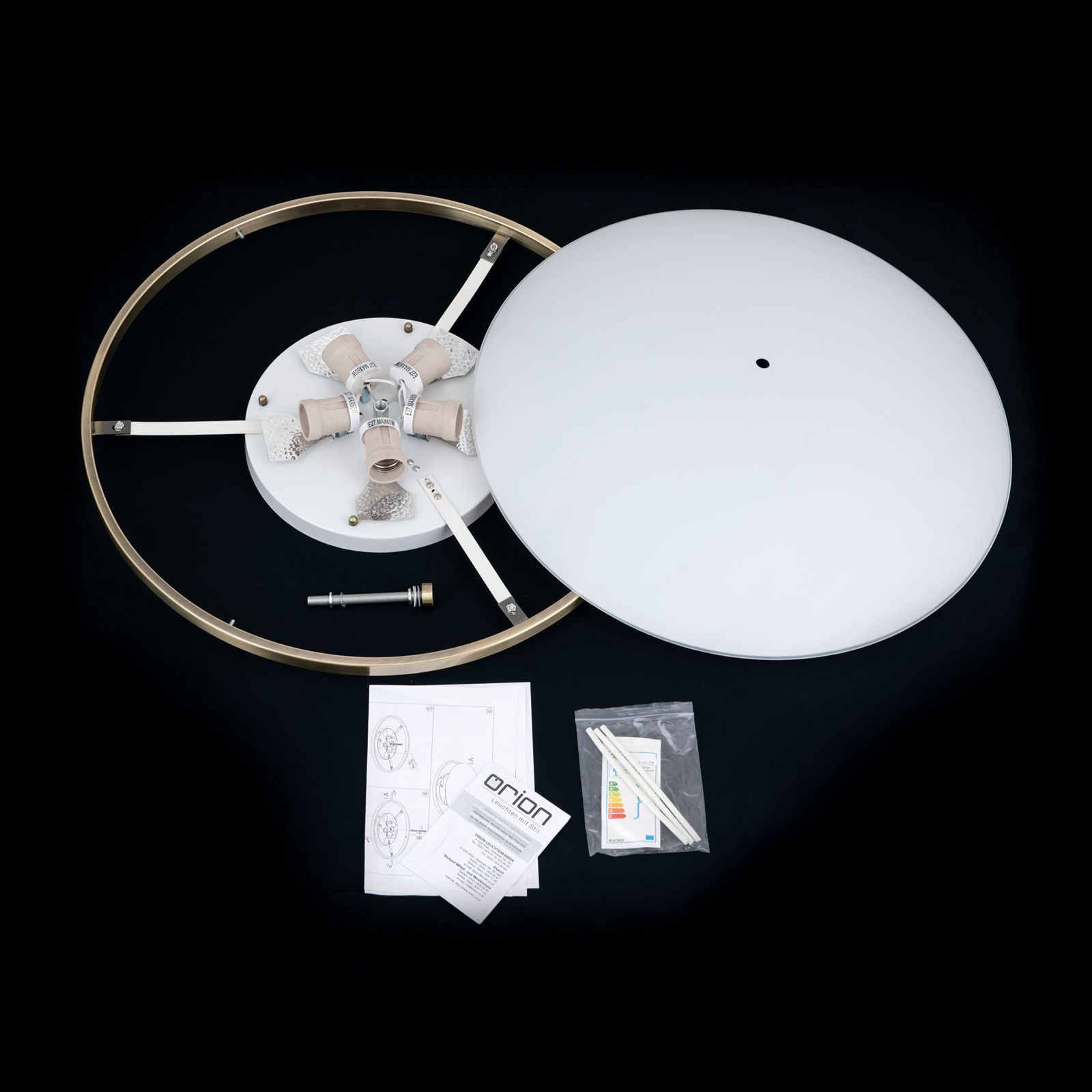 Ein Opalglasschirm mit einem Durchmesser von 56 Zentimetern und ganze fünf E27- Fassungen verleihen der Deckenleuchte AIDA eine starke Leuchtkraft und sanfte Lichtstreuung.