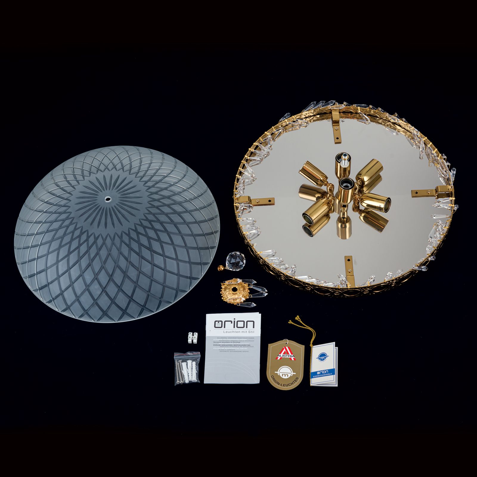 Das edle Gesamtbild der Deckenleuchte EMPIRE CRYSTAL ist das Ergebnis des Einsatzes exklusiver Materialien und hervorragender Verarbeitung. Eine Vergoldung mit 24-karätigem Gold veredelt die Montur aus Vollmessing, die satinierte Glasschale wurde im Diamantschliffverfahren mit einem aufwendigen Kantenschliff versehen. Das ornamental geprägte Zierband ist von zahlreichen Kristalltropfen aus dem Hause Schöler gesäumt, die für wunderbare Lichtreflexionen im Raum verantwortlich sind. Sechs E14-Fassungen können mit Leuchtmitteln mit maximal je 40 Watt bestückt werden und geben dank der satinierten Glasabdeckung homogenes Licht ab, ohne den Betrachter zu blenden.