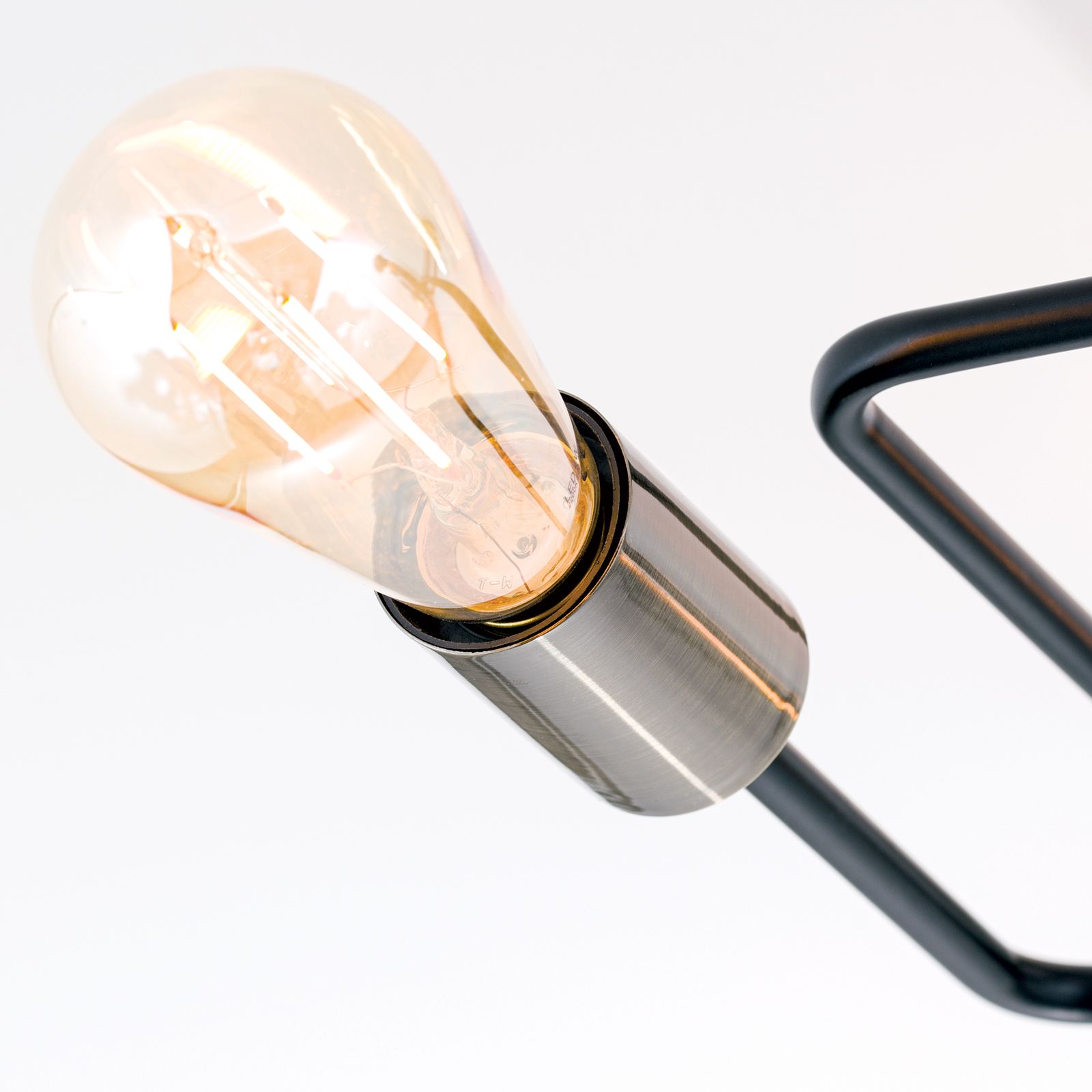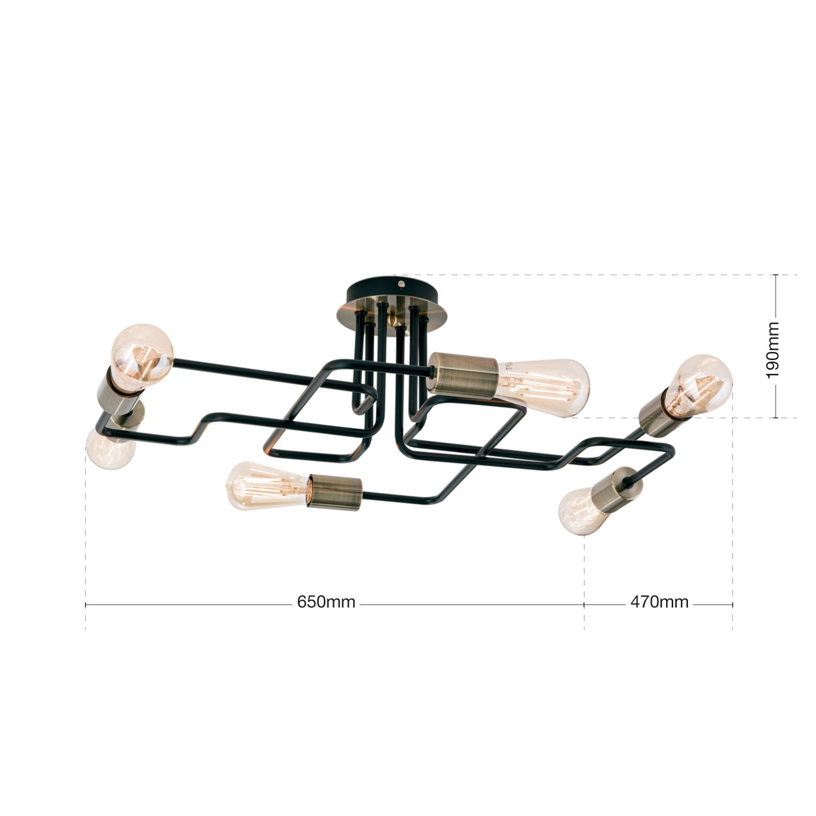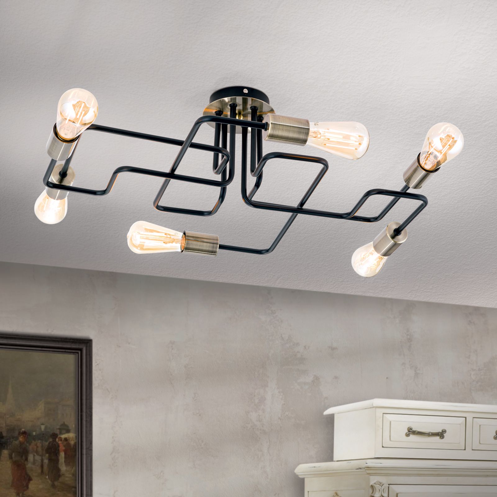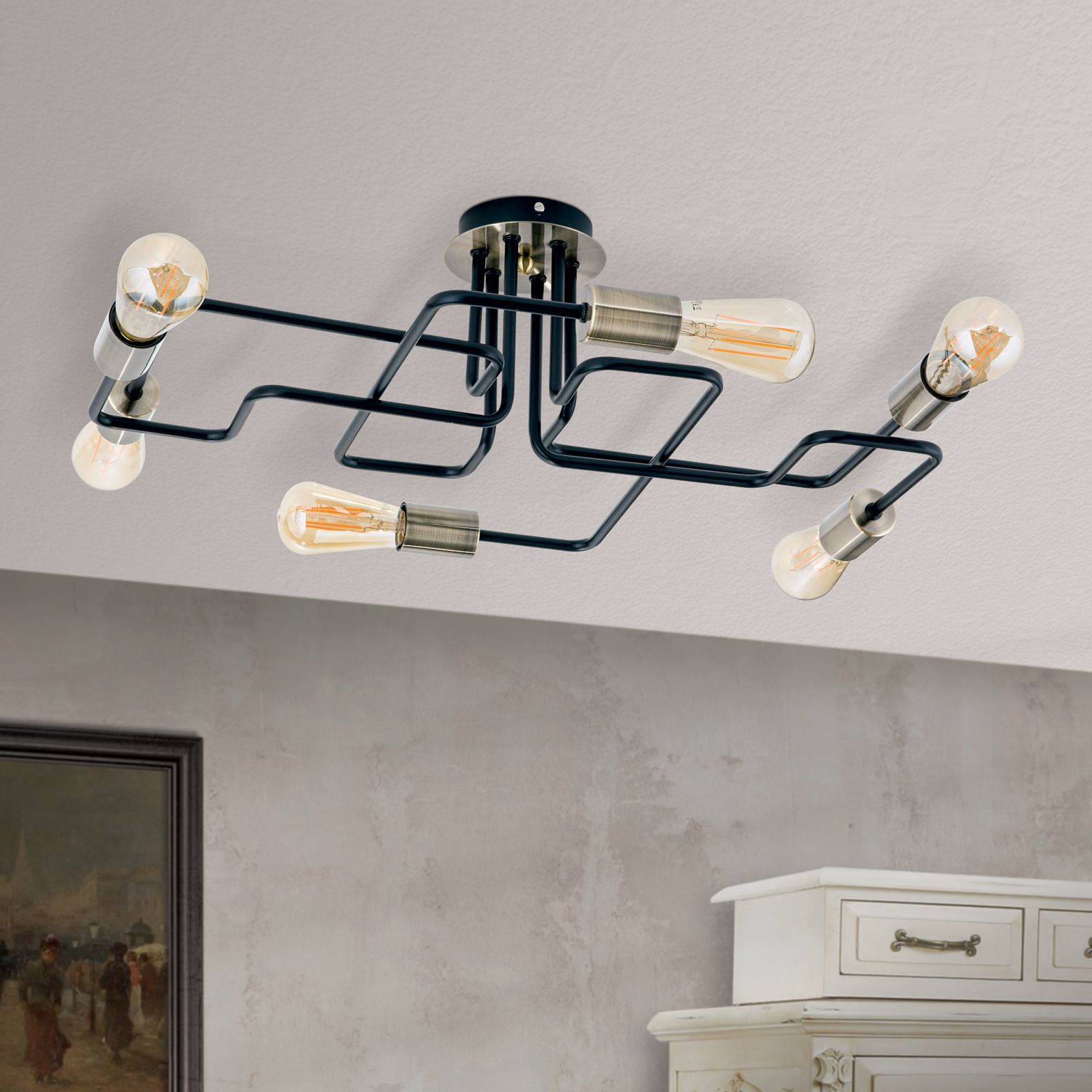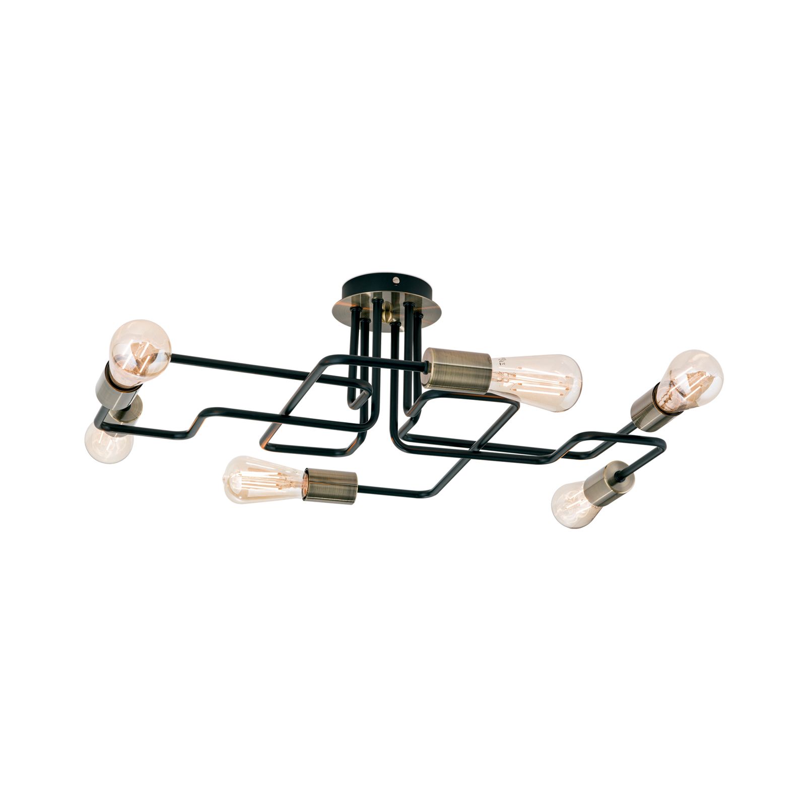 Modern und schlicht im Design kann die Deckenleuchte JAILHOUSE durch ihre einfachen Grundelemente überzeugen. Dekorative Leuchtmittel verleihen der Leuchte einen persönlichen Touch. Ob Kolbenlampe mit Glühfadenoptik, Antik Globe- oder Vintage-Glühbirne, sie sorgen für den letzten Schliff und machen die Deckenleuchte JAILHOUSE zu einem echten Hingucker. Die Leuchte besteht aus sechs E27-Stahlfassung in Patina-Schwarz, die mit maximal 60 Watt je Fassung betrieben werden können. Das Metallgestänge ist mehrfach über Eck gebogen und verzweigt sich geometrisch an der Decke. Mit einer Gesamthöhe von nur 19 cm eignet sich die Leuchte auch wunderbar für Räume mit niedriger Deckenhöhe.