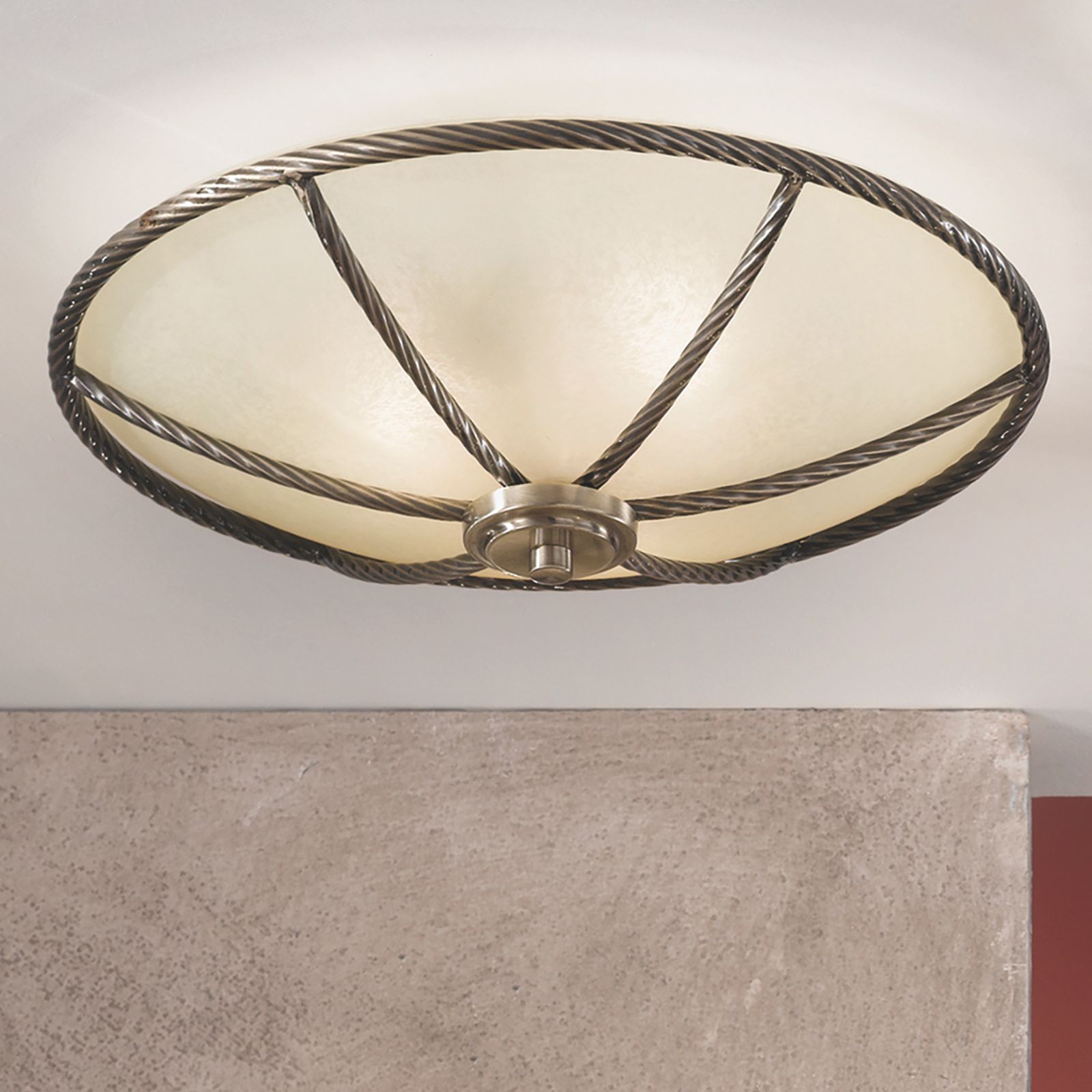 Die interessante Deckenleuchte MAURO wirkt ganz speziell auf den Betrachter und passt gut in ein klassisch eingerichtetes Interieur. Im Wohnzimmer oder im Flur verbreitet sie gleichmäßig und angenehmes Licht. Der zurückhaltende, champagnerfarbene Glasschirm mit einer Höhe von 18 cm eignet sich gut für Räume mit niedriger Deckenhöhe. Ergänzt wird dieser durch ein Metallgestell, welches an ein gewundenes Seil erinnert.
