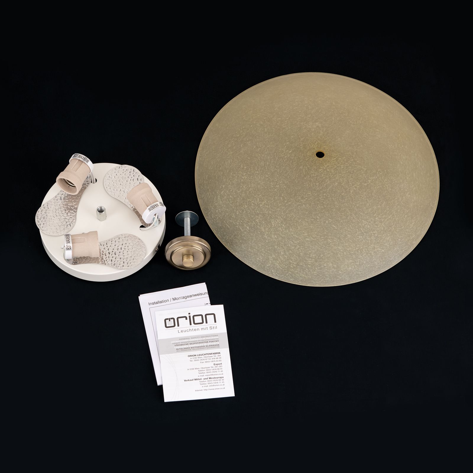 Das Metallgestell wird durch einen champagnerfarbenen Glasschirm ergänzt, welcher ein angenehmes Licht abgibt, ohne zu blenden. Mithilfe eines Phasenabschnittdimmer kann die Lichtstimmung reguliert werden. Die Deckenleuchte mit einem Durchmesser von 56 cm ist mit fünf E27-Fassungen ausgestattet, die mit maximal 60 Watt bestückt werden. Matte LED-Lampen unterstützen die weich matte Lichtwirkung des Schirms, ohne dabei zu viel Energie zu verbrauchen.
