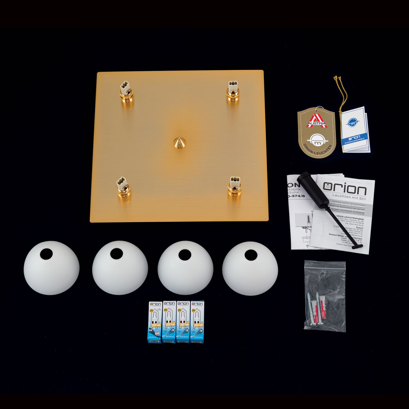 Auf einer quadratischen Messingplatte sind vier Strahler mit qualitätsvollen Opalglasschirmen befestigt. Das Opalglas für ein weiches und angenehmes Raumlicht.