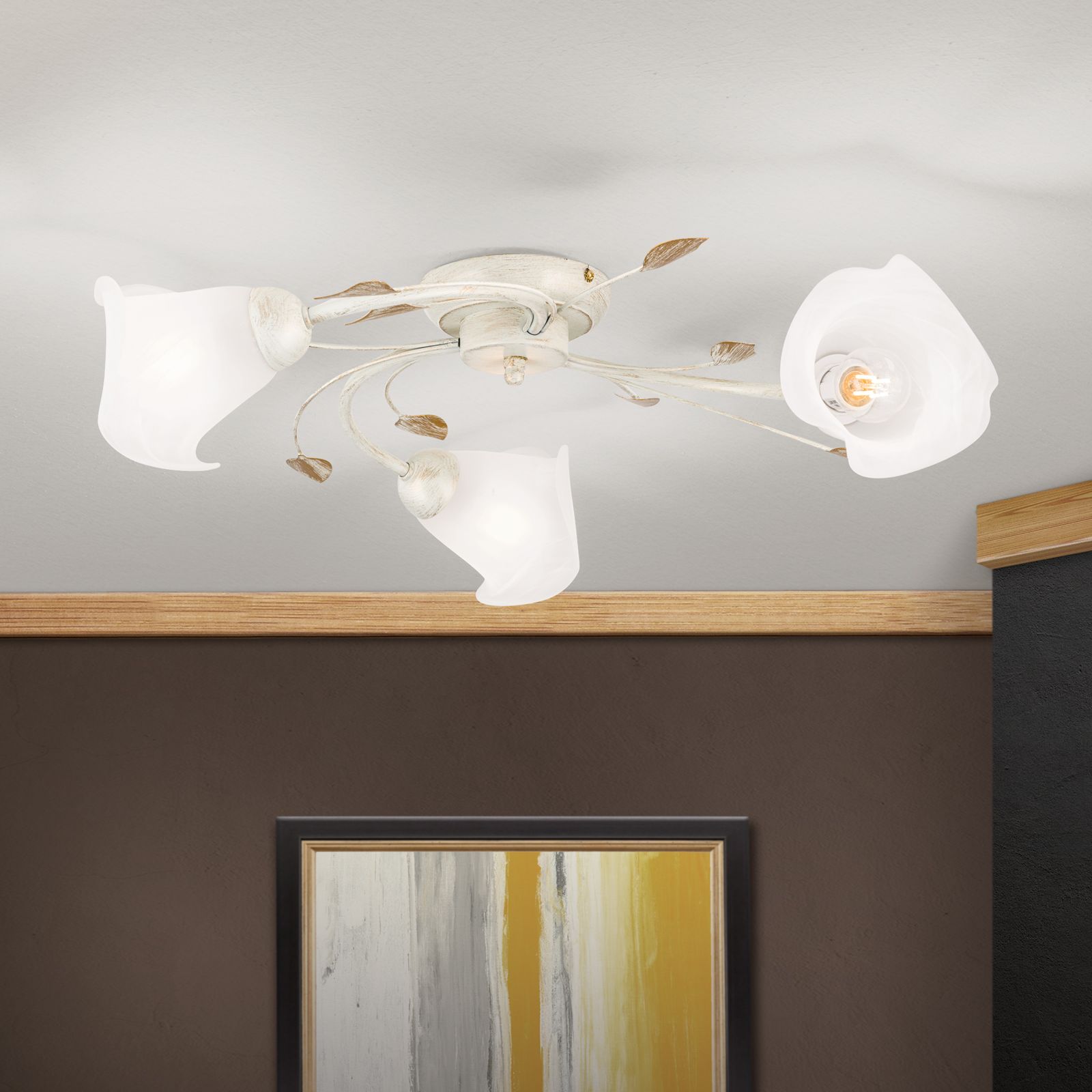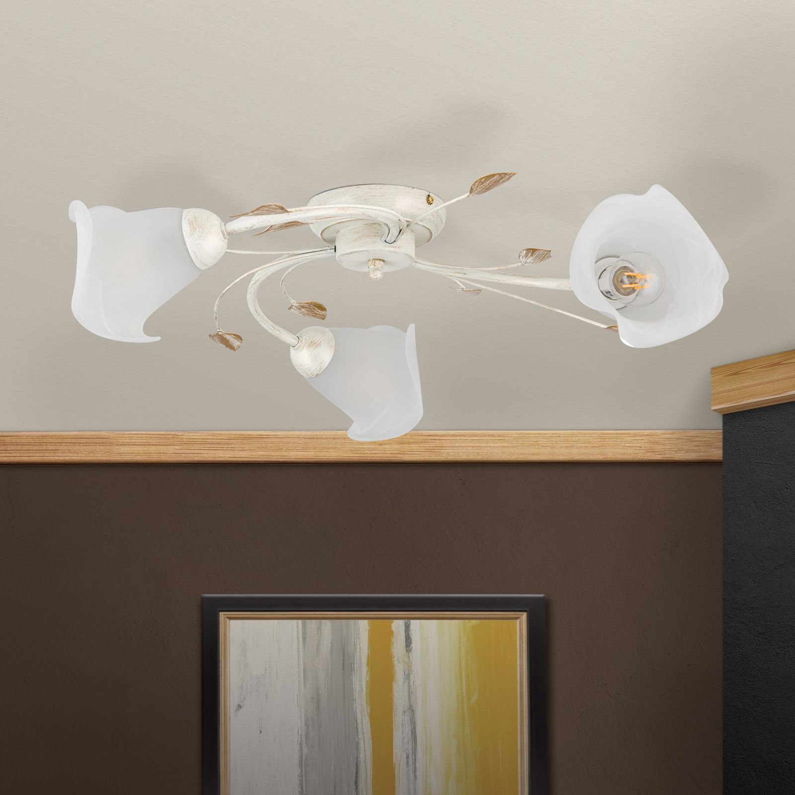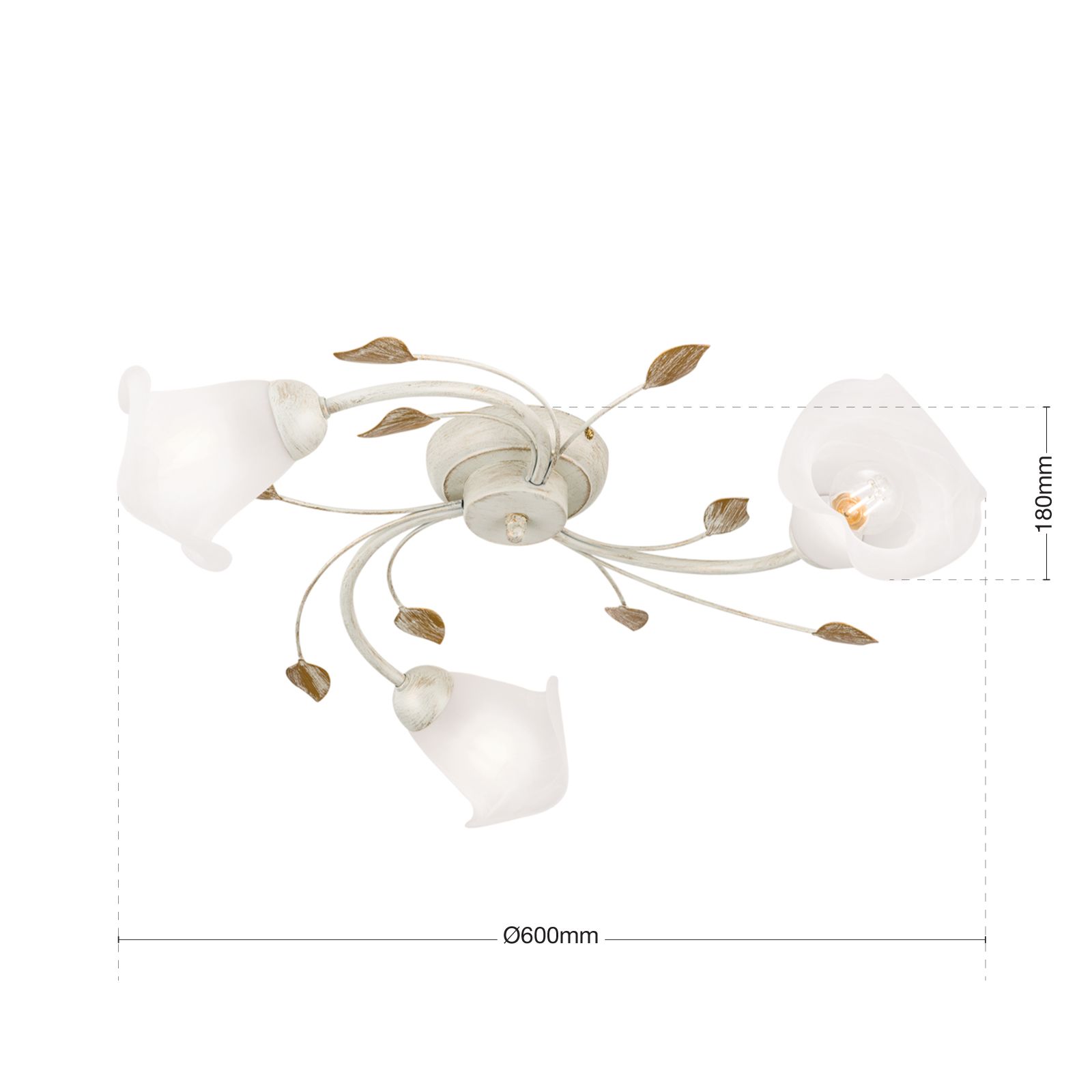 Stilvoll geschwungen präsentiert sich die Deckenleuchte SISI im Florentiner Stil und begeistert Liebhaberinnen und Liebhaber italienischen Designs. Sie erinnert an einen Wirbel bestehend aus bezaubernden Blütenkelchen und formschönen Blättern. Für eine angenehme Lichtverteilung im Raum sorgen die opal matten Glasschirme aus Alabasterglas, die auf den Betrachter sehr angenehm wirken. Das Gestell gibt es in den Varianten Elfenbein-Gold und Antik. Ihre 3 E14-Fassungen können mit maximal 40 Watt je Fassung betrieben werden.