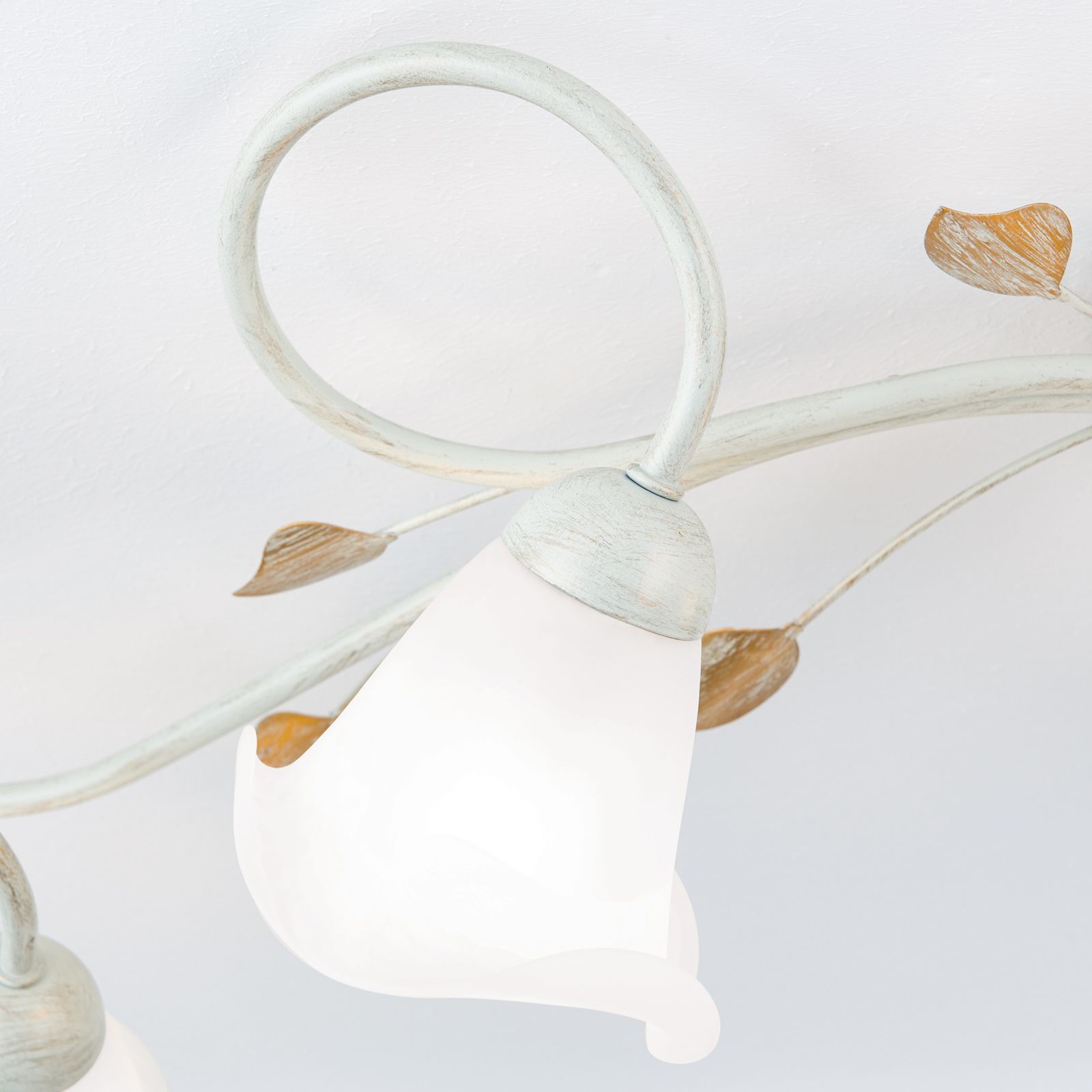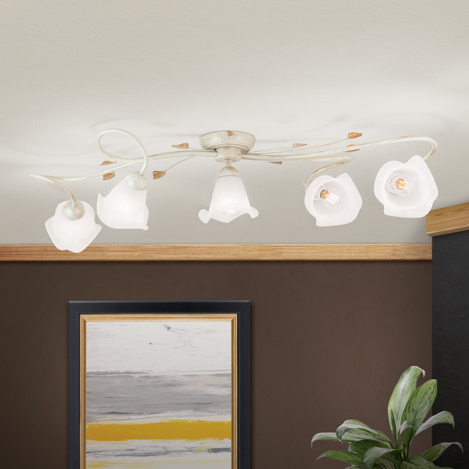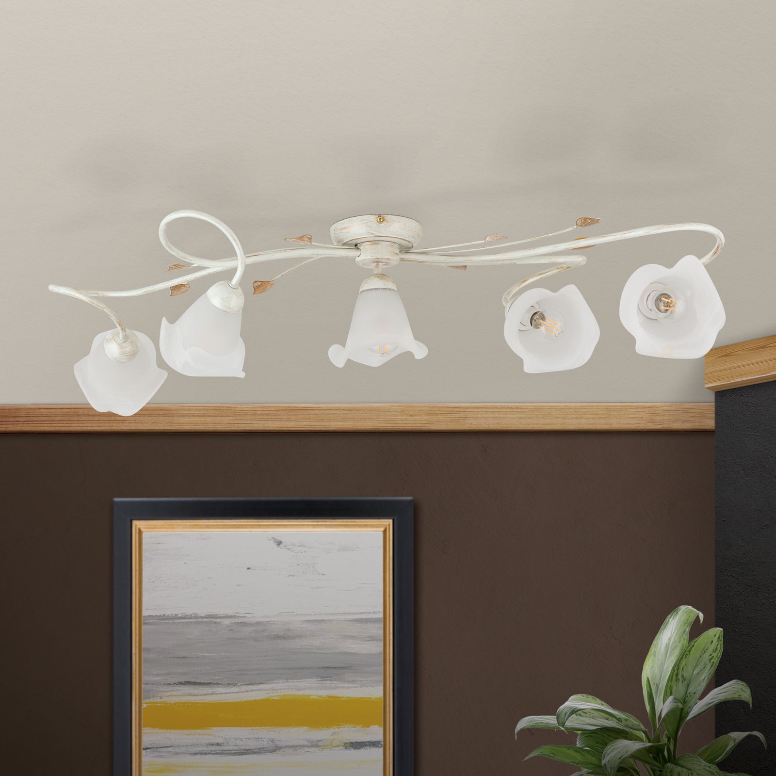 Die Deckenleuchte SISI strahlt Eleganz und Verspieltheit aus. Gestaltet im Florentiner Stil ist sie ein Lichtobjekt, das Leichtigkeit und Freude vermittelt. Ihre florale Optik entsteht durch ihre schwungvoll gebogenen Arme, an denen jeweils ein Glasschirm in Blütenkelchform sitzt. Zentral vom Deckensockel schlängeln sich wunderschöne Blätter in Richtung dieser Kelche. Die Glasschirme sorgen mit ihrem opal mattem Alabasterglas für eine weiche Lichtverteilung und gemütliche Atmosphäre. Die 5 E14-Fassungen werden mit maximal 40 Watt je Fassung betrieben.