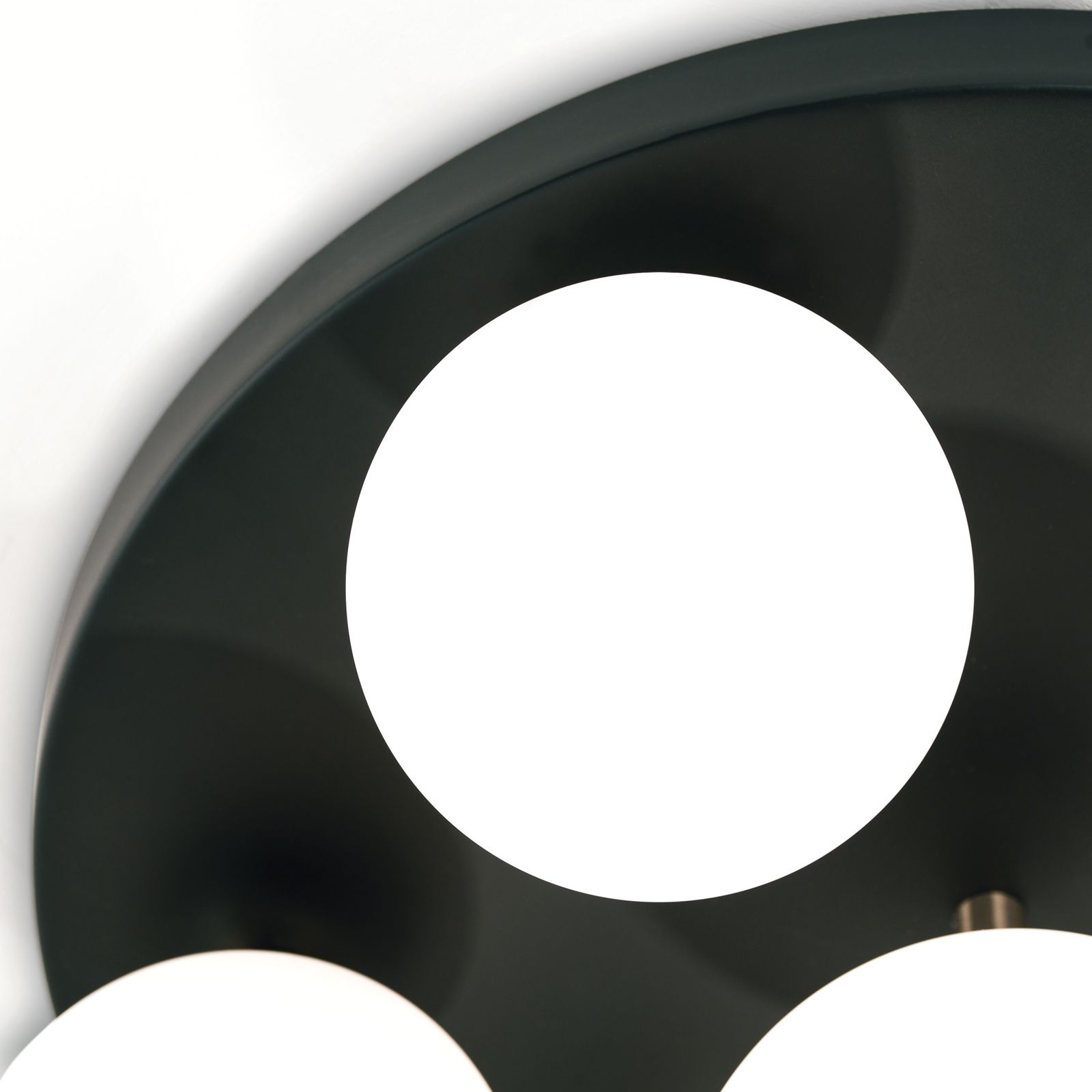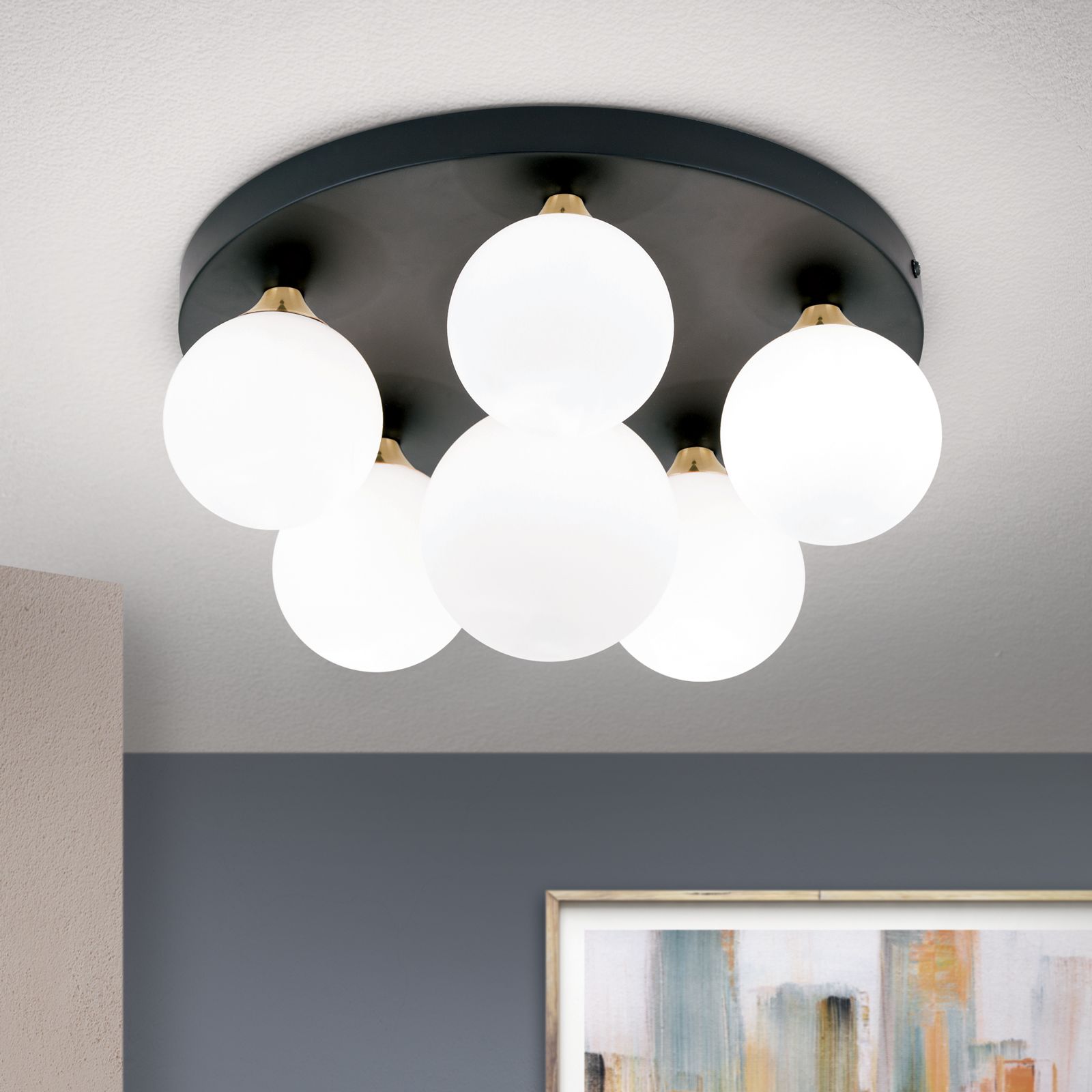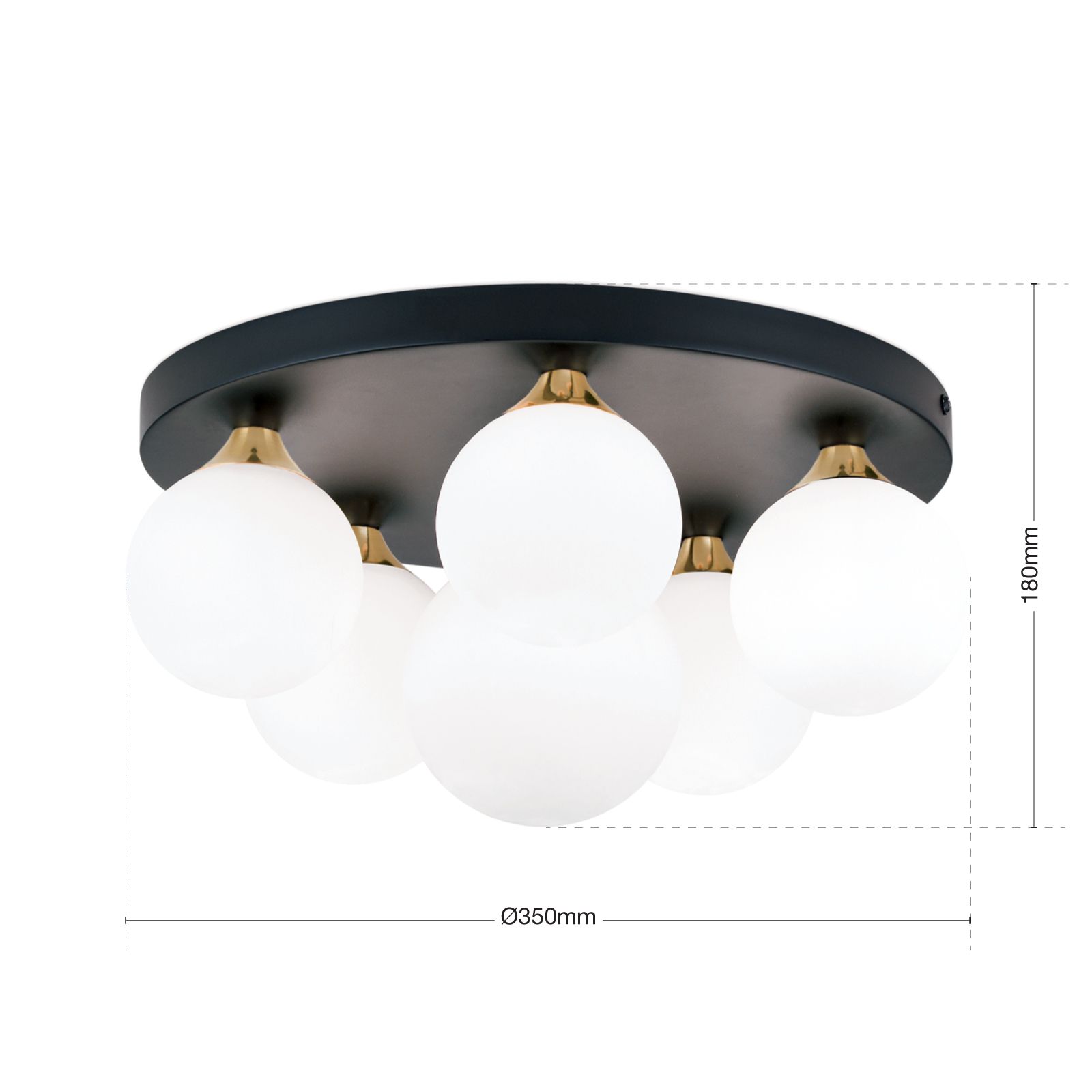 Die Deckenleuchte SNOWWHITE bezaubert mit ihrem kontrastreichen Zusammenspiel aus schwarzem Sockel und weißen Glaskugeln. In modern eingerichteten Räumen findet sie ihren Platz in zahlreichen Räumen, wie etwa einem Vorraum, dem Schlaf- oder Wohnzimmer und taucht den Raum in ein angenehmes Licht. Auf dem schwarzen Metallsockel finden sich die weißen Glaskugeln in gleichmäßigen Abstand zueinander wieder, welche zusätzlich mit einer messingfarbenen Fassung versehen sind. Die Leuchte verspricht eine homogene Lichtverteilung im Raum und trägt zu einem modernen Wohlfühlambiente bei. Mit 6 G9-Fassungen können diese mit maximal 20 Watt je Fassung betrieben werden. Der Sockel beträgt einen Durchmesser von 36 cm.