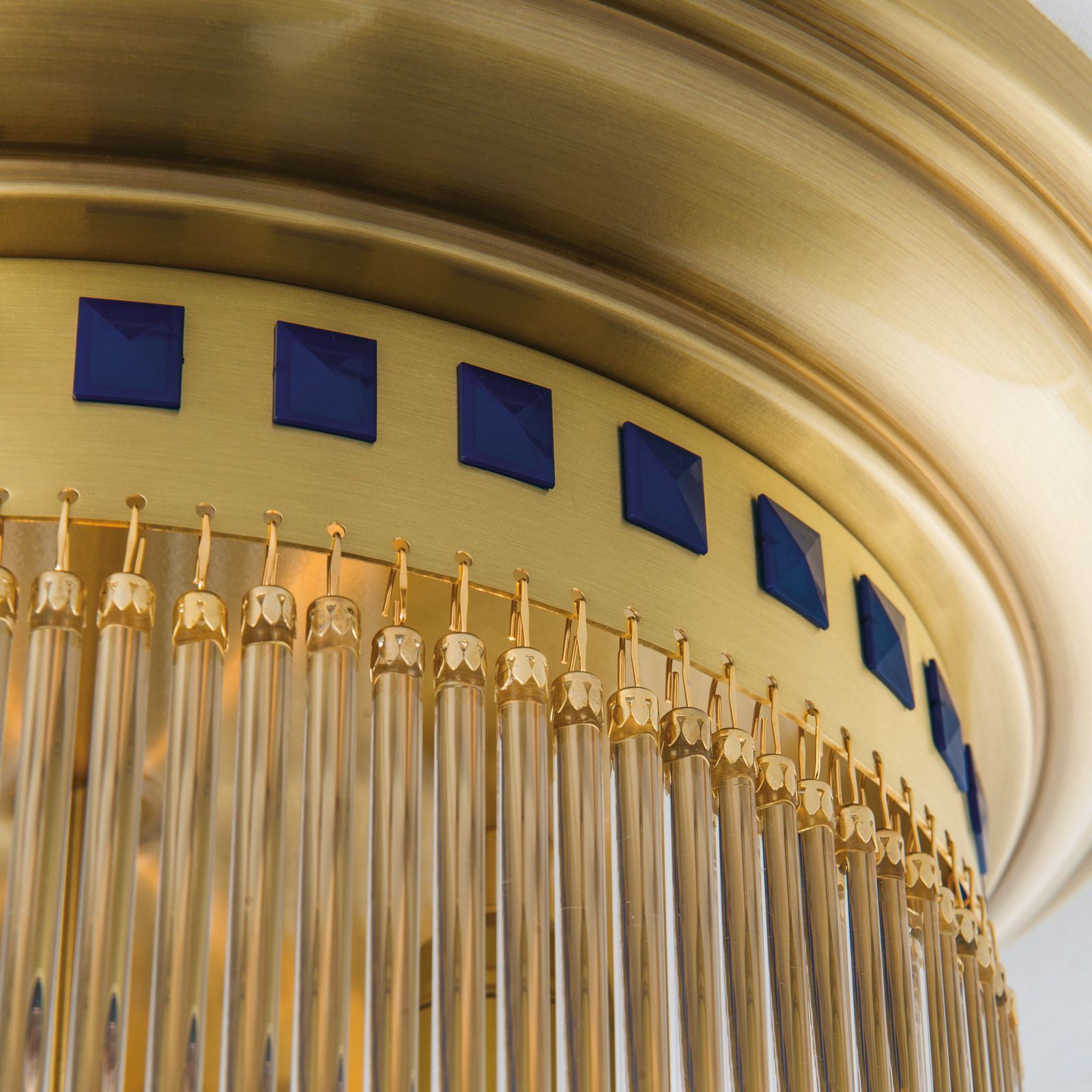 Die STÄBCHENSERIE fasziniert durch die Leichtigkeit, die durch die Vollglasstäbchen entsteht. Wie ein Wasserfall scheint das Licht in geschlossenen Zylindern herabzufließen. Die Transparenz des Glases und die Stäbchenzwischenräume öffnen hingegen den Leuchtenkorpus zum Raum. Ein einer antiken Säule nachempfundener Deckensockel mit Bronze-Oberfläche fasst die Leuchte ein. So entsteht ein strahlender Lichtkörper. In Räumen mit geringeren Deckenhöhen kann diese Leuchte über einem Esstisch platziert werden oder in einem Vorzimmer. Dank der großen und auch dimmbaren Lichtstärke eignet sie sich auch für Schlafzimmer oder Vorräume. Die Deckenleuchte ist mit vier E14-Fassungen zu je maximal 60 Watt ausgestattet.