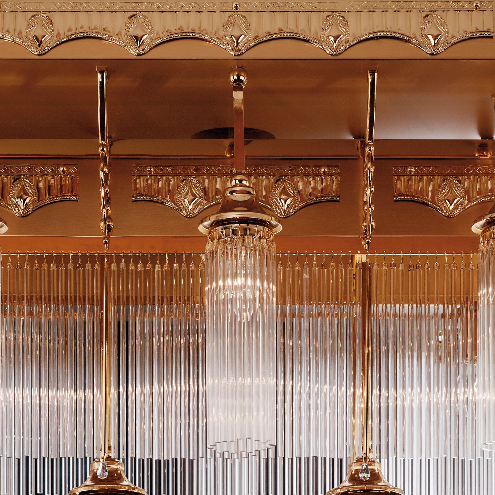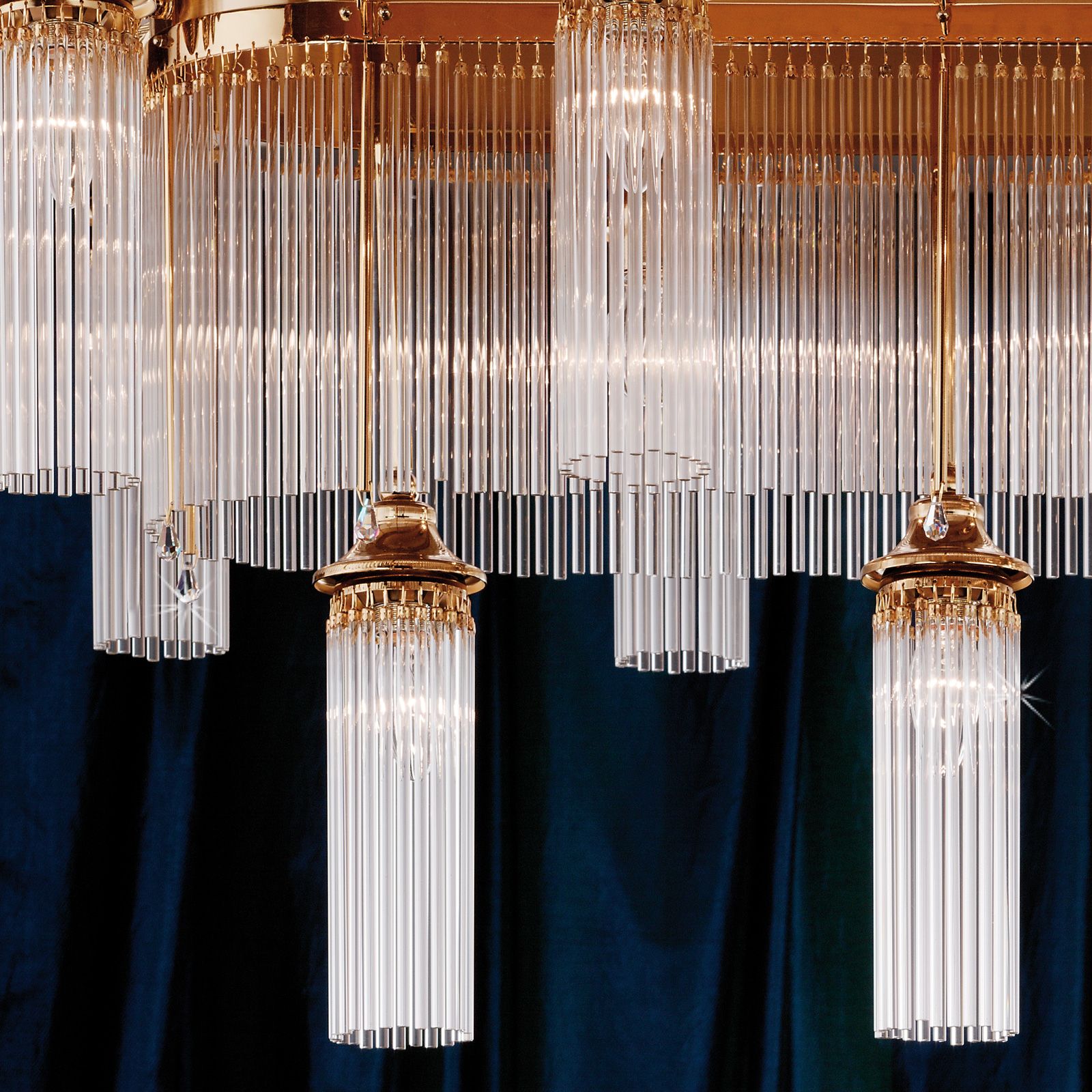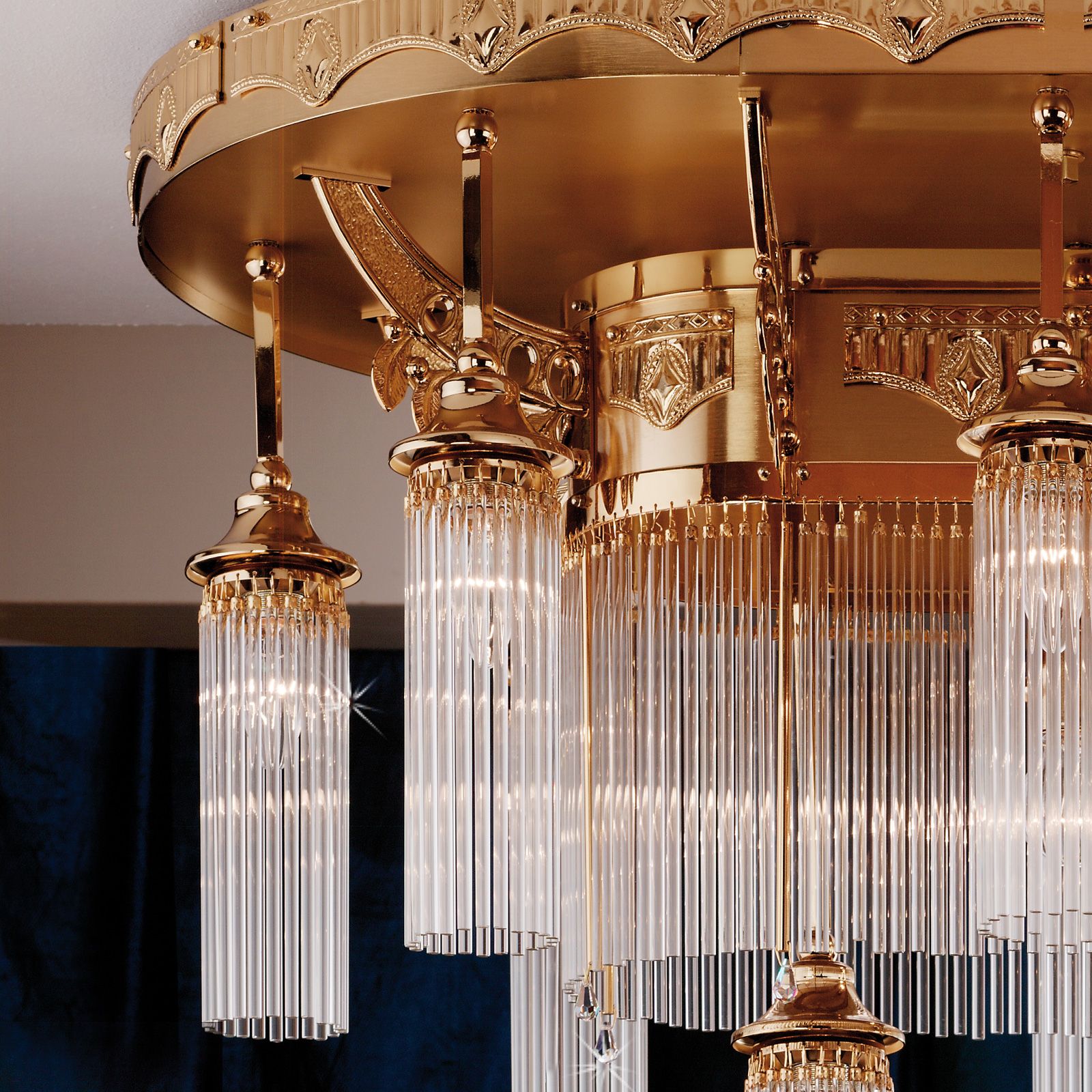 Der 16-flammige Deckenluster aus der ADELE-Reihe ist eine Schöpfung im Stile des Fin de Siècle. Das Ende einer Epoche und der Anfang einer neuen spiegeln sich in den Gestaltungselementen wider. Historistische Zitate der Antike wie die umlaufenden Friese und die an antike Säulen erinnernden Arme paaren sich mit der optimistischen Sachlichkeit der Moderne. Gerade Linien und freudvolle Jugendstilverzierungen weisen in die Zukunft. Große Salons oder Wohnzimmer, Foyers, Empfangsräume bedürfen einer warmen, einladenden Atmosphäre, die mit diesem Luster mit Sicherheit gewährleistet ist. Der Deckenluster ist mit 16 E14-Fassungen zu je maximal 40 Watt und 3 E27-Fassungen zu je maximal 60 Watt ausgestattet.