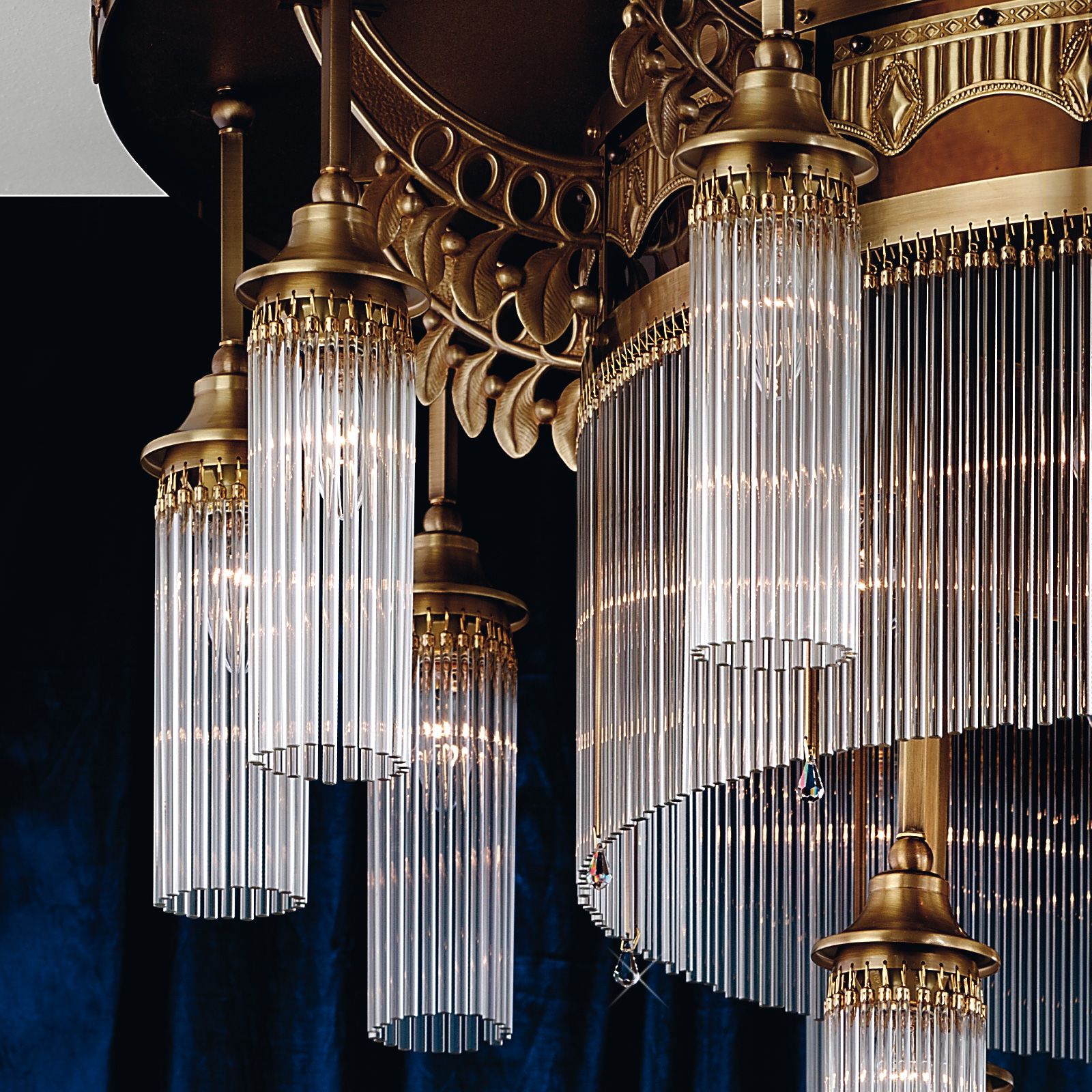 Um ihre volle Pracht erleben zu können, benötigt die Jugendstil-Deckenleuchte ADELE mit einem bemerkenswerten Durchmesser von 120 Zentimetern Raum zur Entfaltung. Wer das Glück hat, einen Ballsaal sein eigen nennen zu können, ein Jugendstil-Kaffeehaus mit großem Gästeraum, ein Hotel mit Gästelobby oder einen besonders großen Konferenzraum, der sollte den Deckenluster aus der Reihe ADELE in Betracht ziehen. Diese 25-flammige Leuchtenkomposition zieht jeden Blick auf sich. Ein Kranz aus schalenförmigen Einfassungen, Blattwerk, Glasstäbchen, Messingverzierungen vereinigt sich unter einem mattgoldenen Baldachin unter der Decke. Die Flammen erinnern an Planeten, die unter dem Himmelszelt um das imposante Lichtzentrum kreisen.