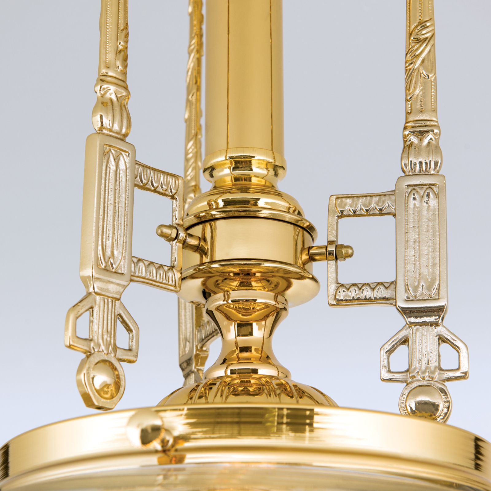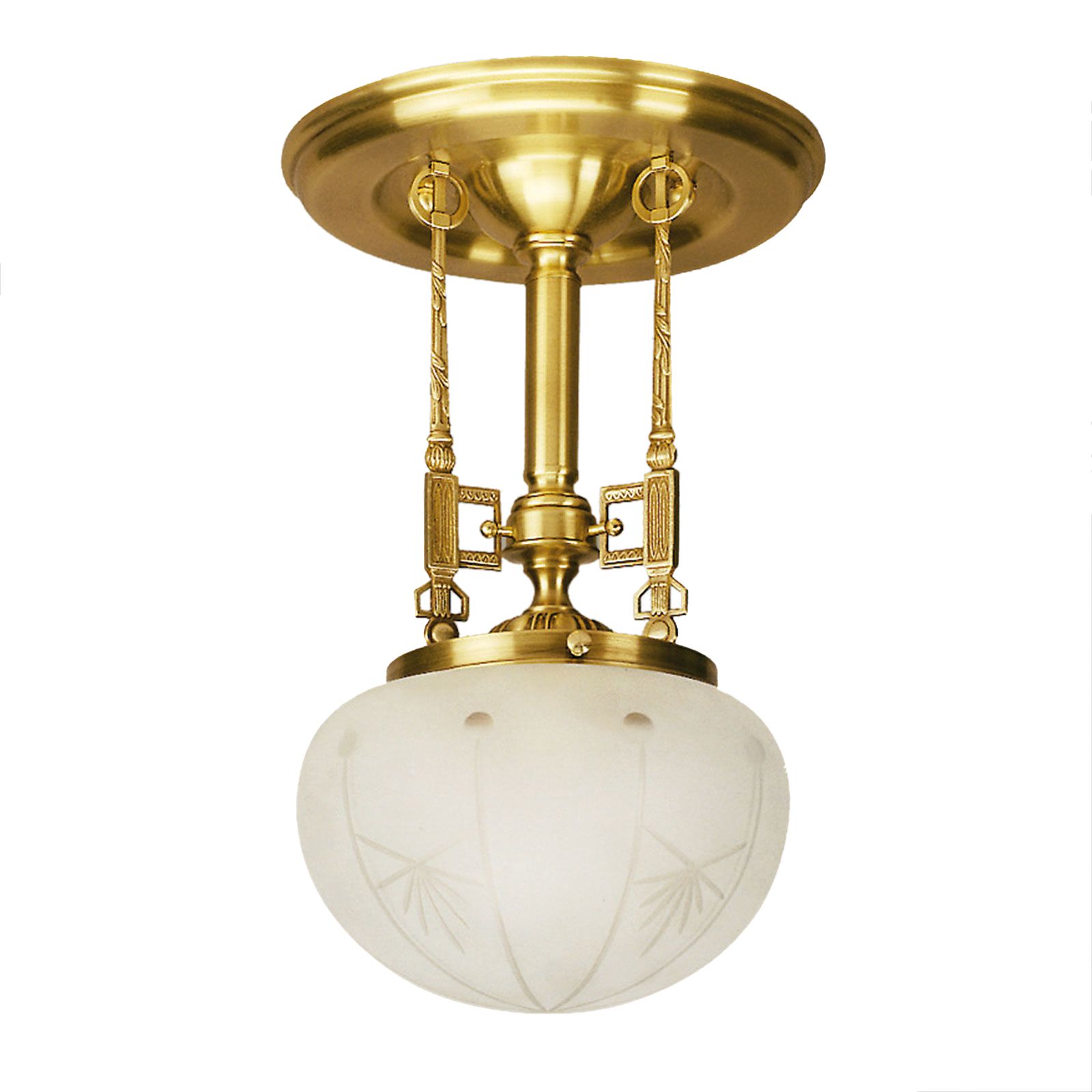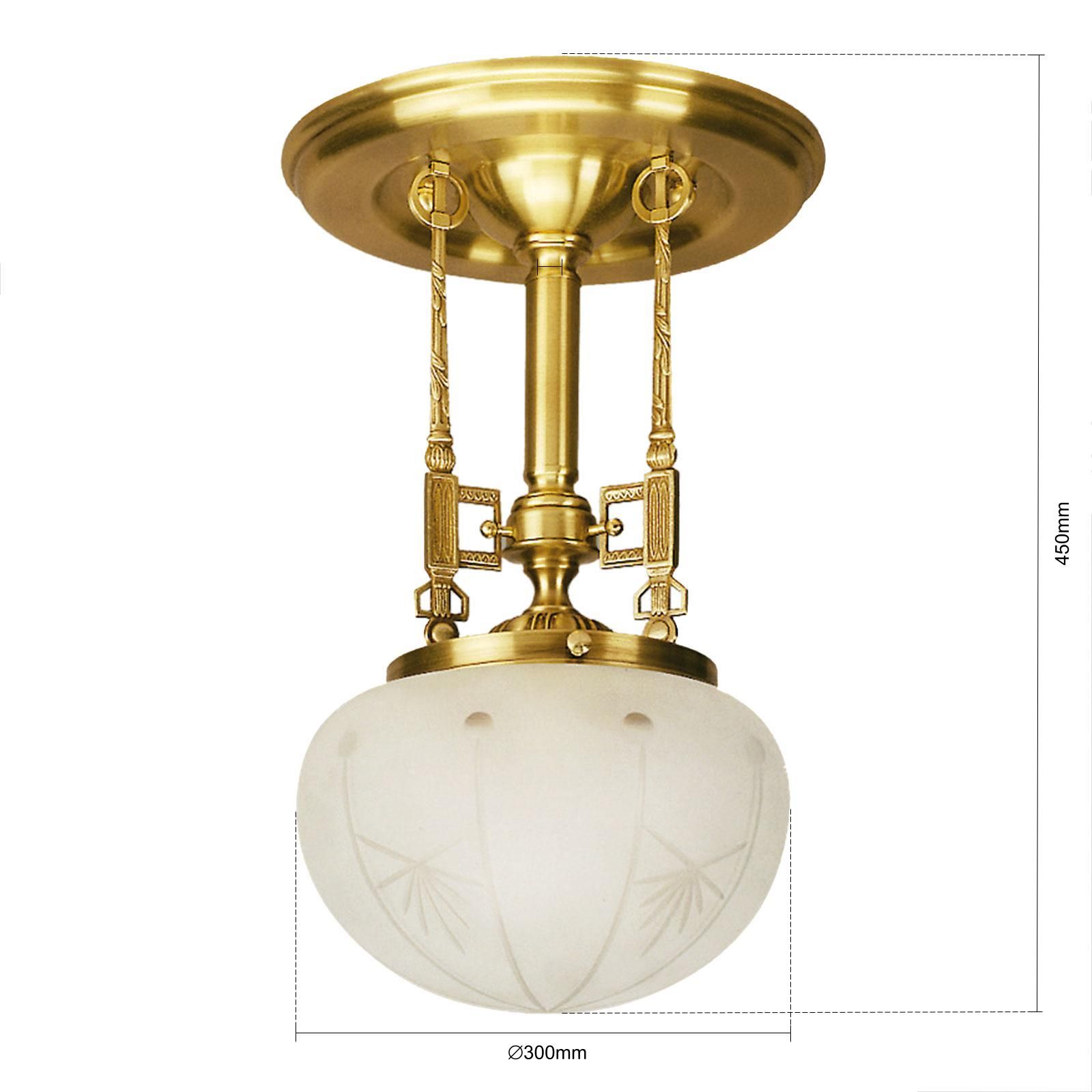 Die Stileinflüsse des 1-flammigen Deckenluster aus der Kollektion BUDAPEST sind unverkennbar. Jugendstil und besonders die Wiener Ausprägung vereinigt sich mit barocker Liebe zur Verzierung: Blattwerk, Kordeln, Quasten, Kränze, Lyren stellen ein Panoptikum europäischer Ornamentik dar. Der ovale Schirm bringt die idealen Eigenschaften für eine Deckenleuchte mit: Abwärts gerichtet wird eine möglichst breite Fläche rundum ausgeleuchtet. Die Veredelung des Messinggestells schafft zudem facettenreiche Lichtspiegelungen. Ein Schlafzimmer mit niedriger oder abgehängter Decke bietet sich für diese Leuchte an. Ebenso zu empfehlen ist sie für die Montage über einem Esstisch oder in einem Vorraum oder Gang. Der Luster ist mit einer E27-Fassung für bis zu 60 Watt versehen.