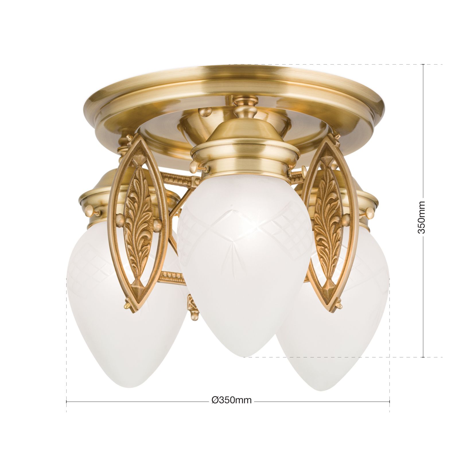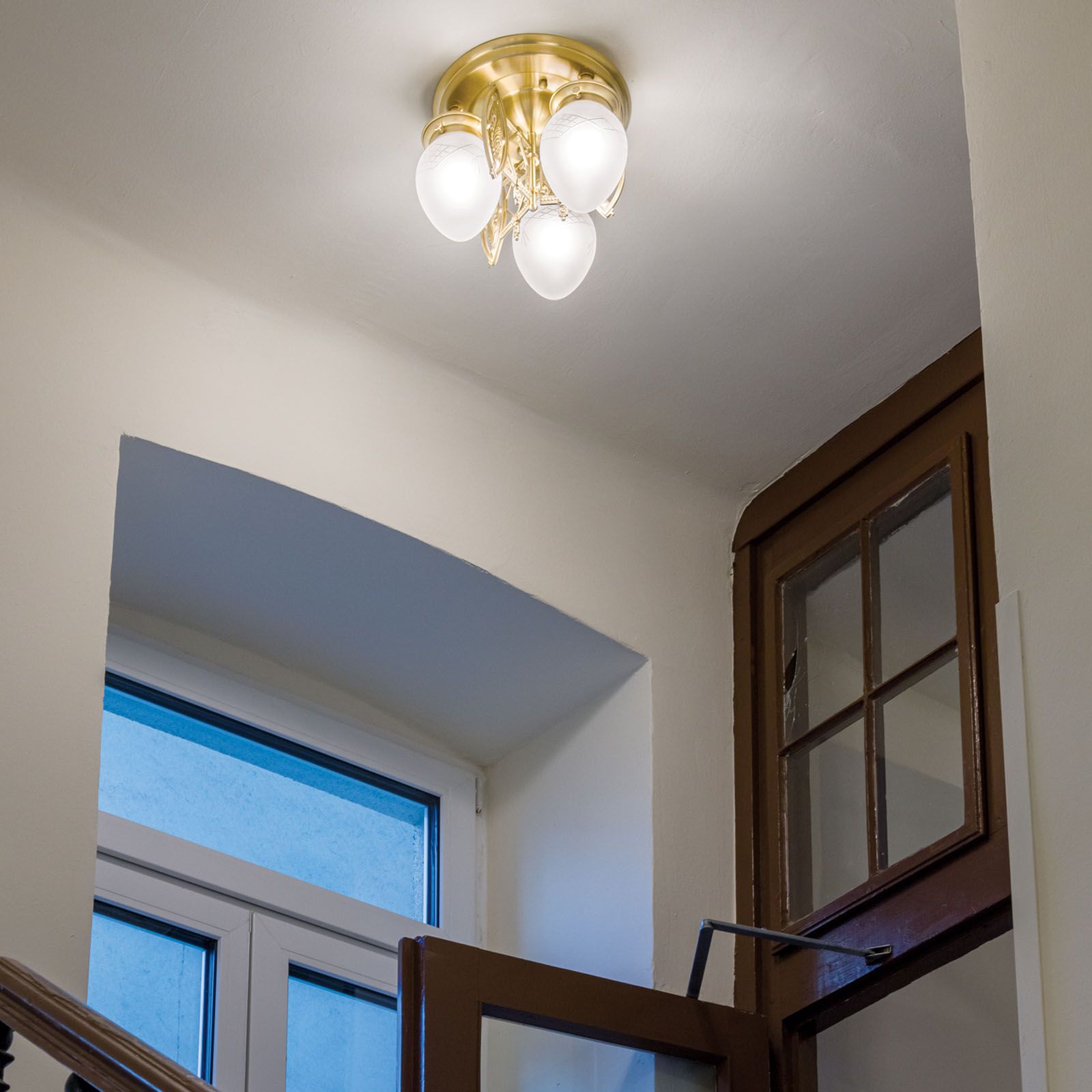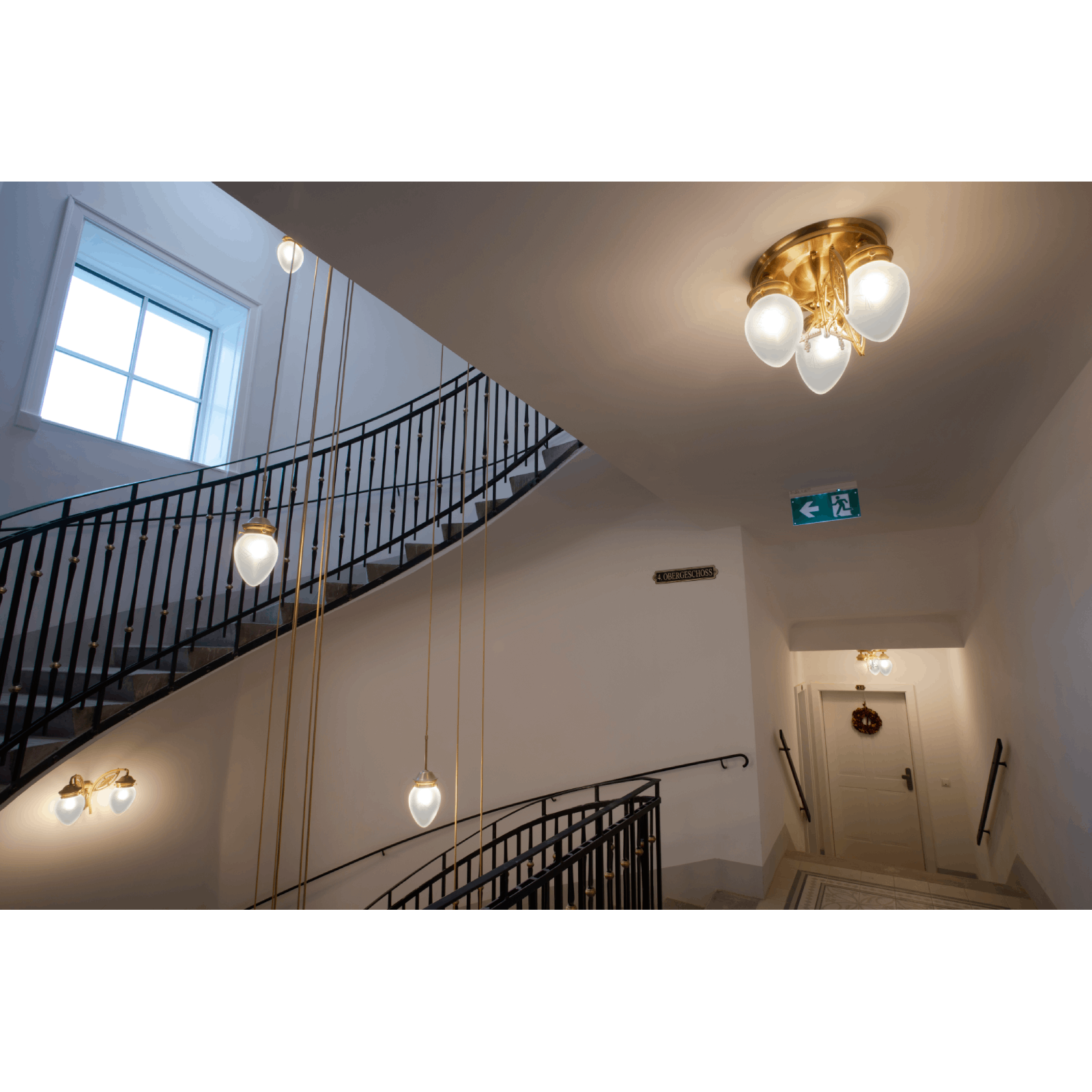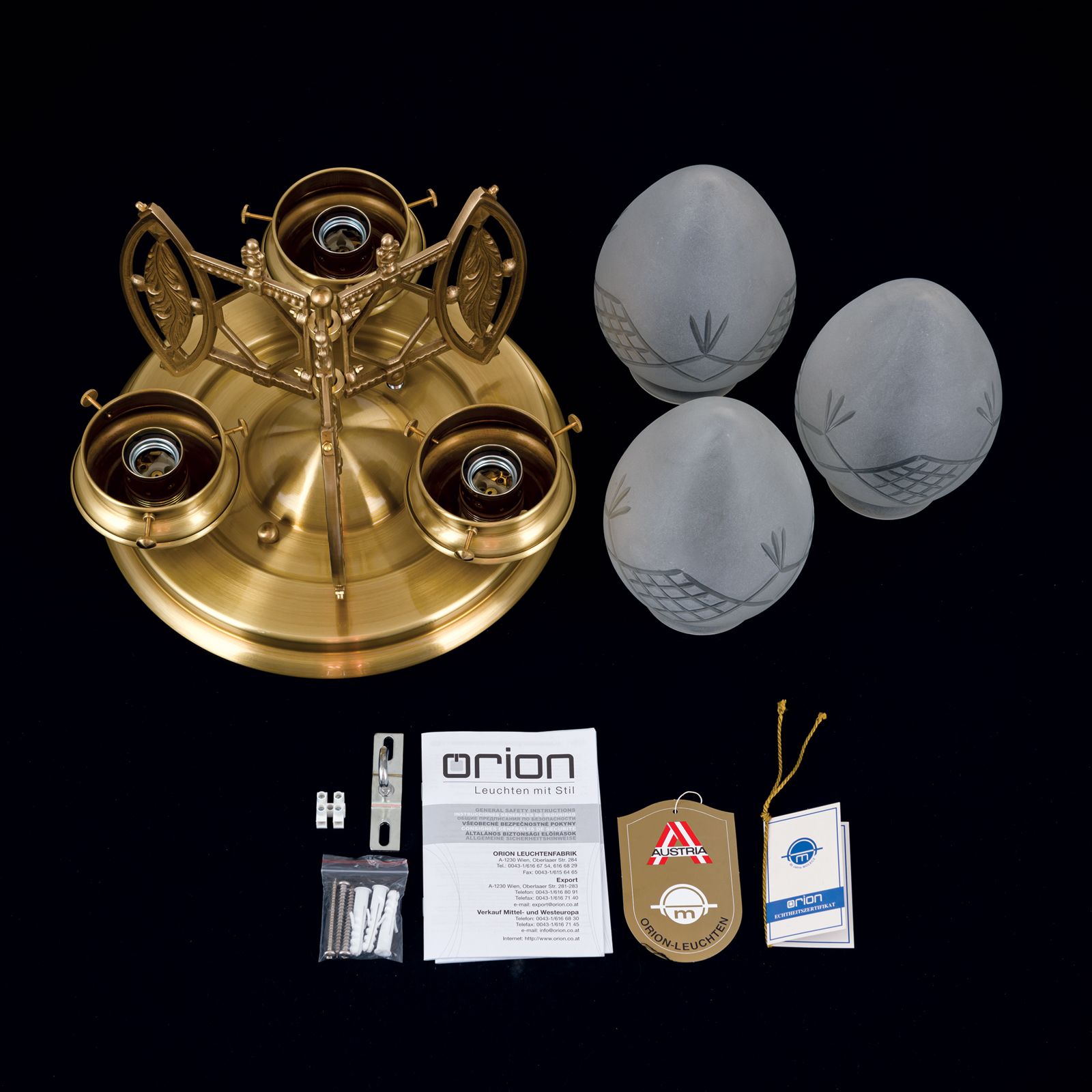 Der 3-flammige Deckenluster aus der BUDAPEST-Reihe besticht durch die detailverliebten Messingarbeiten. Die Glasschirme mit Gravuren aus der ungarischen Ornamentik scheinen durch mandelförmige Paravents getrennt. Farnmotive zieren diese Dekorelemente. Stege mit antikisierenden Relieffriesen führen zum zentralen Schaft. Die Rosette ist einem griechischen Säulensockel nachempfunden. Dieser für den magyarischen Jugendstil typische Stilmix prädestiniert diesen Deckenluster für eigene Stilexperimente. In einem Wohnzimmer passt er ebenso zu Bugholzmöblierung wie zu historisierenden Interieurs. Die Deckenleuchte verfügt über drei E27-Fassungen für je bis zu 60 Watt.