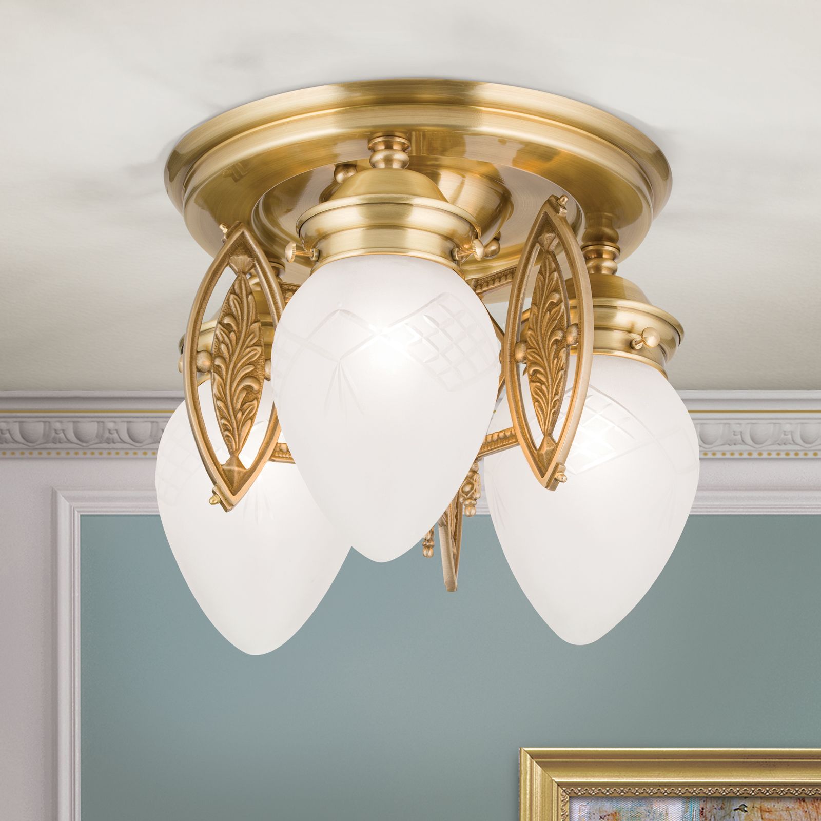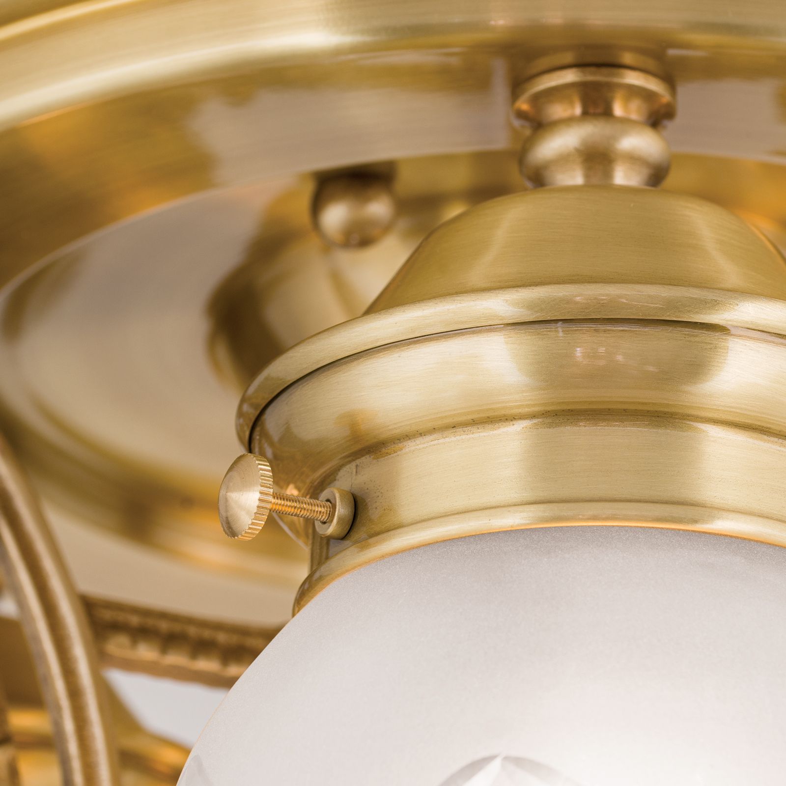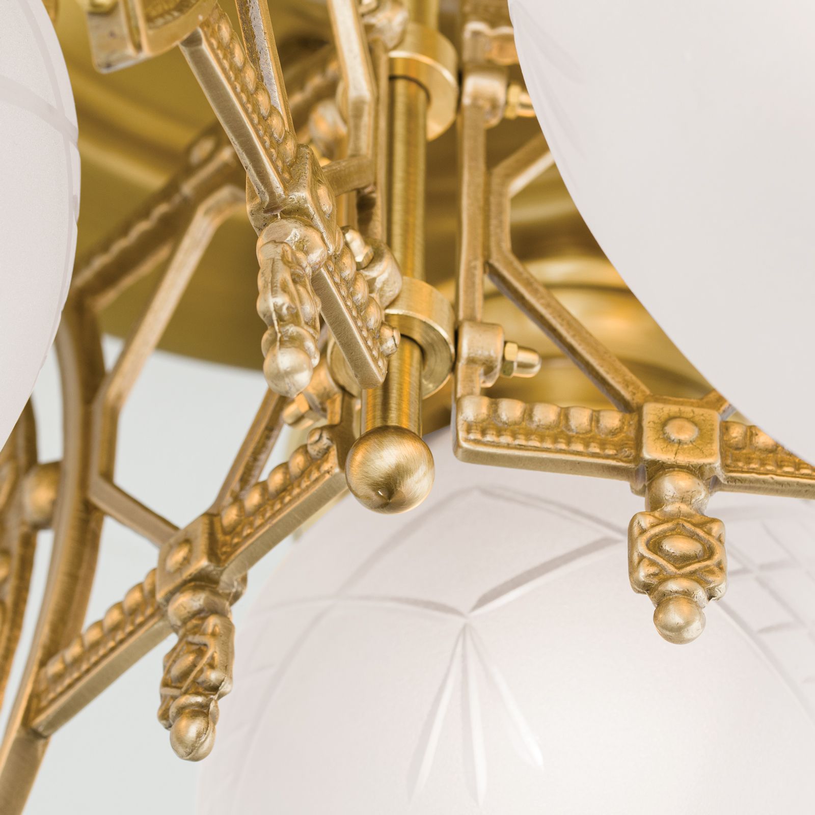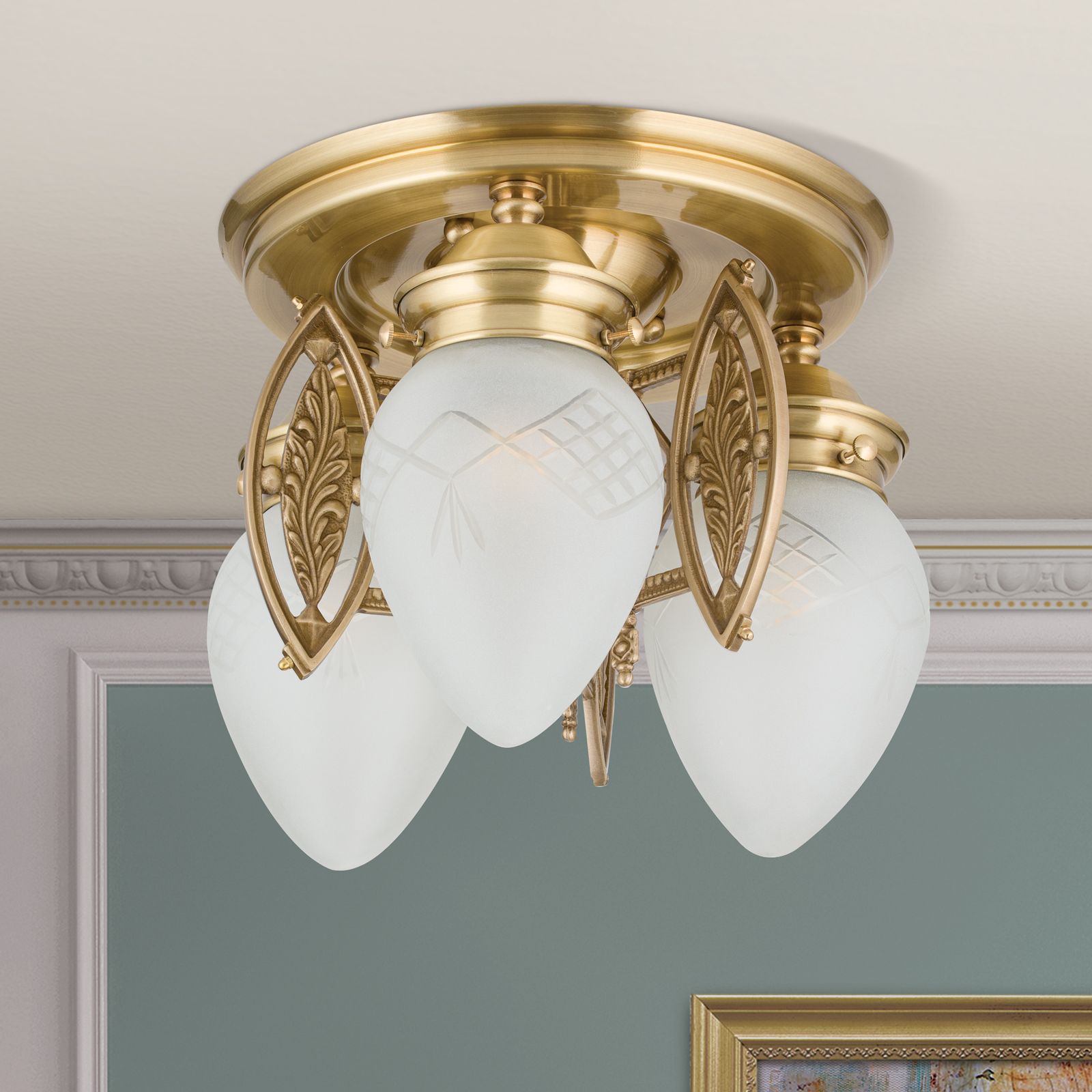 Der 3-flammige Deckenluster aus der BUDAPEST-Reihe besticht durch die detailverliebten Messingarbeiten. Die Glasschirme mit Gravuren aus der ungarischen Ornamentik scheinen durch mandelförmige Paravents getrennt. Farnmotive zieren diese Dekorelemente. Stege mit antikisierenden Relieffriesen führen zum zentralen Schaft. Die Rosette ist einem griechischen Säulensockel nachempfunden. Dieser für den magyarischen Jugendstil typische Stilmix prädestiniert diesen Deckenluster für eigene Stilexperimente. In einem Wohnzimmer passt er ebenso zu Bugholzmöblierung wie zu historisierenden Interieurs. Die Deckenleuchte verfügt über drei E27-Fassungen für je bis zu 60 Watt.