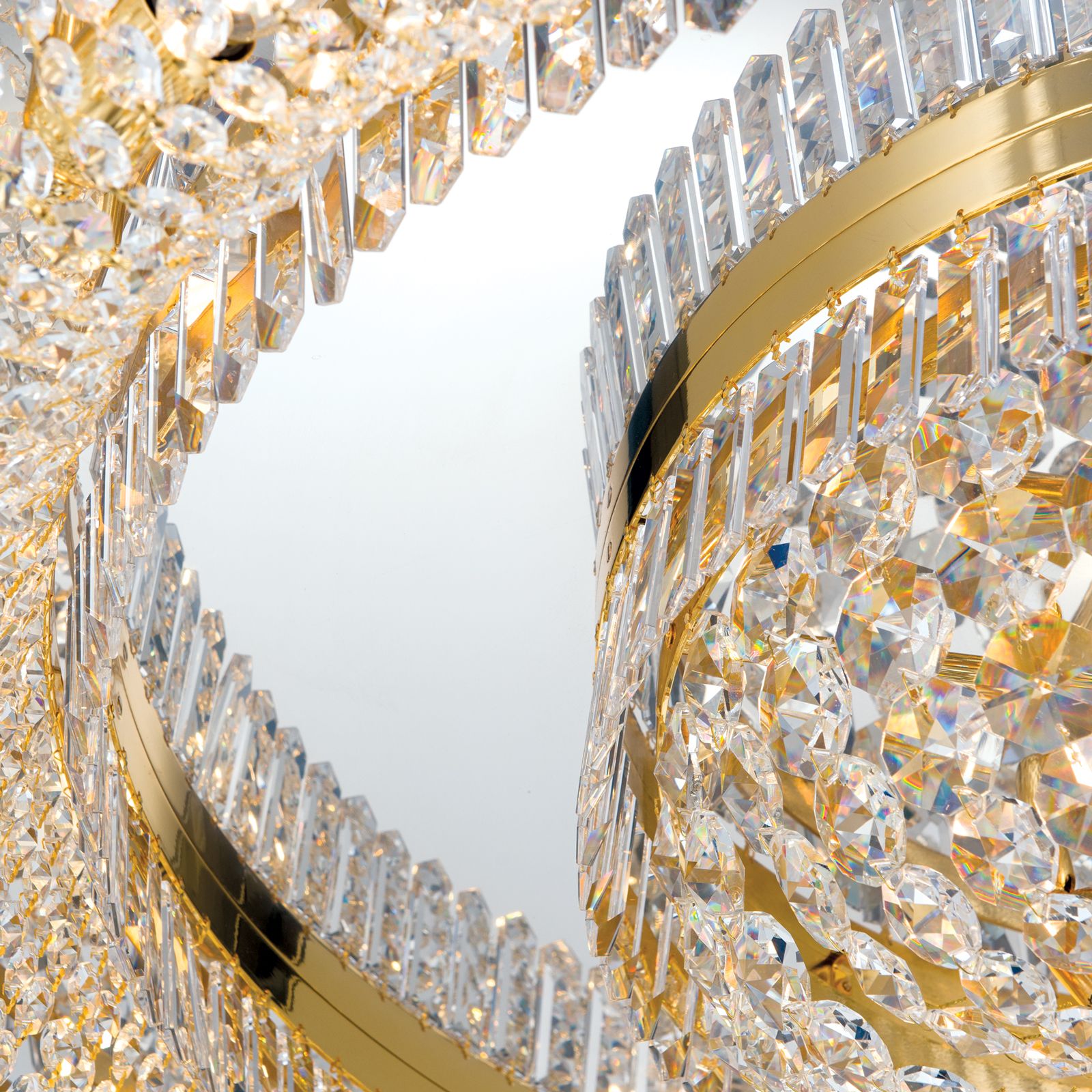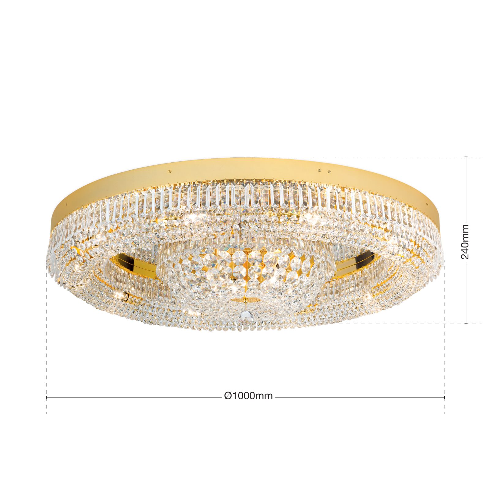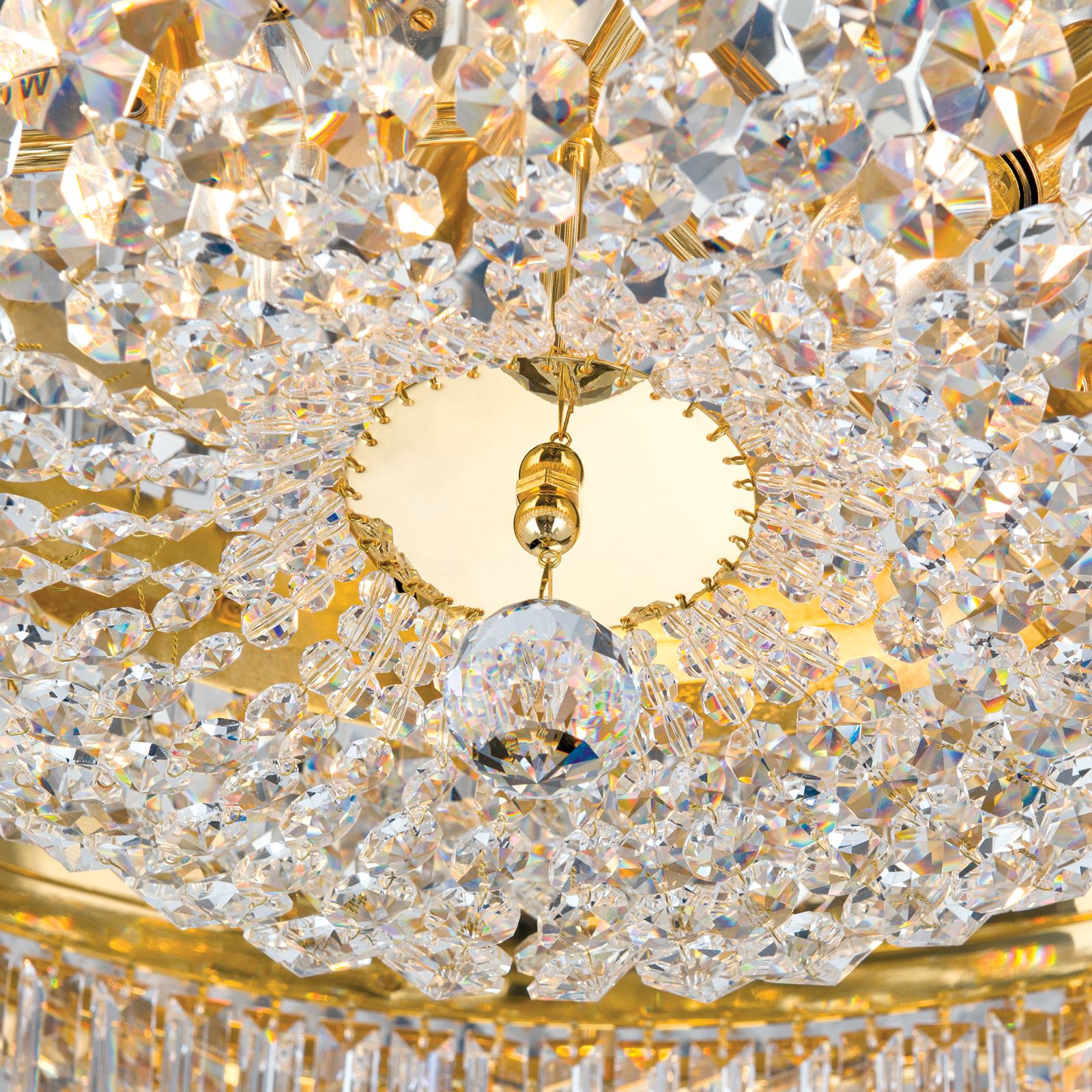 An der 24 Karat vergoldeten Messingplatte sind ein zentraler und äußerer Kristallring befestig. Der Kristallbehang legt sich einem Vorhang gleich über die 13 Leuchtmittel in den E14-Fassungen, die mit maximal 40 Watt bestückt werden können. Die glänzende Oberfläche der Zierplatte intensiviert das Glitzern und Funkeln der vielen Kristalle, die einzigartige Lichtreflexionen erzeugen und für ein außergewöhnliches Erlebnis sorgen.