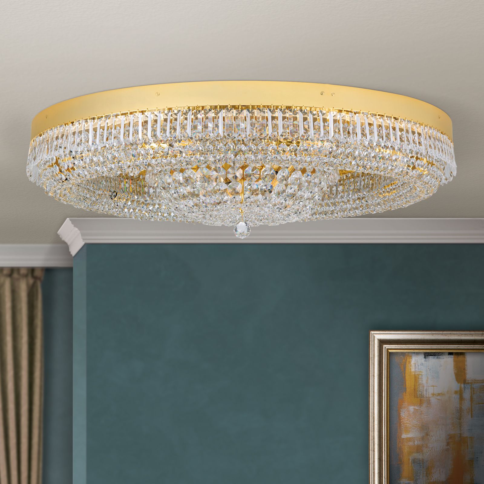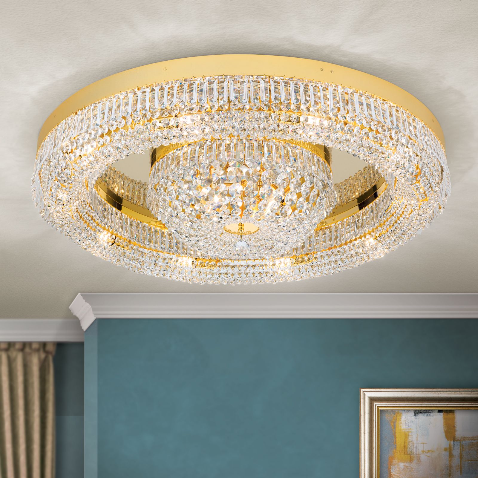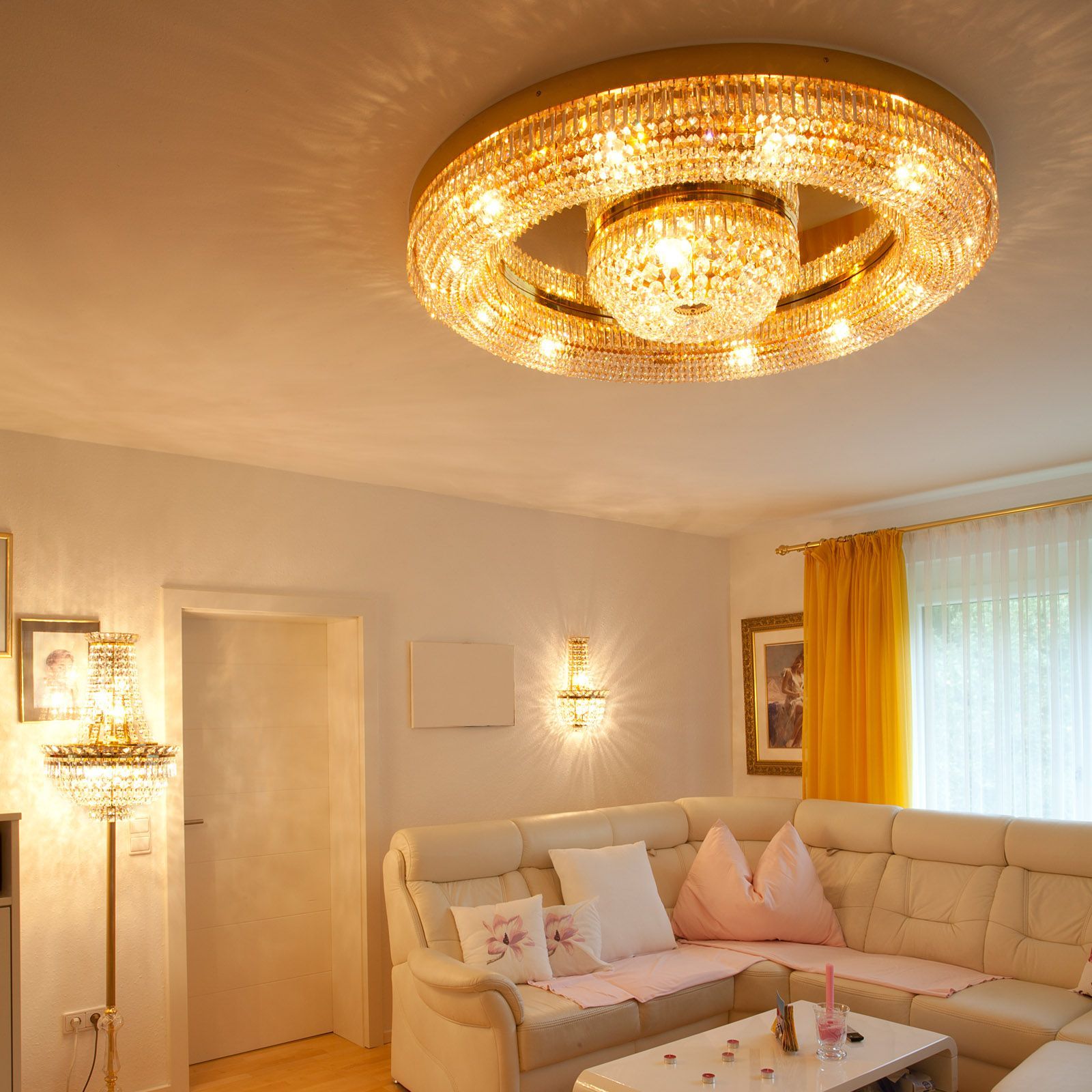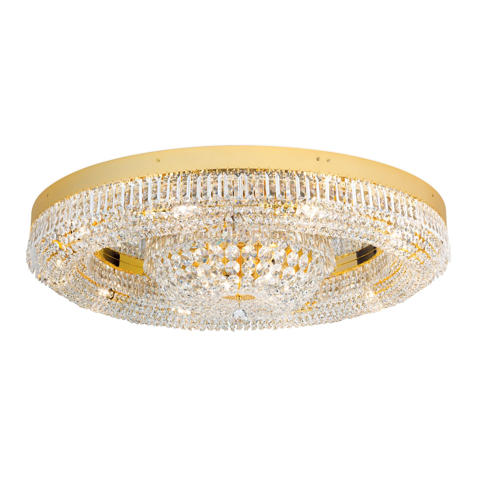 An der 24 Karat vergoldeten Messingplatte sind ein zentraler und äußerer Kristallring befestig. Der Kristallbehang legt sich einem Vorhang gleich über die 13 Leuchtmittel in den E14-Fassungen, die mit maximal 40 Watt bestückt werden können. Die glänzende Oberfläche der Zierplatte intensiviert das Glitzern und Funkeln der vielen Kristalle, die einzigartige Lichtreflexionen erzeugen und für ein außergewöhnliches Erlebnis sorgen.