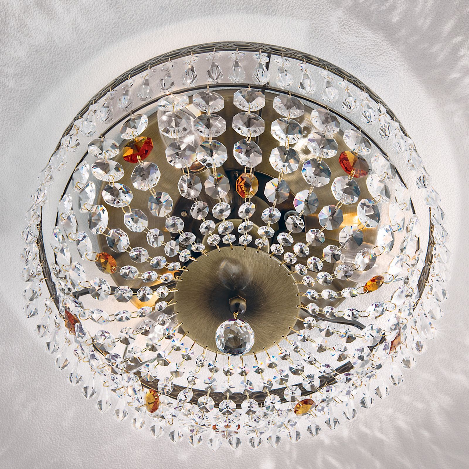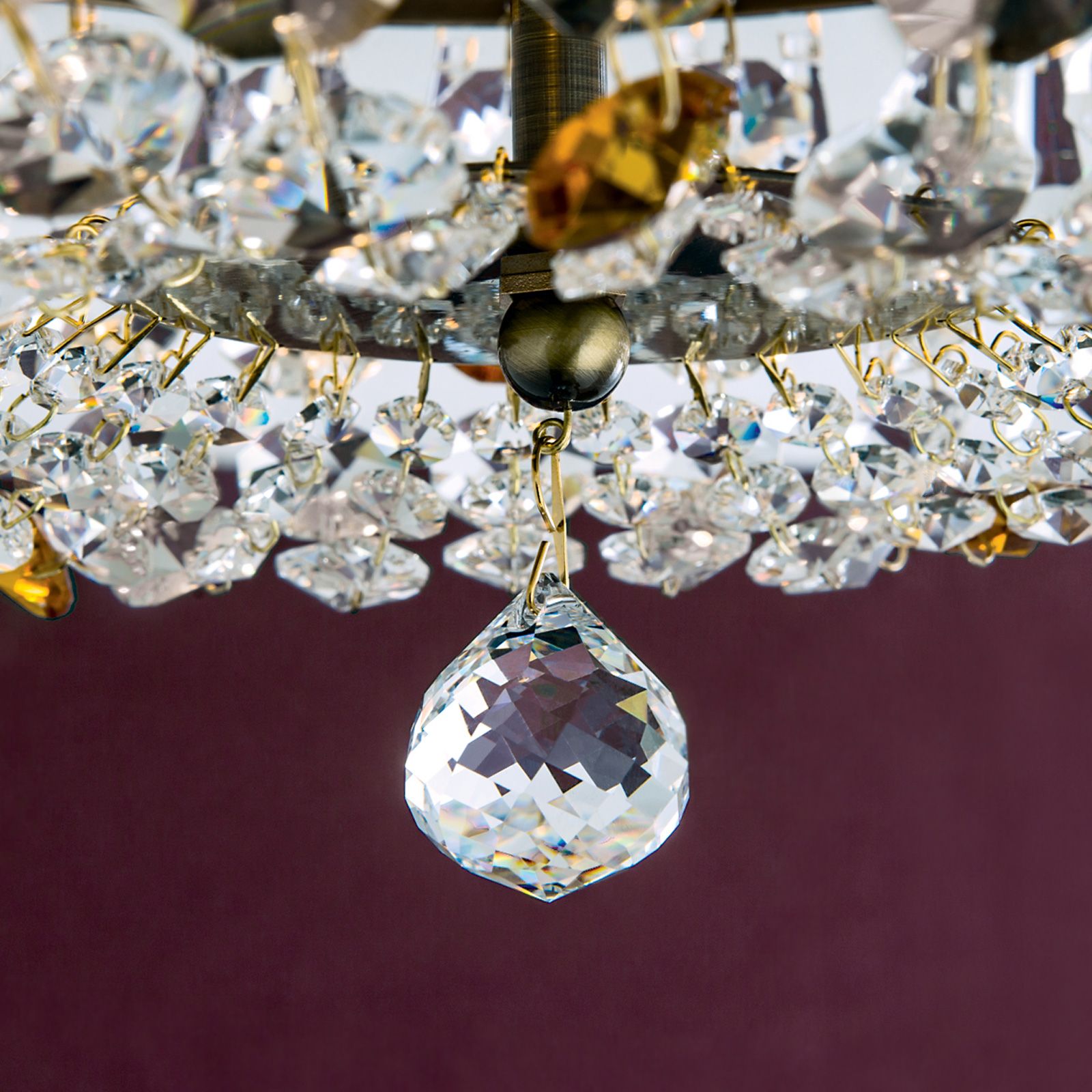 Das Leuchtengestell besteht aus Vollmessing und ist mit einer handschattierten Patina versehen. Ein kunstvoll verzierter Metallring trägt eine Vielzahl an Koppen und tropfenförmigen Kristallen. Zu Ketten verbundene Kristalle bilden ihren Schirm und werden in der Mitte durch eine verspiegelte Zierplatte zusammengeführt. Diese wird durch eine große herabhängende Kristallkugel geschmückt. Vereinzelt eingearbeitete bernsteinfarbene Kristalle verleihen ihr einen farbigen Akzent und sorgen gleichzeitig für eine farbliche Verbindung zur Montur. Mithilfe eines externen Dimmers kann die Leuchte in ihrer Helligkeit reguliert werden. Hinter dem Kristallbehang befinden sich die 3 E14-Fassungen, die mit maximal 40 Watt je Fassung bestückt werden können.
