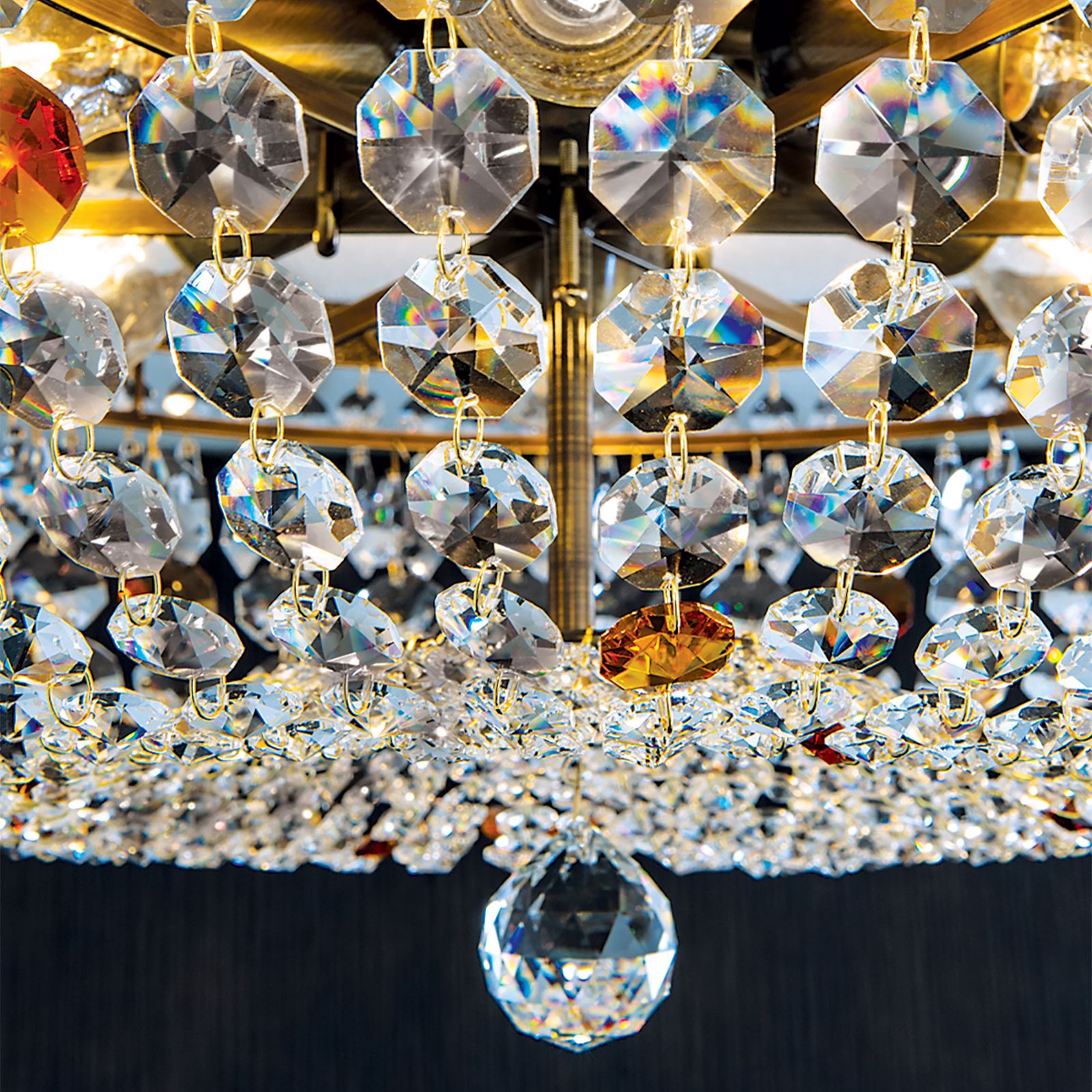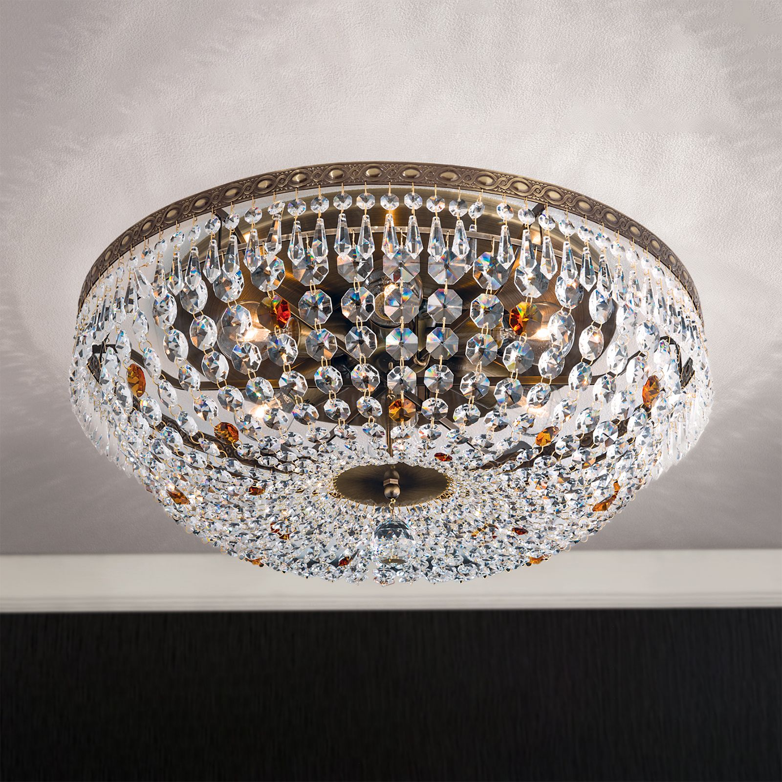 Mit seinem Gestell aus Vollmessing in handschattiertem Patina macht ein kunstvoll verzierter Metallring den Anfang, welcher mit Kristallen in Koppen- und Tropfenform bestückt ist. Ein weiterer Ring, der sich hinter dem beschriebenen Kristallbehang versteckt, trägt viele weitere Kristalle, die zu Ketten verbunden sind und mittig zu einer Metallplatte laufen. Für den großen Wow-Effekt sorgt eine facettierte Kristallkugel, welche an der verspiegelten Zierplatte befestigt ist und zu schweben scheint. Ein weiteres Merkmal sind die amberfarbenen Kristalle, die vereinzelt zu finden sind. Ausgestattet mit 6 E27-Fassungen wird die Leuchte mit maximal je 60 Watt betrieben und kann so auch größere Räume mit einer dekorativen Grundbeleuchtung versorgen.