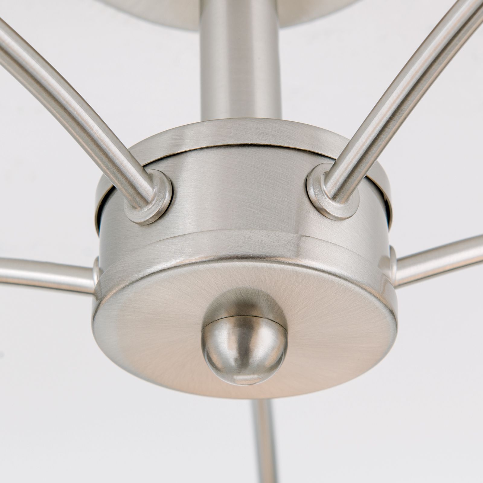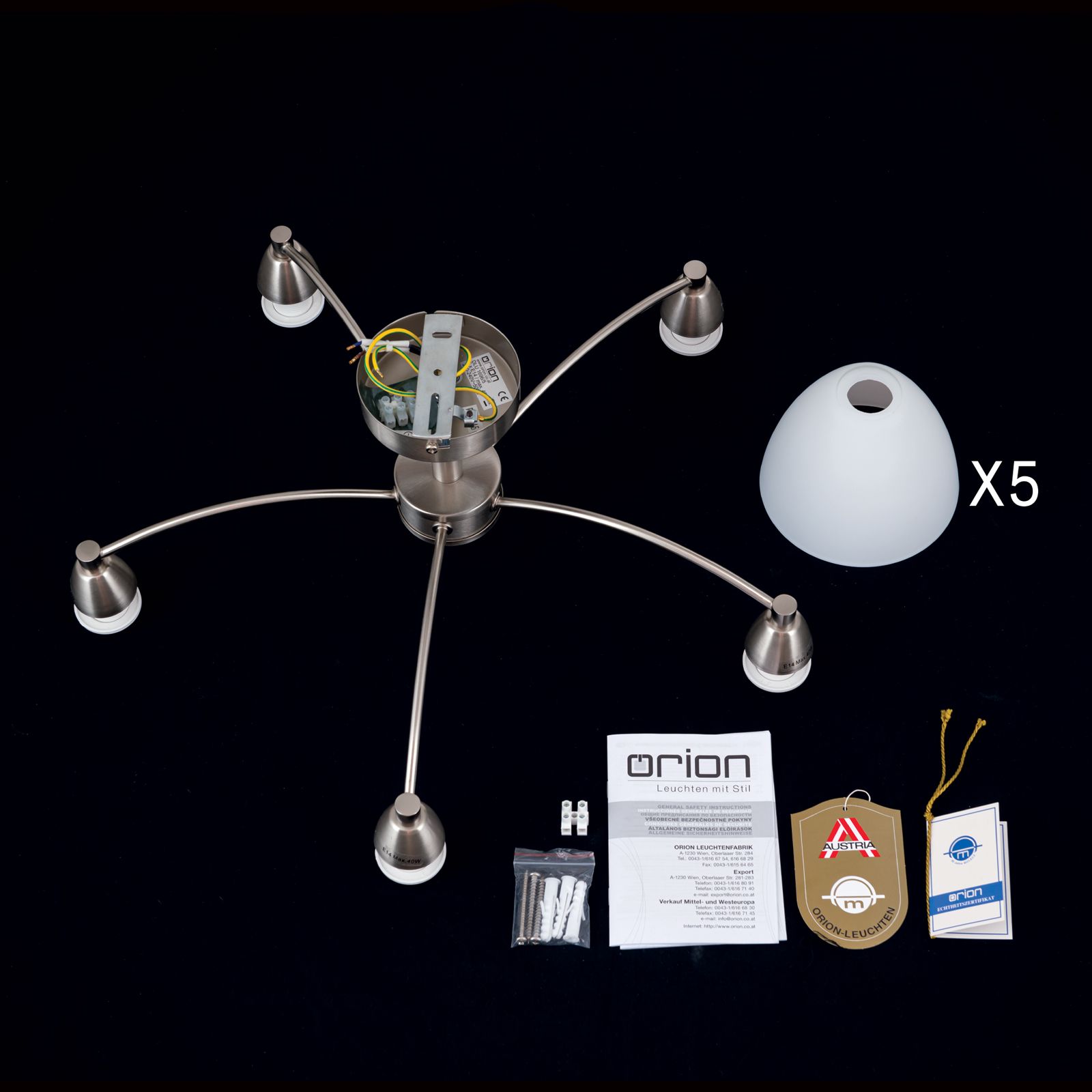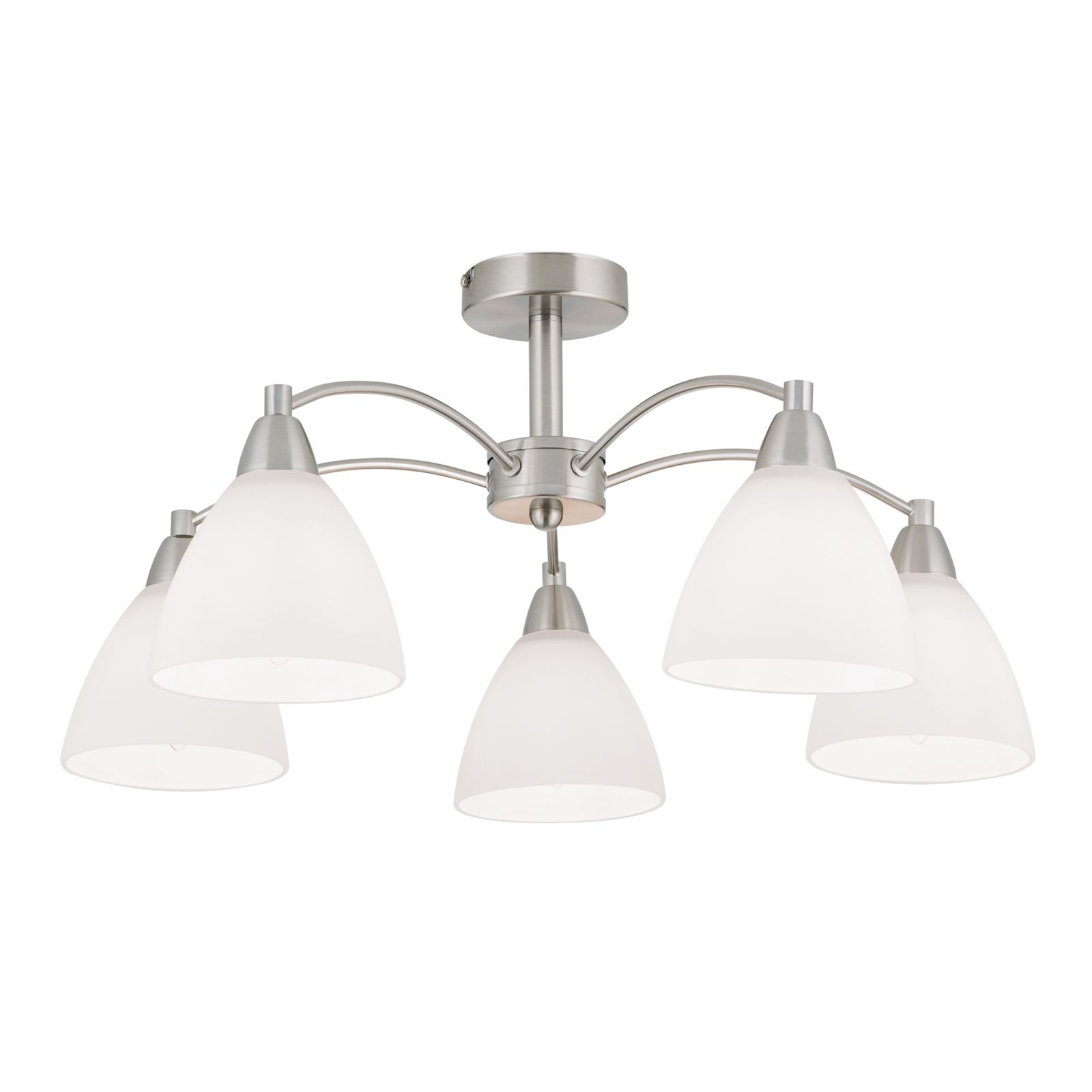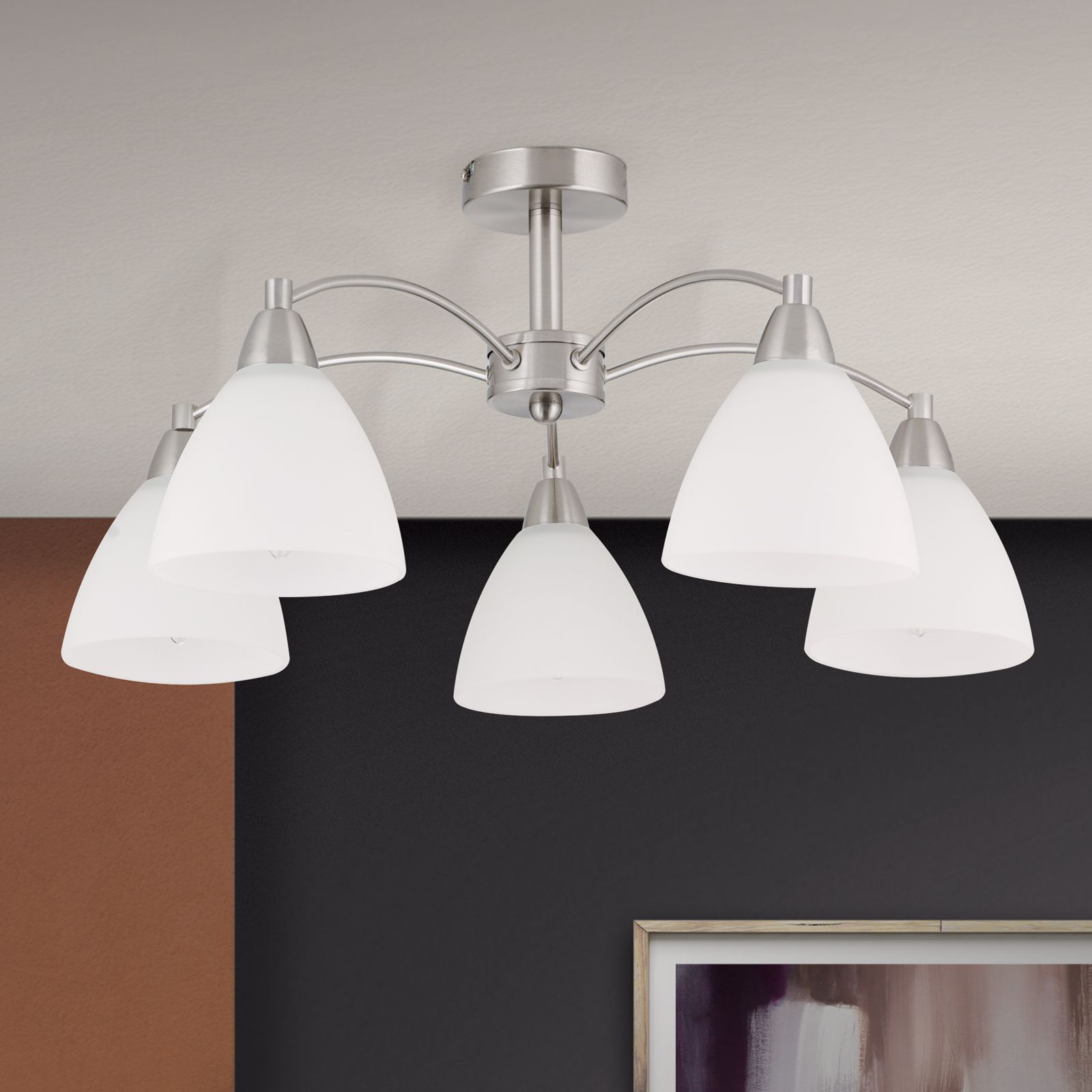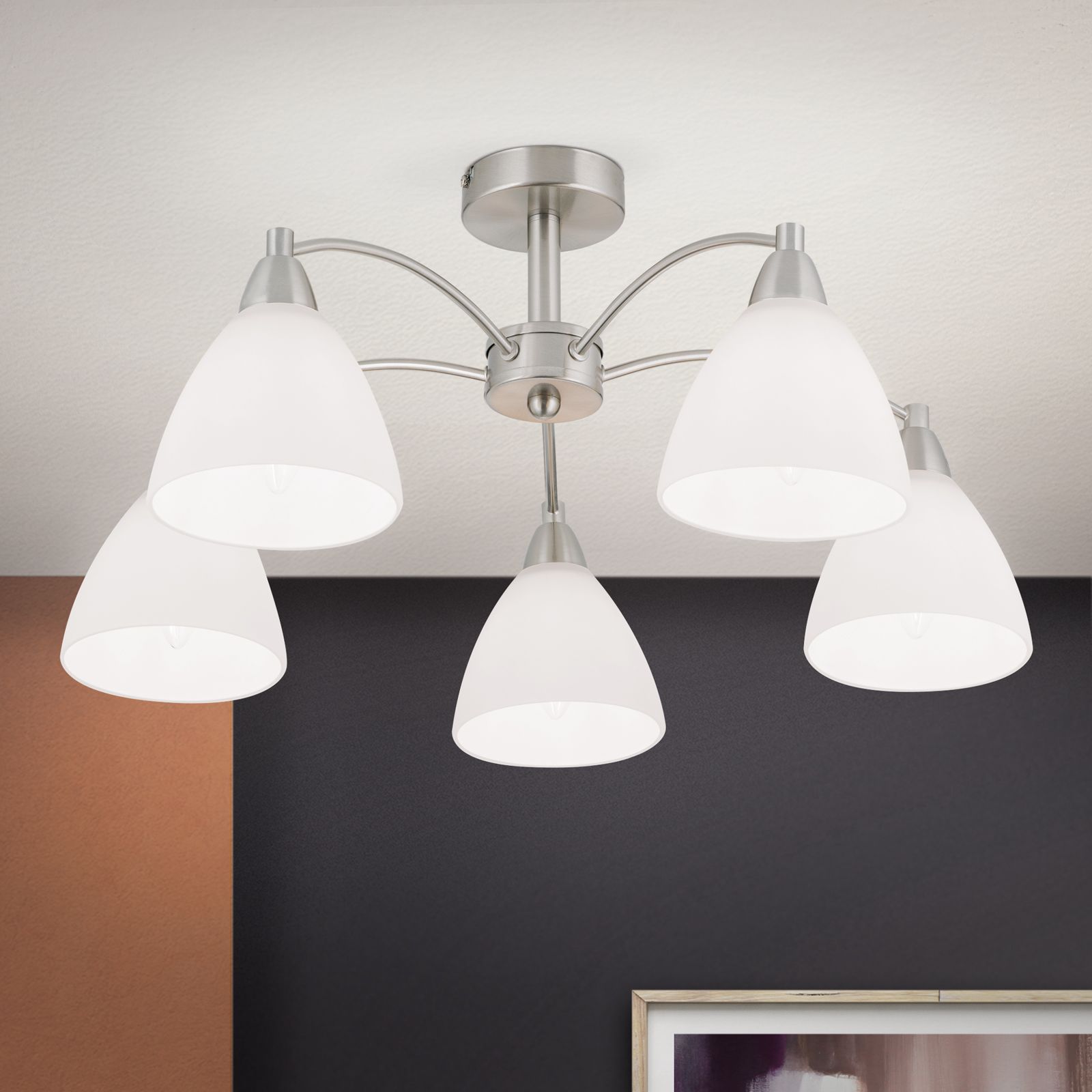 Die 5-flammige Deckenleuchte aus der SUSAN-Serie überzeugt durch ihre klare Linienführung. Durch dieses stimmige Design passt der Leuchtkörper in moderne Wohneinrichtungen ebenso wie in ein gemütliches Ambiente. Die kelchförmigen Glasschirme strahlen das Licht senkrecht ab, streuen es aber auch seitlich in die Umgebung ab. So ergibt sich eine wohlige Lichtstimmung in einem Wohn- oder Esszimmer. Mit einer Höhe von nur 28 Zentimetern eignet sich diese Art der Deckenleuchte auch für Räume mit niedrigerer Deckenhöhe. Fünf E14-Fassungen liefern jeweils bis zu 40 Watt Leistung. Energieeffiziente LED-Lampen in Kerzenform helfen Energie und Geld zu sparen und eine gute Helligkeit auch in größeren Räumen zu gewährleisten.