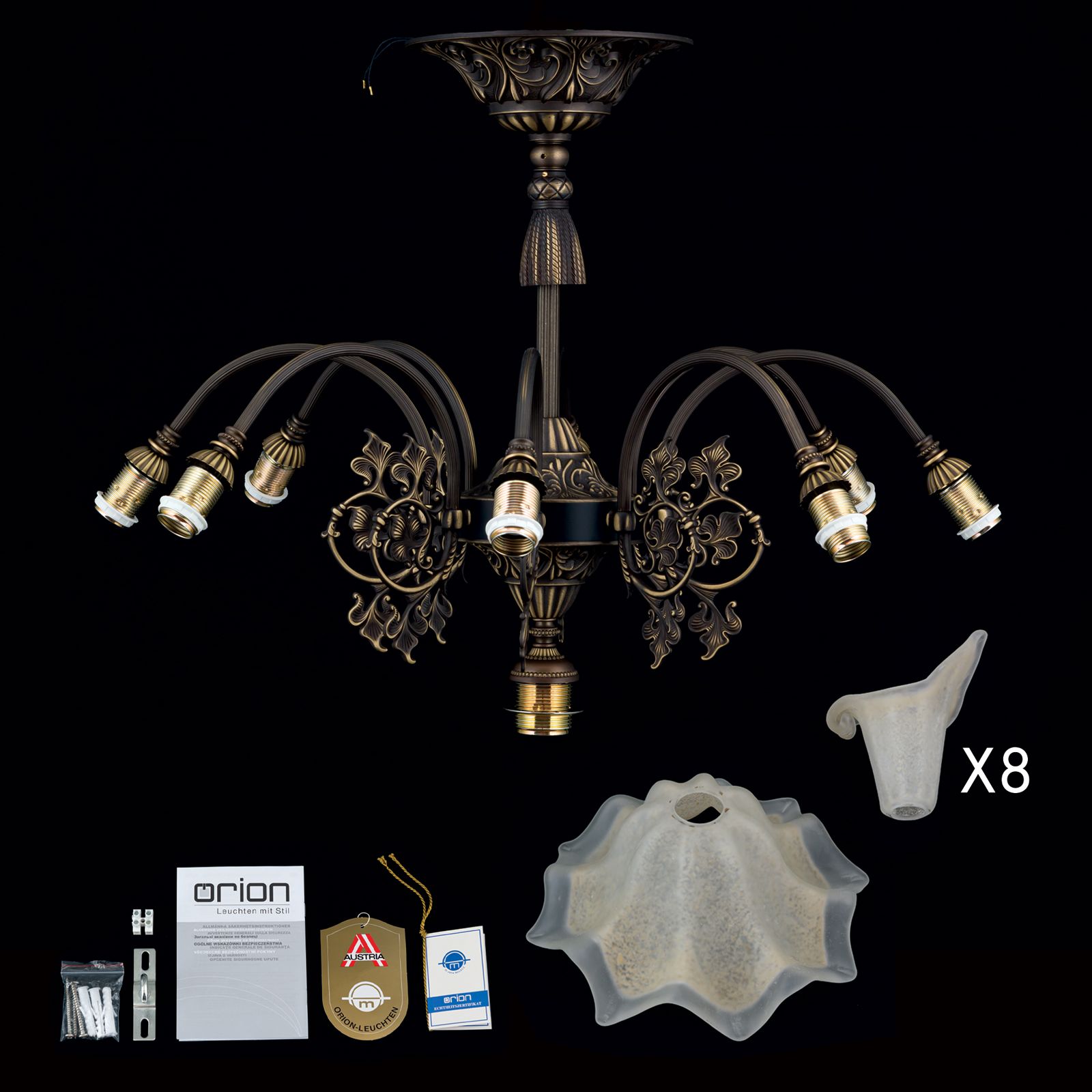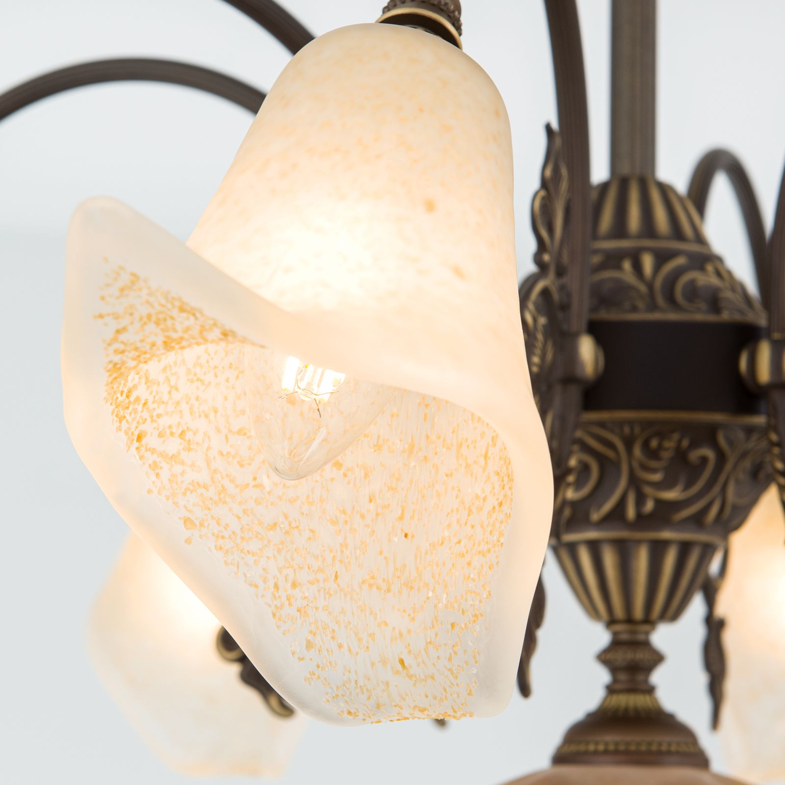 Die Serie TOSCA verschreibt sich einem verspielt-romantischen Historismus. Der 9-flammige Deckenluster aus dieser Kollektion stellt eine stilistische Verbindung zwischen Barock und Manierismus dar. Die Arme sind als kraftvolle Bogen ausgebildet, ganz im Stile flämischer Luster. Die Glasschirme in Blütenkelchform bringen eine träumerische Note in die Komposition. Ein großes Wohnzimmer mit Deckenhöhen jenseits der drei Meter wird dank der satinierten Glasschirme in ein gleichmäßig weiches Licht getaucht. Die zentrale Glasblüte setzt einen weiteren zentralen Lichtakzent. Die Leuchte wird über acht E14-Fassungen mit je bis zu 40 Watt und eine E27-Fassung für bis zu 60 Watt betrieben.