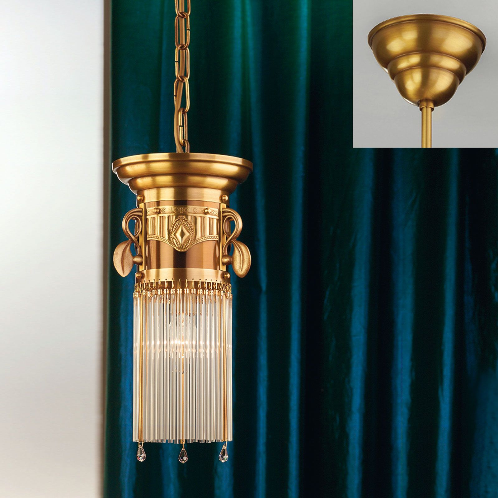Das Leben als Gesamtkunstwerk - so kann man die Grundhaltung der Künstler der Wiener Secession beschreiben. Das umfasst neben den bildenden Künsten auch das Kunsthandwerk. Der Wert einer Leuchte liegt natürlich in erster Linie im Nutzen als Lichtspender. Dem trägt die Hängeleuchte aus der ADELE-Serie Rechnung, in dem Vollglasstäbchen sich gleichsam mit Licht füllen und es durch die Leichtigkeit und Klarheit ihrer Linien in den Raum fließen lassen. Die Bedeutung, die der Schönheit beigemessen wird, verdeutlicht sich in Reliefzierbändern, Rankwerk und dem einer griechischen Säule nachempfundenen Sockel. Die Leuchte bietet eine warme, punktuelle Beleuchtung in einem Vorraum, über einer Anrichte, in einem stilvoll eingerichteten Wohnzimmer. Eine E14-Fassung für bis zu 40 Watt ist in der Leuchte verbaut.