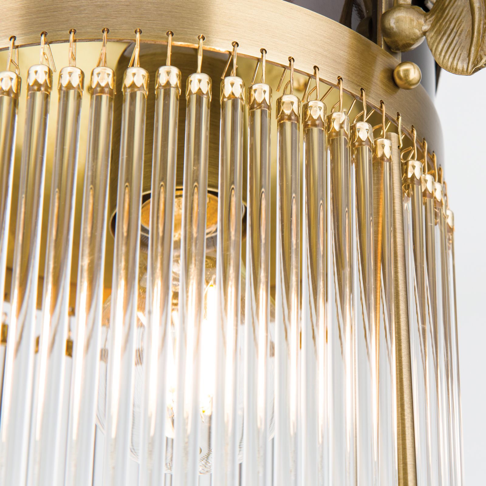 Die Hängeleuchte aus der Reihe ADELE eignet sich dank der feingliedrigen, stilvollen Gestaltung für Ensembles, die sich einer ornamentalen Schönheit verschrieben haben. Die Komposition steht im frühlingshaften Zeichen des Erblühens. Die Messingmontur zieren verschlungenen Ranken und ein kannelierter Fries. Die Vollglasstäbe sind an blütenkelchförmigen Einfassungen aufgehängt. Die Glasröhren füllen sich mit Licht und strahlen mit dem Messing um die Wette.