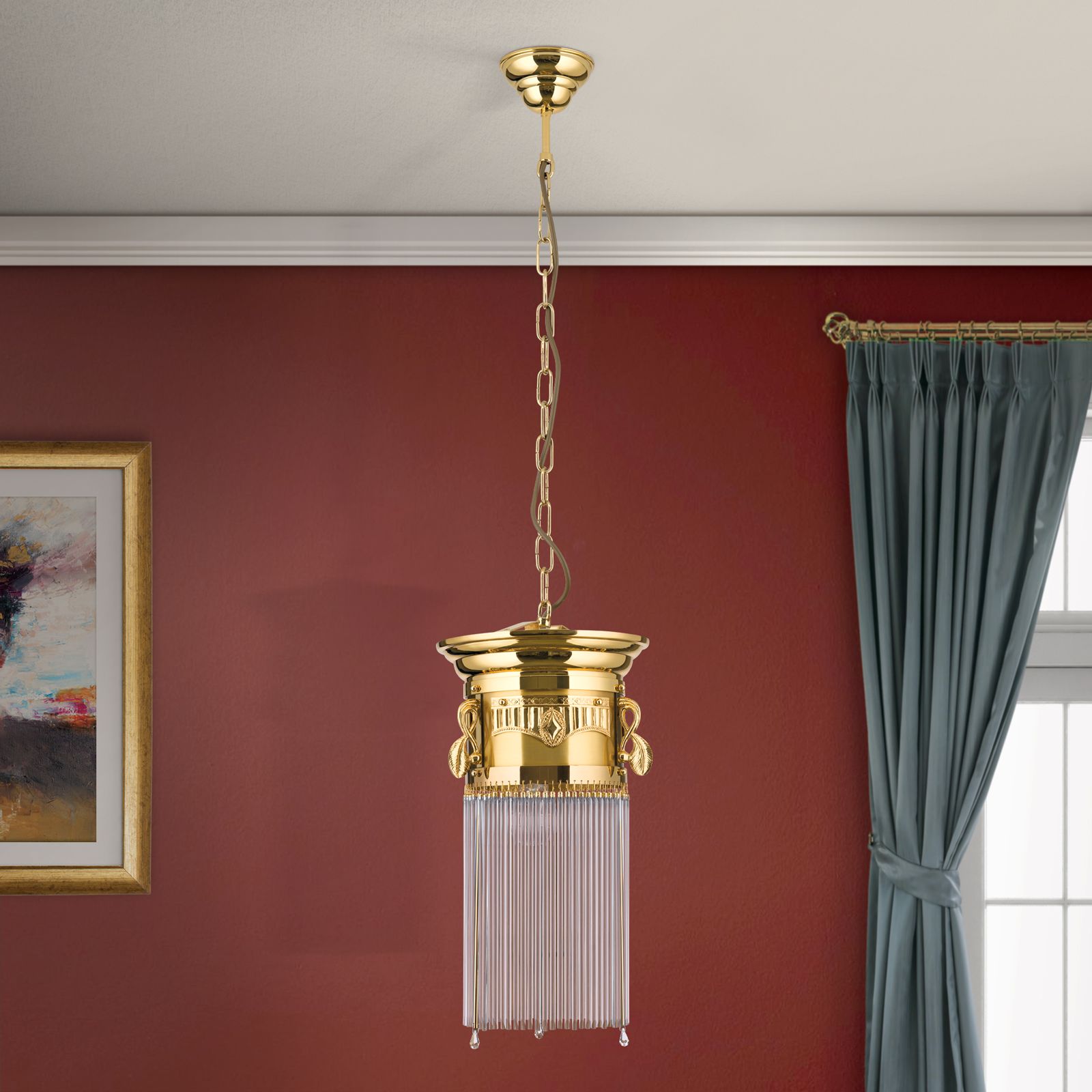 Die Hängeleuchte aus der Reihe ADELE eignet sich dank der feingliedrigen, stilvollen Gestaltung für Ensembles, die sich einer ornamentalen Schönheit verschrieben haben. Die Komposition steht im frühlingshaften Zeichen des Erblühens. Die Messingmontur zieren verschlungenen Ranken und ein kannelierter Fries. Die Vollglasstäbe sind an blütenkelchförmigen Einfassungen aufgehängt. Die Glasröhren füllen sich mit Licht und strahlen mit dem Messing um die Wette.