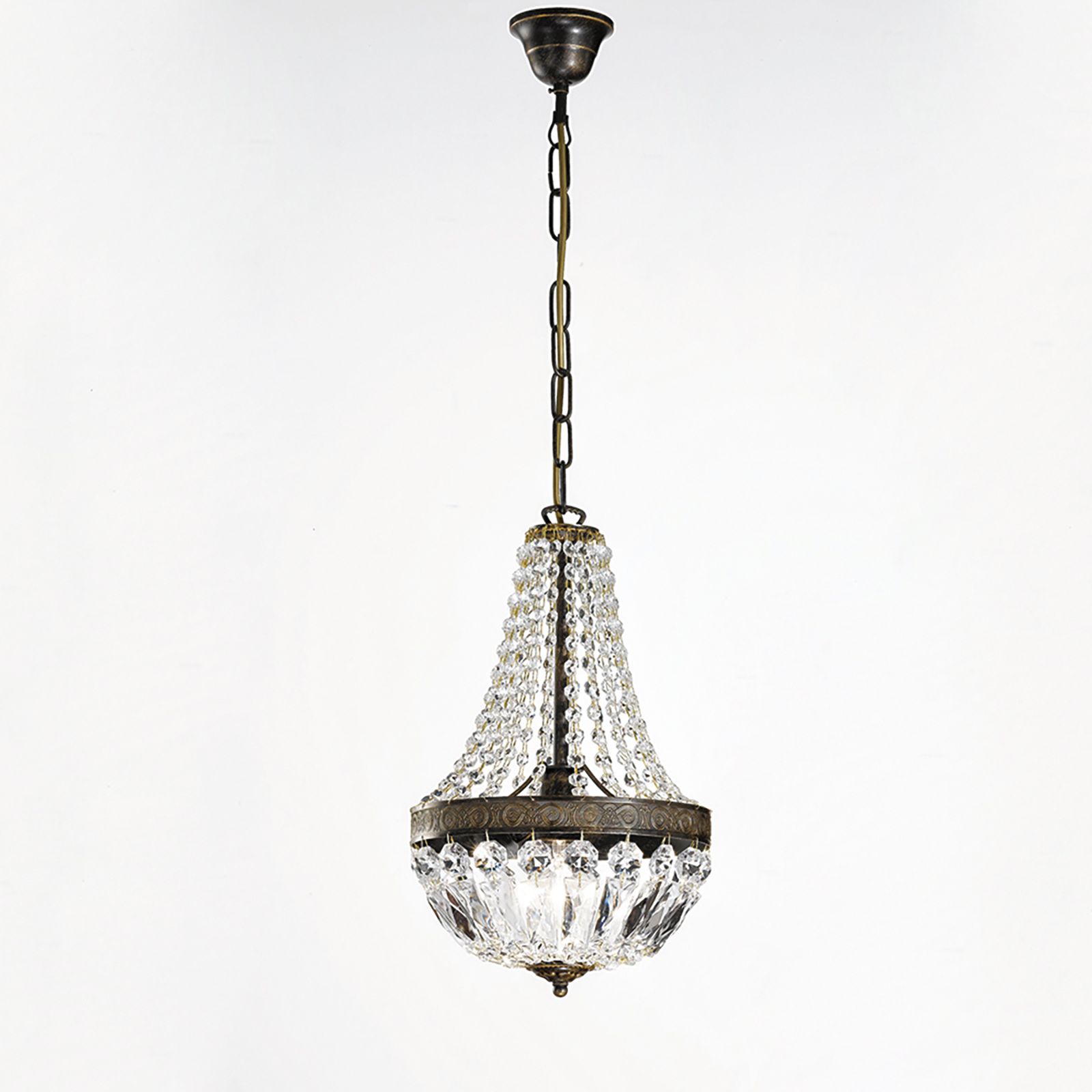 Dezent stilvoll tritt der einflammige Kristalluster der Serie ARILA auf und ist dennoch eine wahre Erscheinung. Das Highlight eines jeden Raumes besticht durch seine grazilen Glaskristalle im Kettenbehang, die in ihrer Form zu einem prunkvollen Korbluster mit französischem Flair gelangen. Nostalgischen Esprit versprühen ebenso die in antik-gold gehaltenen Metallelemente, die mit feinen Reliefornamenten versehen sind.