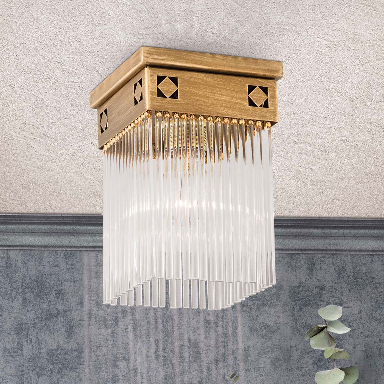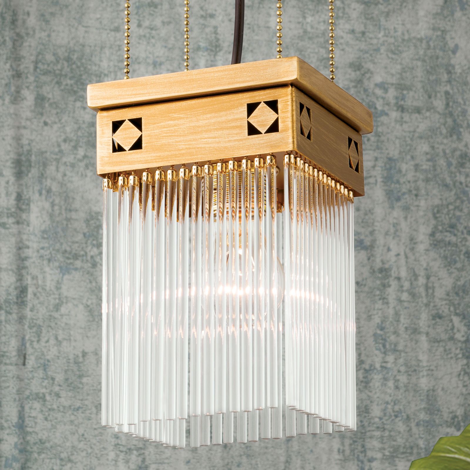 Die 1-flammige Hängeleuchte aus der Kollektion ART QUATRO bringt die elegante Klarheit des Wiener Jugendstil in die eigenen vier Wände. Viereckig, an vier Kugelketten aufgehängt, ist hier das Gestaltungsthema eindeutig die Zahl Vier. Dazu kommt die vierkantige Raute als Ornament. Durch die Abhängung eignet sich die Leuchte für höhere Räume. Für niedrigere Räume ist eine Montage ohne Sockel und Hängeelement vorgesehen. Das Licht einer Lampe in einer E27-Fassung für bis zu 60 Watt wird durch die Glasstäbchen gebündelt und als Strahlenkranz in den Raum geworfen. In einem Vorzimmer oder als Lichtakzent über einem eleganten Möbel oder Dekoobjekt wird man eine behagliche Atmosphäre schaffen.