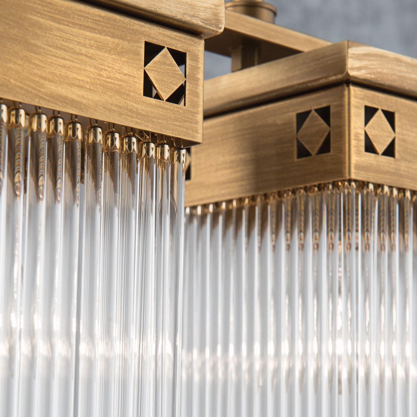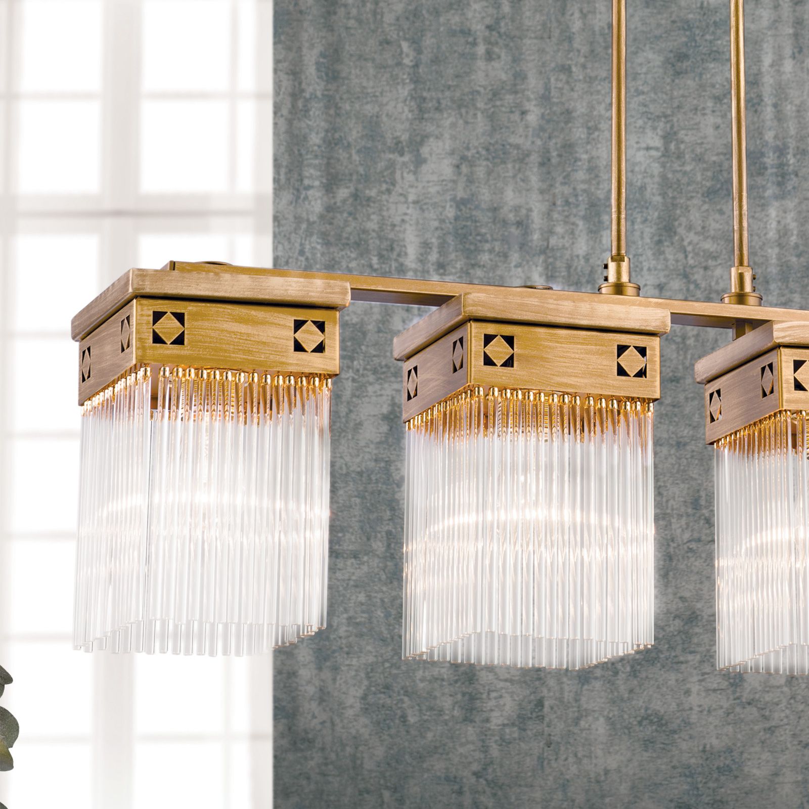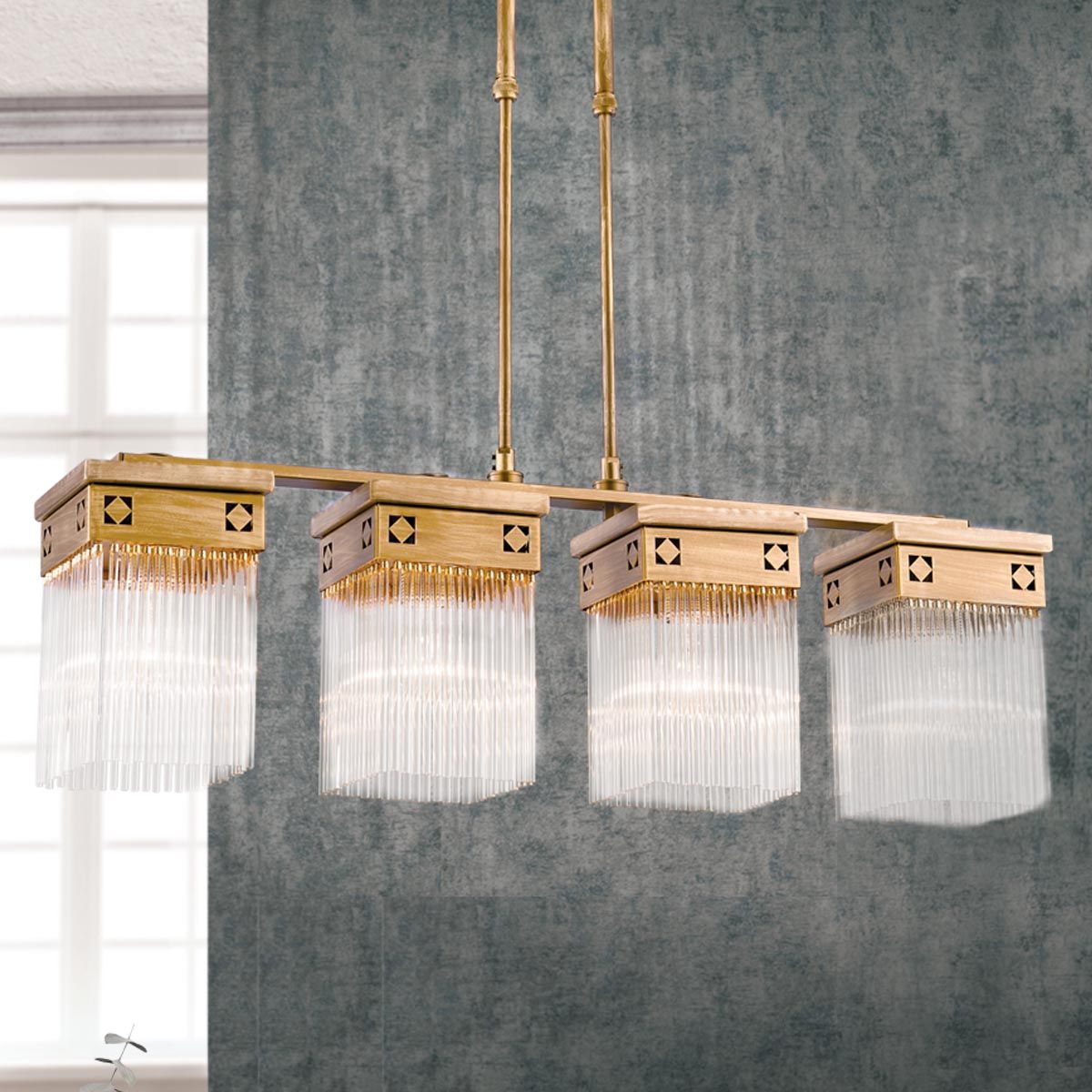 Der Wiener Secessionsstil setzt neben seiner unwiderstehlichen Freude an der Verzierung auf klare geometrische Formen. Die Serie ART QUATRO verschreibt sich voll und ganz diesem Charakteristikum. Der Korpus der 5-flammigen Hängeleuchte besteht mit Ausnahme der Rundstäbe des Doppelschafts konsequent aus rechteckigen Formen. Selbst die dezenten Zierrauten sind auf den Spitzen stehende Quadrate. Die Anordnung der Flammen mit einem einzelnen Lichtakzent am Plafond und einer rund 70 Zentimeter tiefer liegenden Viererreihe prädestiniert den Luster für eine Montage über einem Esstisch, in einem Besprechungsraum und natürlich als Hauptleuchte in einem Wohnzimmer. Die Hängeleuchte ist mit fünf E27-Fassungen für je bis zu 60 Watt bestückt.