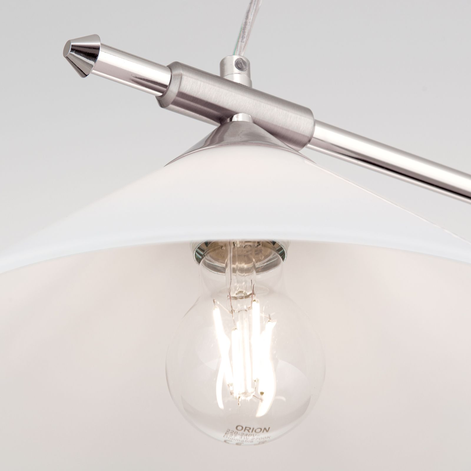 Die konischen Kegelgläser sind an einer pfeilförmigen, horizontalen Vollmessingstange montiert und sorgen für eine weiche Streuung des Lichts. Sie eigent sich hervorragen als Esszimmerbeleuchtung über dem Familientisch.
