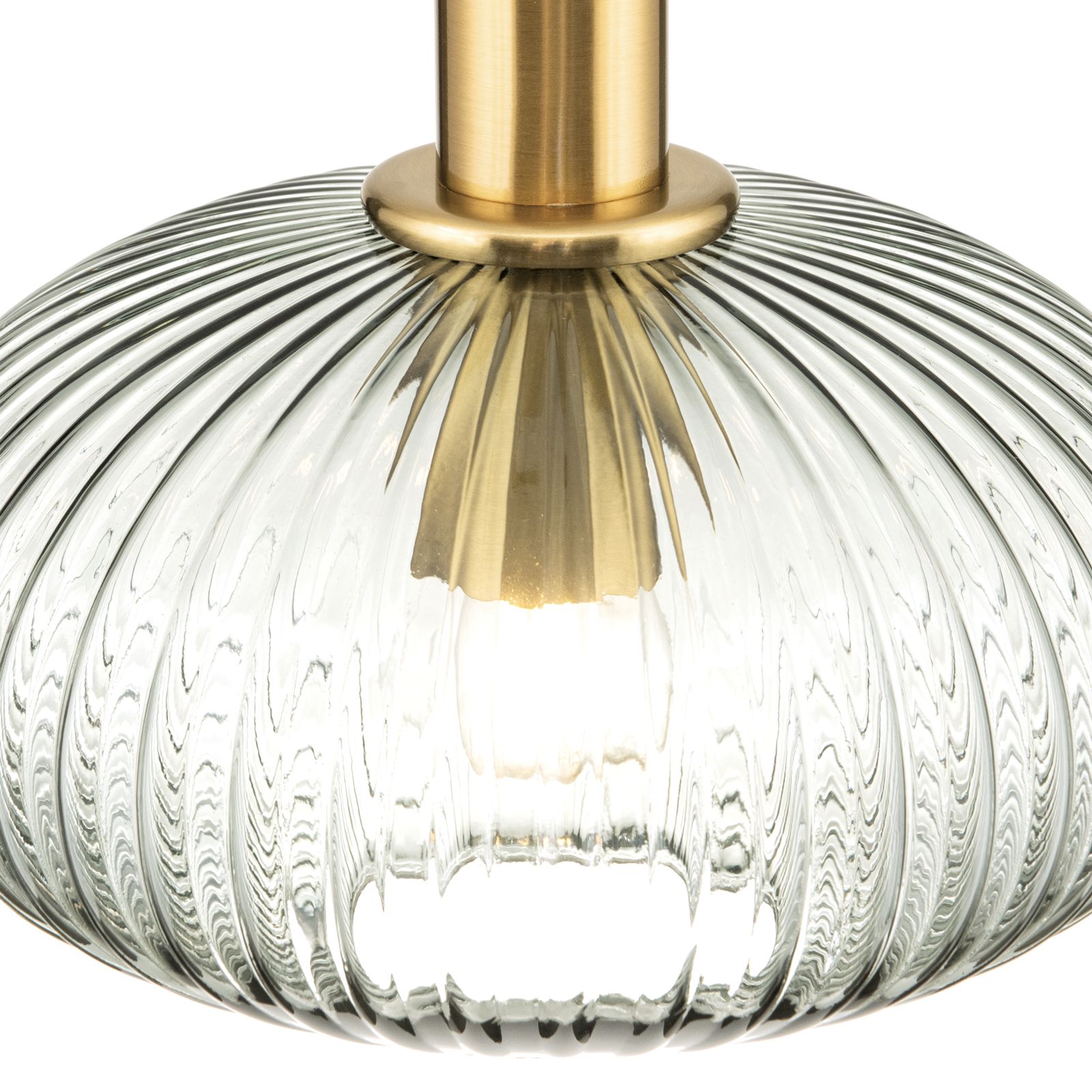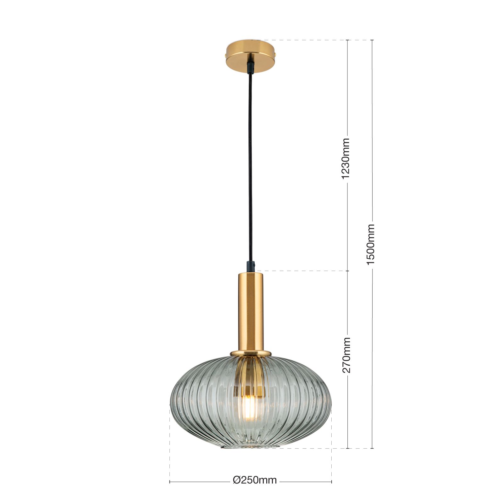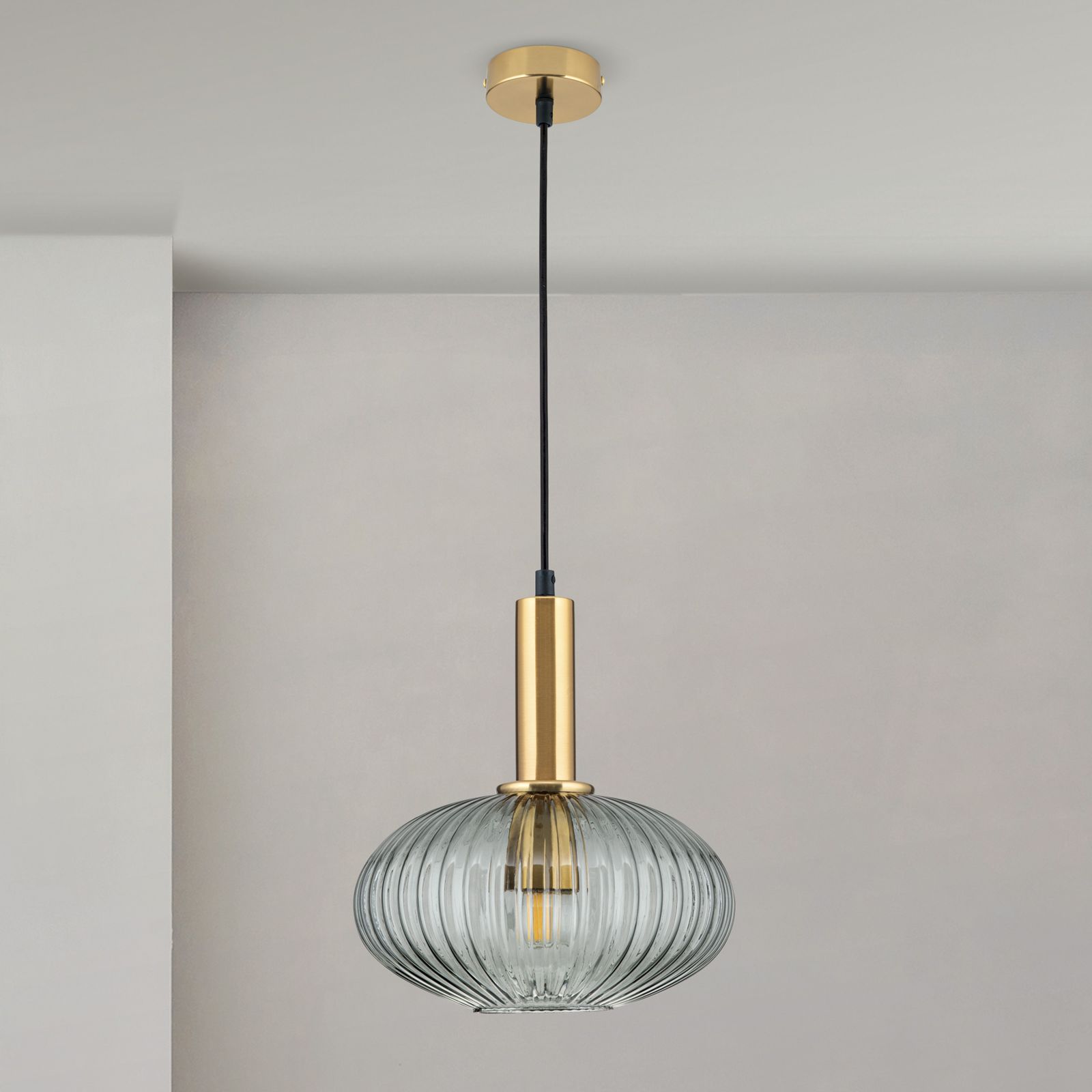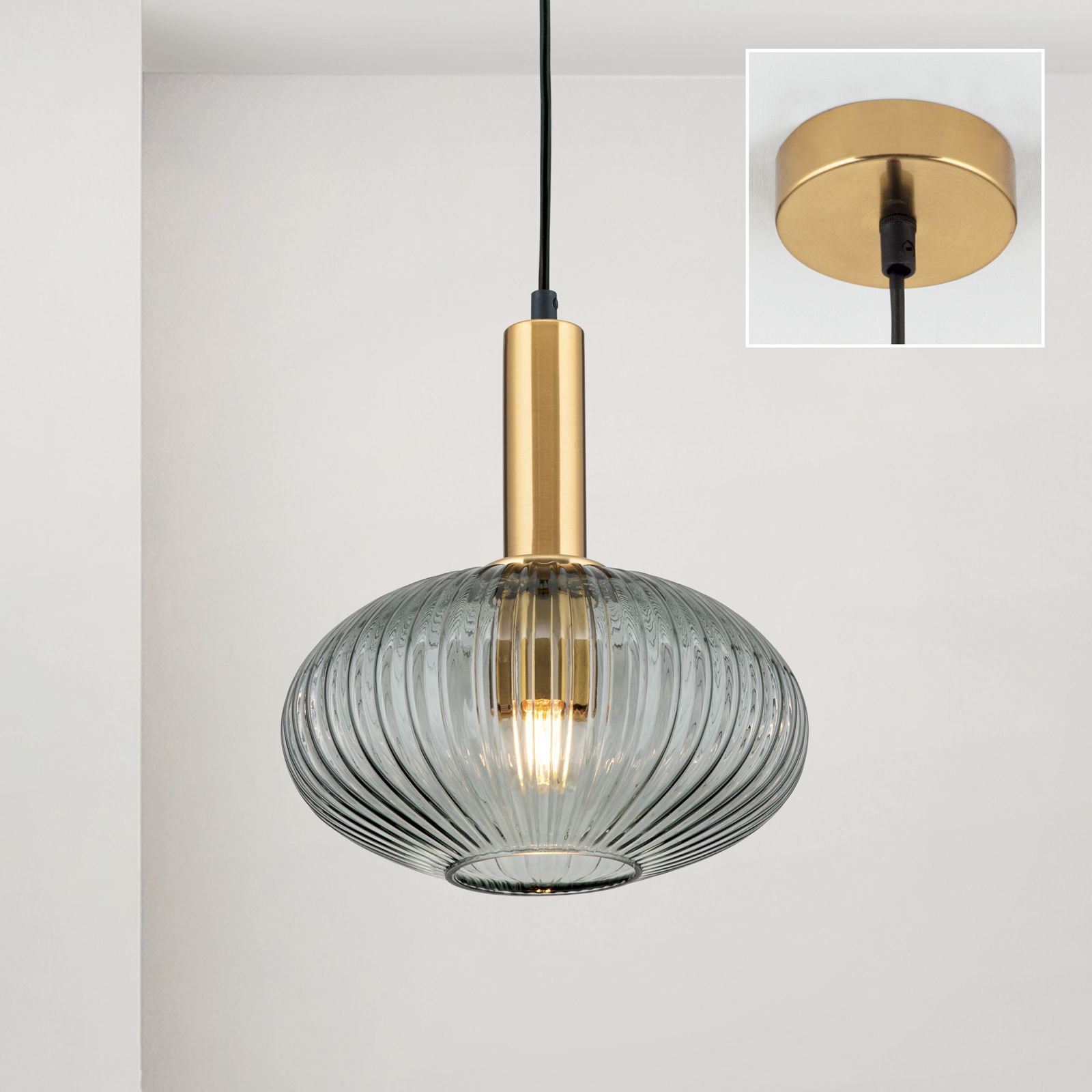 Der Lampenschirm aus rauchfarbenem Glas beeindruckt durch sein einzigartiges Rillendekor, das ein faszinierendes Spiel von Licht und Schatten erzeugt. Die raffinierte Struktur des Glases verleiht der Leuchte eine besondere Tiefe und Eleganz. Die Rosette und der Körper der Leuchte sind in edlem Patina-Finish gehalten, was einen charmanten Vintage-Look erzeugt. Die Patina-Farben verleihen der Hängeleuchte einen Hauch von Nostalgie und passen perfekt zu verschiedenen Einrichtungsstilen. Das schwarze Textilkabel unterstreicht den modernen Aspekt des Designs und bietet gleichzeitig Flexibilität und Haltbarkeit. Das Kabel fügt sich harmonisch in das Gesamtbild der Leuchte ein.