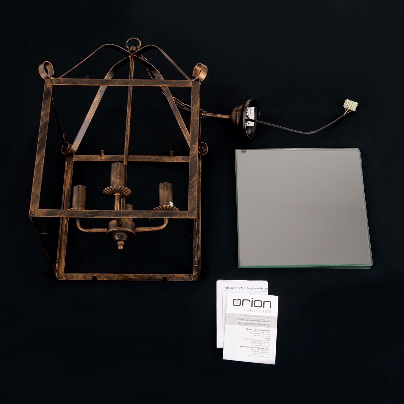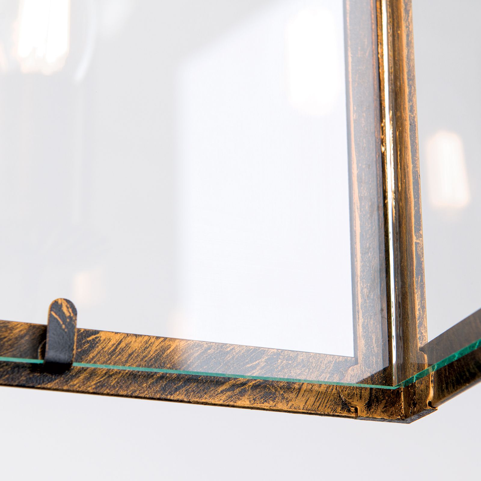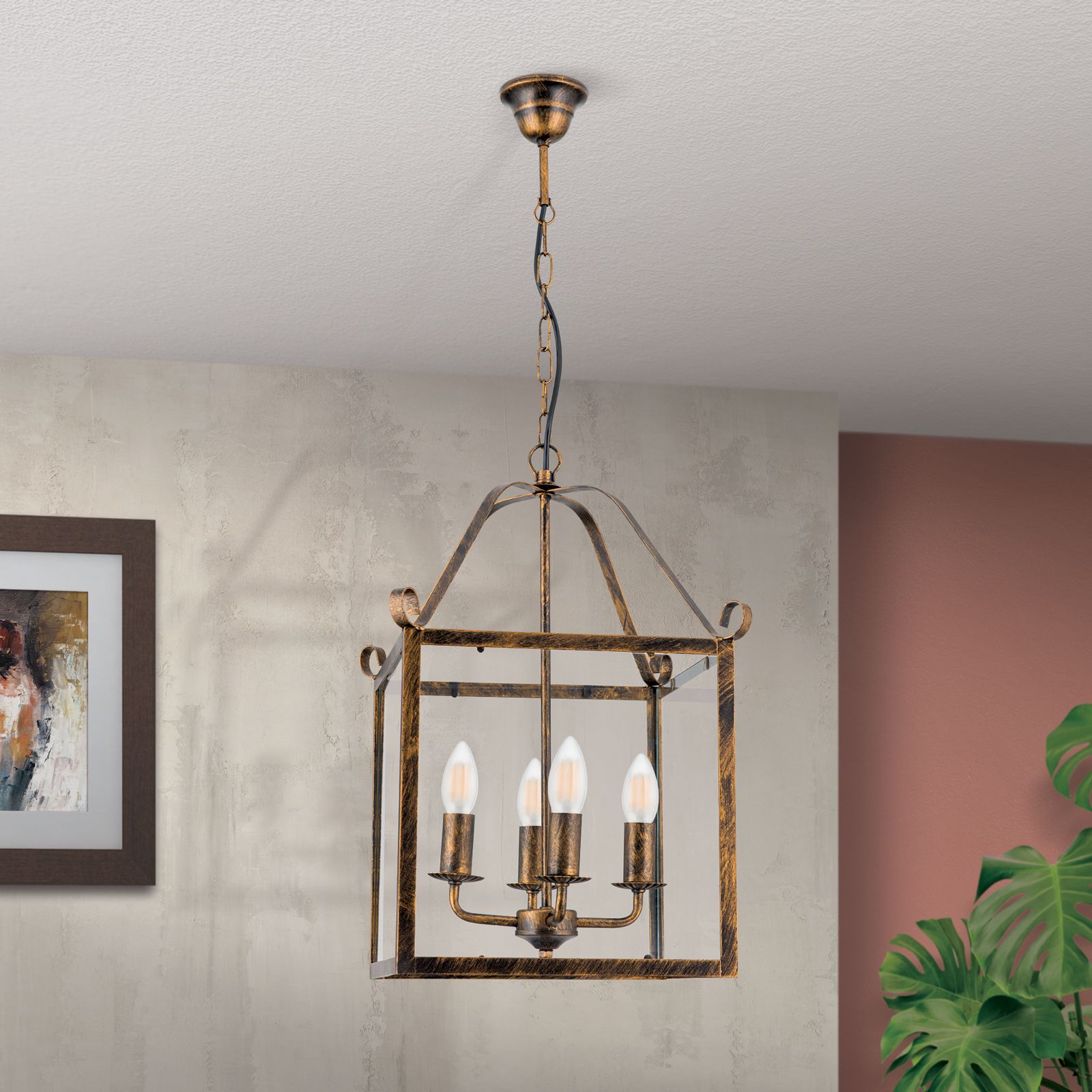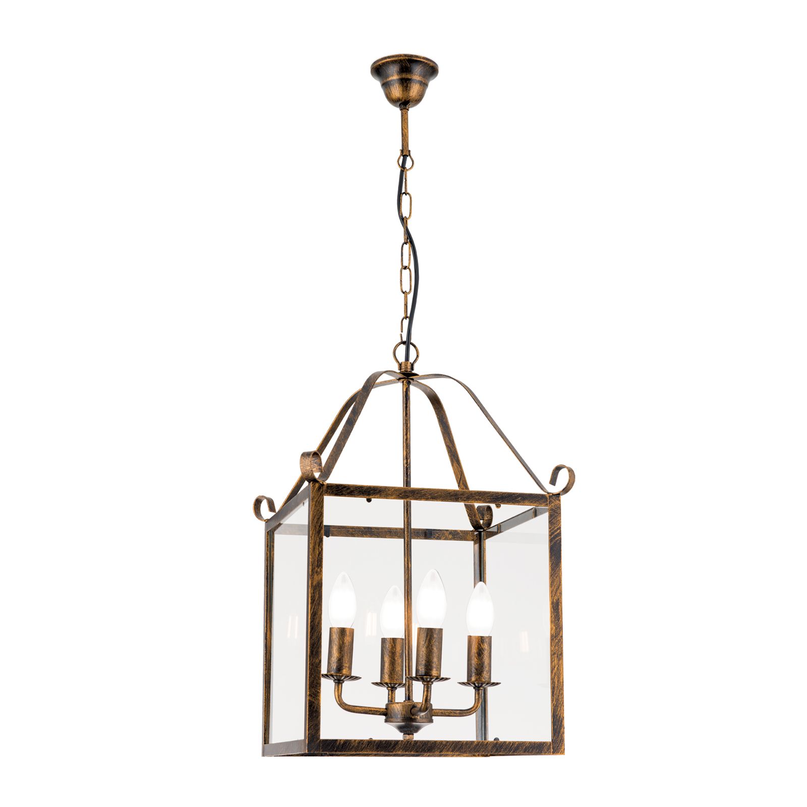 Die 4-flammige Hängeleuchte FRANCO überzeugt mit einer klassisch eckigen Laternenform im Vintage Look. Das antik golden lackierte Gestell ist mit einer künstlichen Patina versehen, um den rustikalen Stil zu unterstreichen. Verspielte Bögen an der Aufhängung bringen etwas Bewegung ins Design. Hinter den klaren Glasscheiben wird das Leuchtmittel besonders auffallend in Szene gesetzt.
