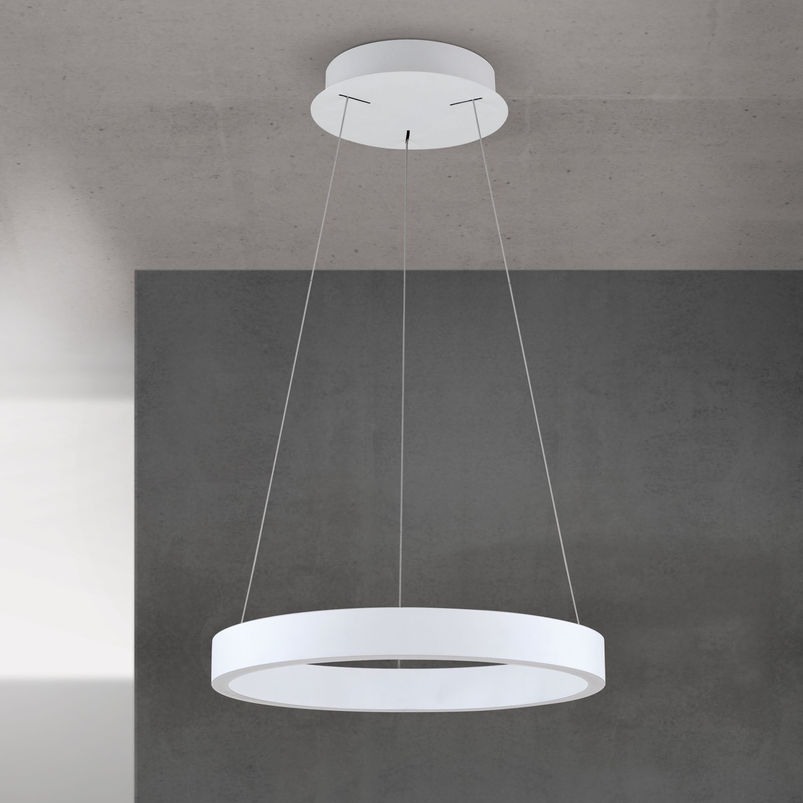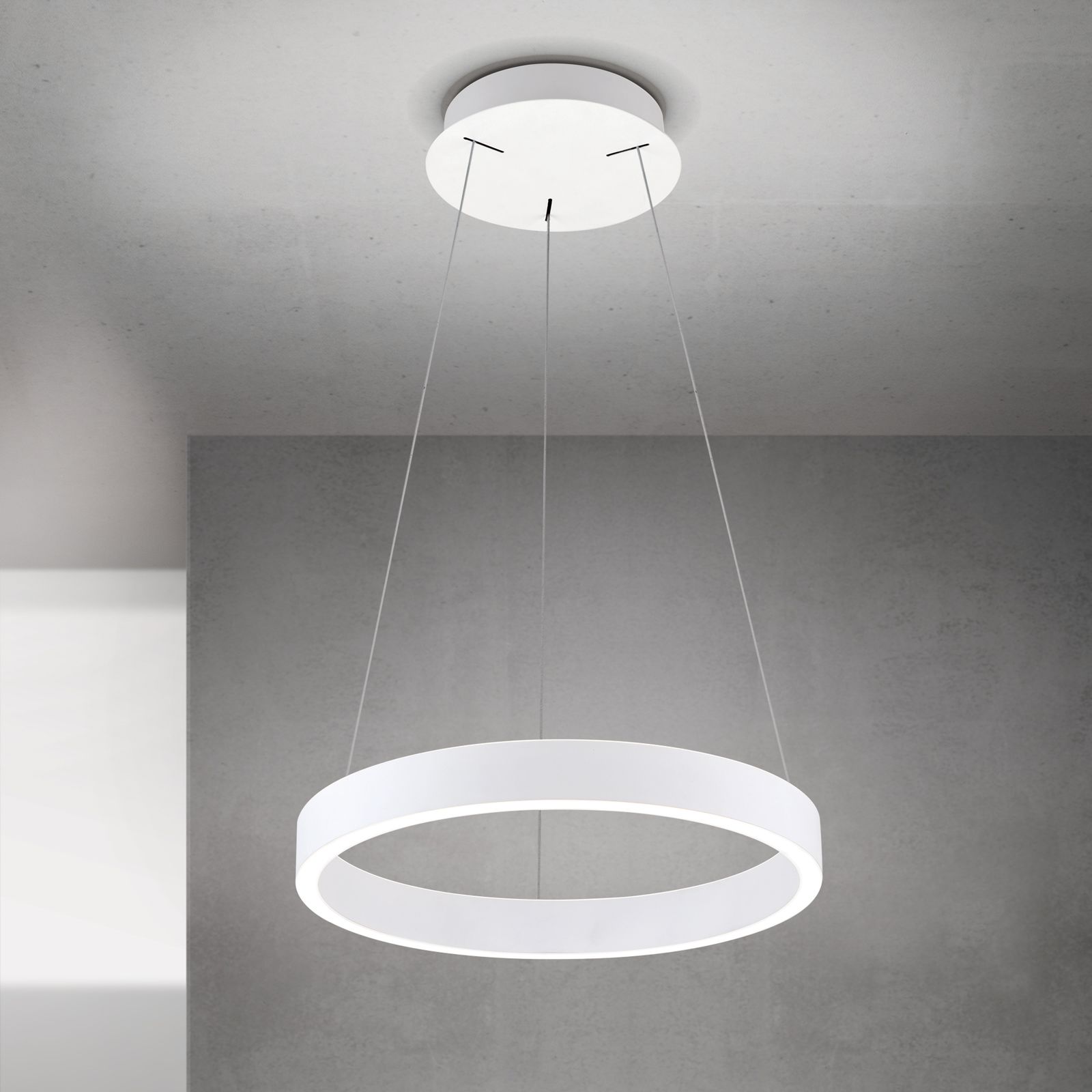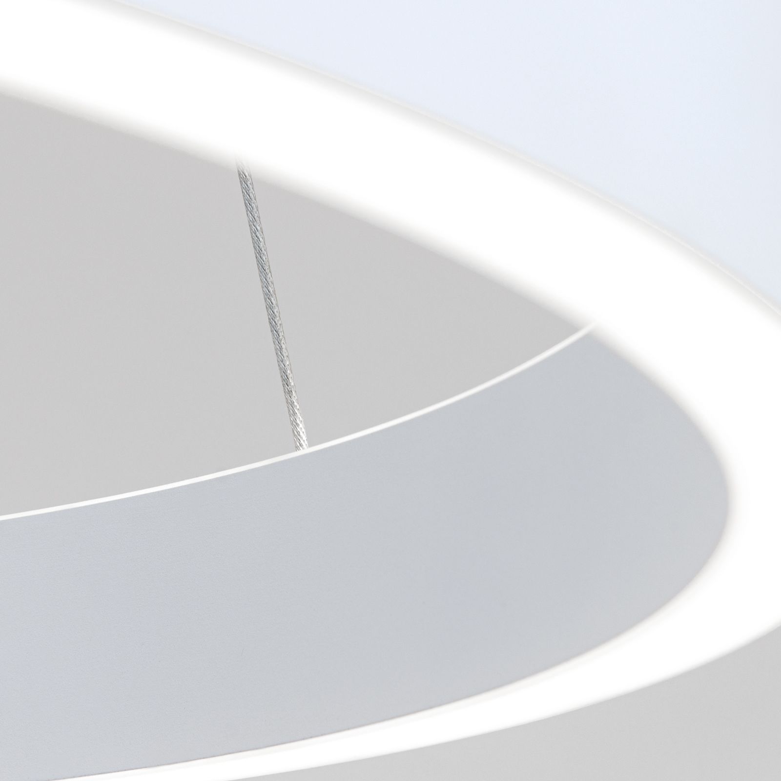 Das moderne Design wird durch eine dezente Rosette und drei filigrane Stahlseile ergänzt, die den Aluminiumring mit den verbauten LEDs halten. Dieses durchdachte Konzept sorgt nicht nur für eine optimale Ausleuchtung, sondern verleiht der Leuchte auch eine schwebende Leichtigkeit.