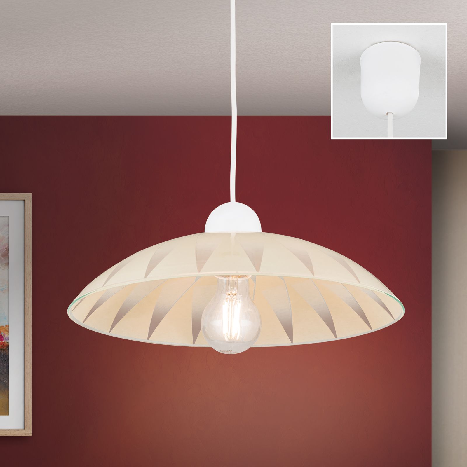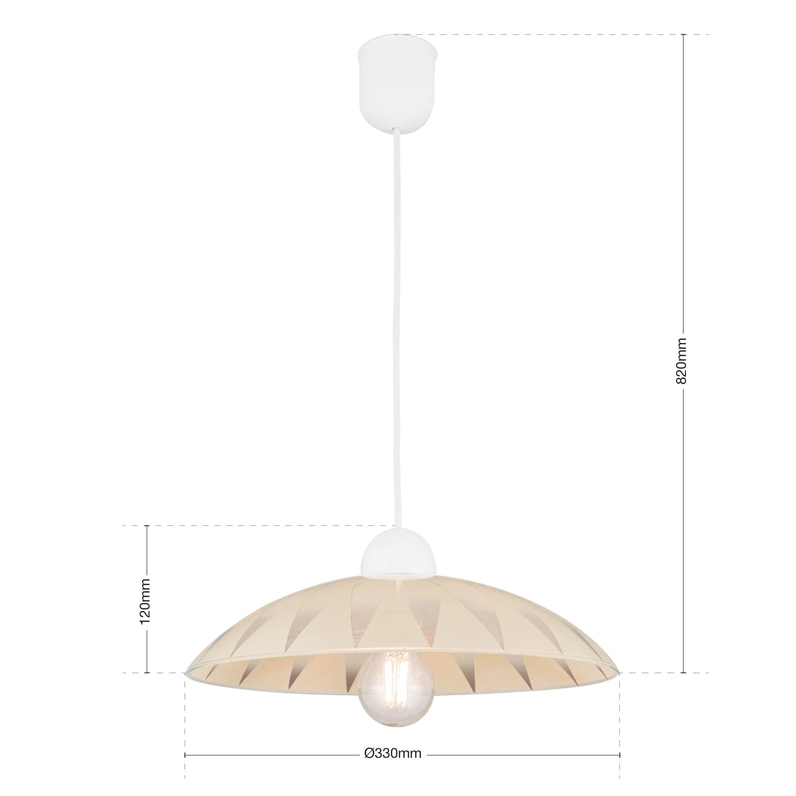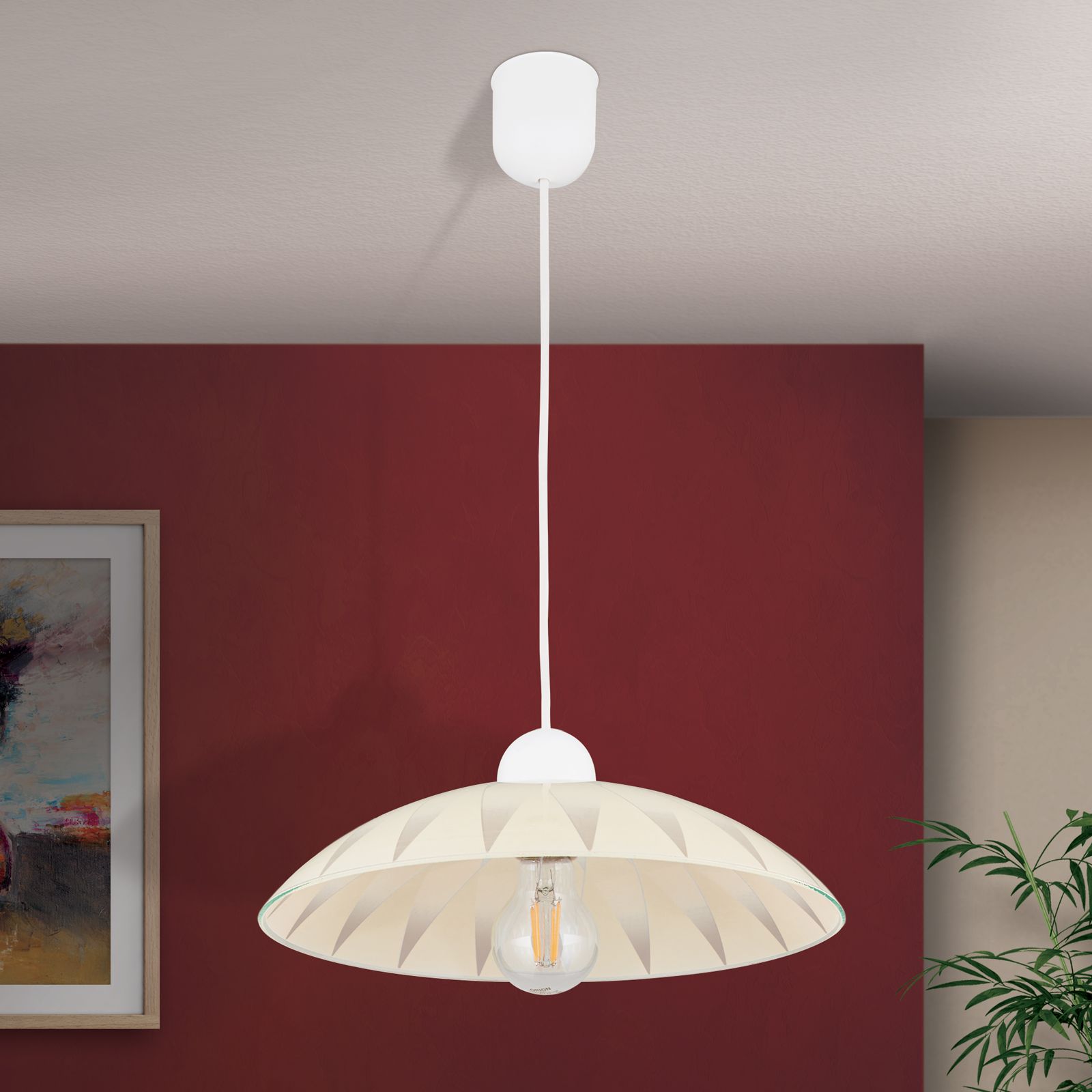 Die Hängeleuchte MARTINA punktet mit ihrem modernen Design und eignet sich als Esstischbeleuchtung ebenso wie für Schlafzimmer oder den Eingangsbereich. Durch die große Öffnung strahlt das Licht großflächig ab und leuchtet den Raum optimal aus. Mit ihrem Opalglasschirm, der wahlweise in Weiß, Beige, Violett erhältlich ist, und den klaren Aussparungen sorgt sie für ein außergewöhnliches Lichterlebnis und macht die Leuchte zu einem Highlight. Die Lichtintensität lässt sich wunderbar in Kombination mit einem Dimmer regeln. Die Hängeleuchte ist mit einer E27-Fassung ausgestattet und kann mit maximal 60 Watt bestückt werden. Wird sie mit sparsamen LED-Lampen betrieben, ist sie die ideale Wahl für eine energieeffiziente Esszimmerbeleuchtung.